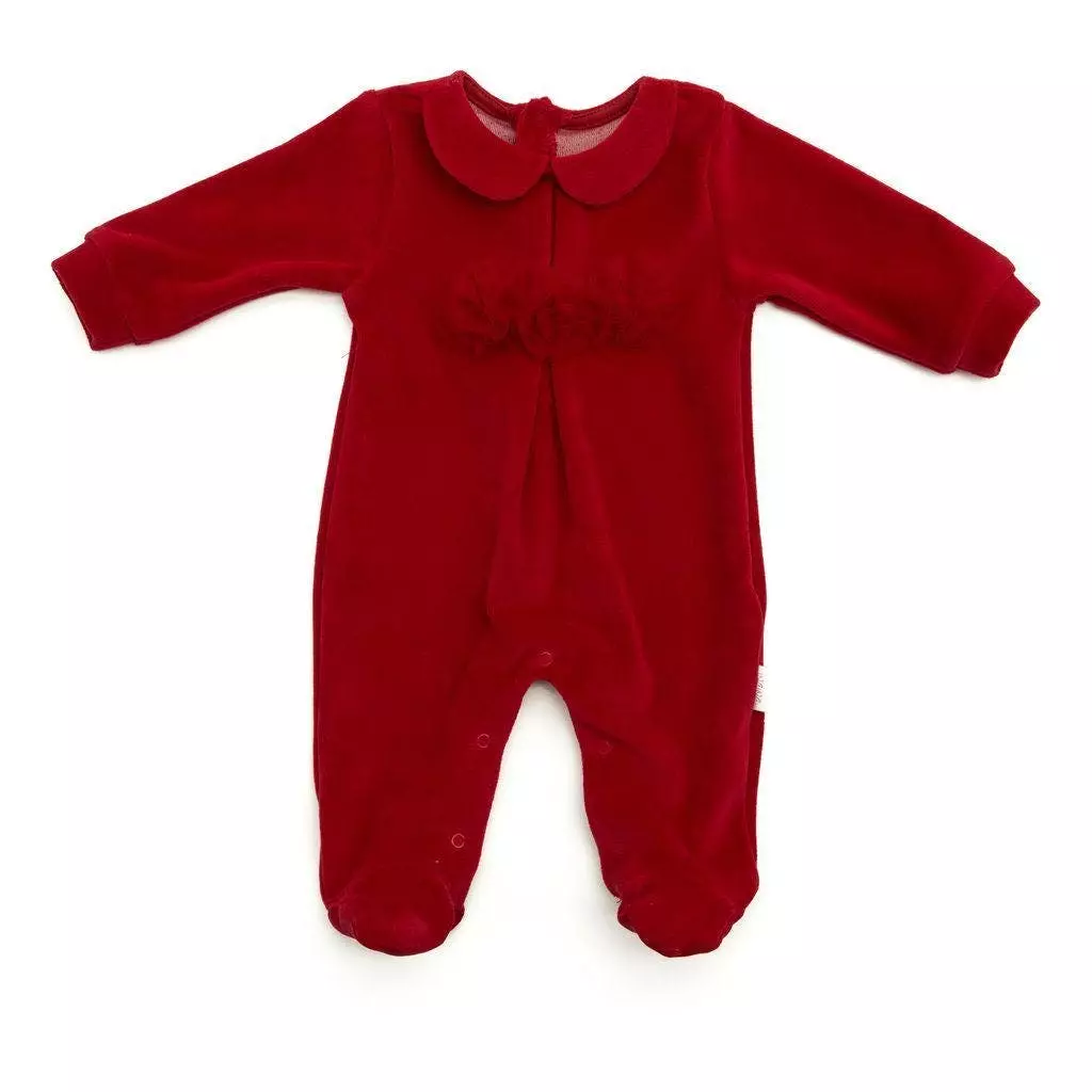 Red overall romper for newborns and baby girls from Andy Wawa, featuring ” New Years” theme and three red flowers on the front as the decoration. Perfect choice for New Year Holiday dress-up. Made of soft fabric, it is comfortable for little ones to wear.
