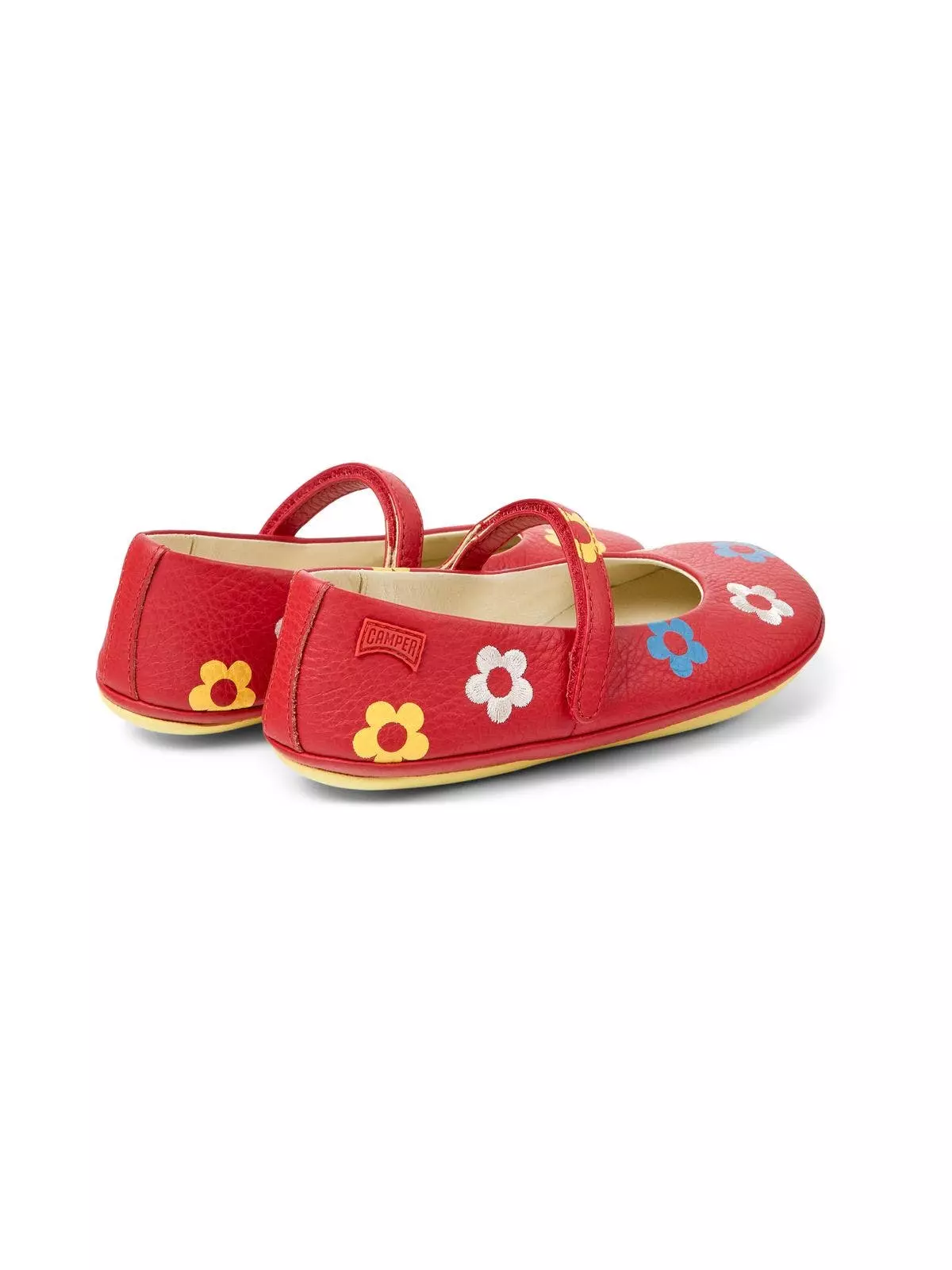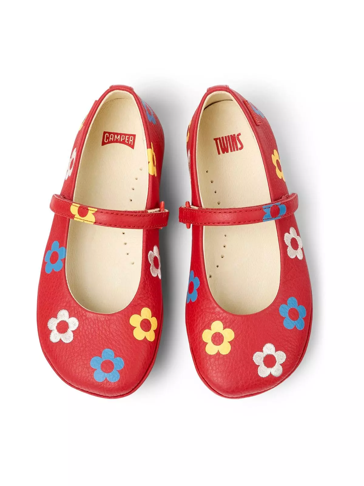 Red leather kid’s ballerinas with flower motif, removable EVA footbeds, and rubber outsoles (20% recycled). Born in 1988, this classic Twins concept — opposite yet complementary – challenges the idea that shoes must be identical and lives on in these mismatched kid’s shoes to form a truly unique pair.
