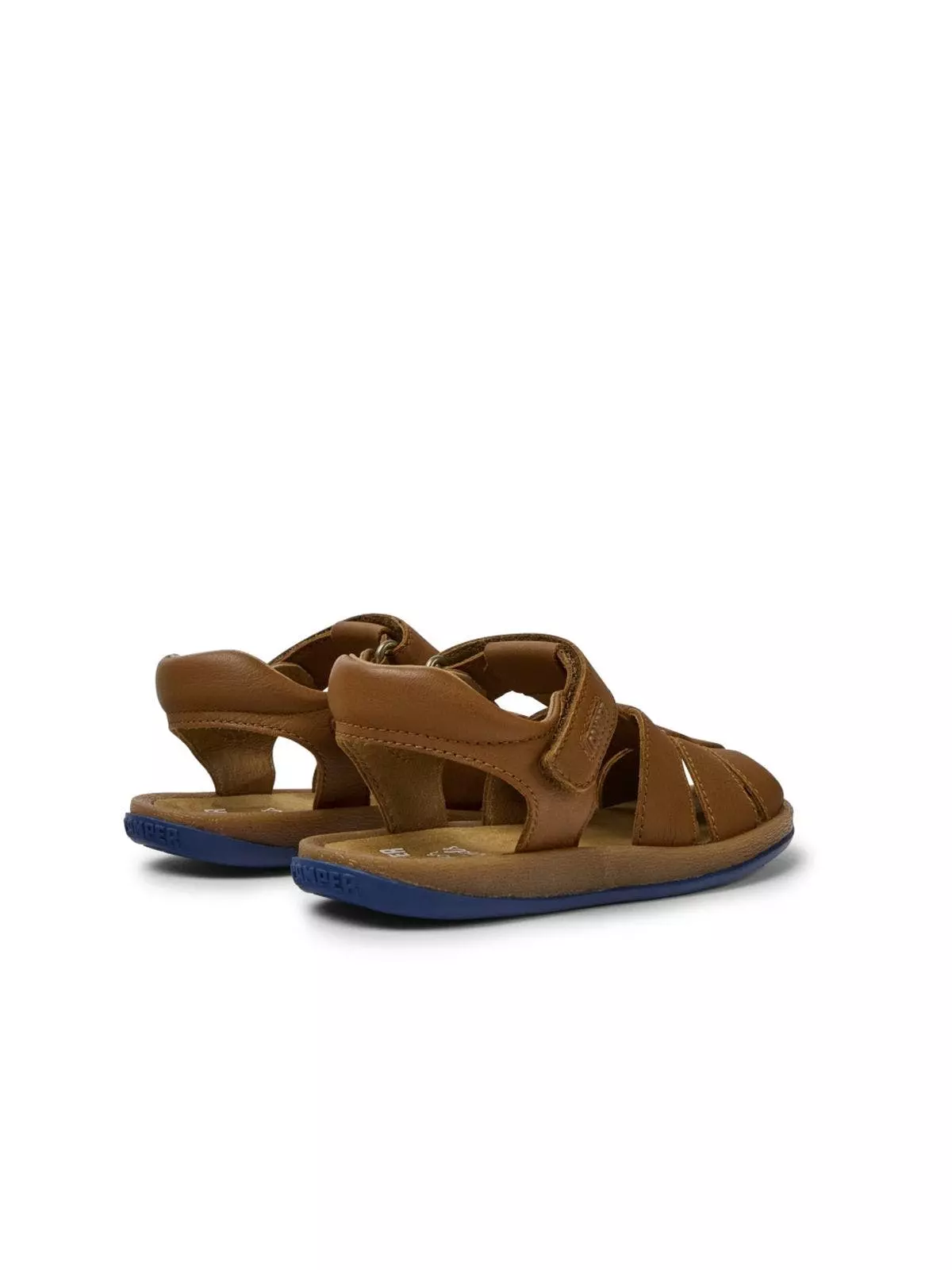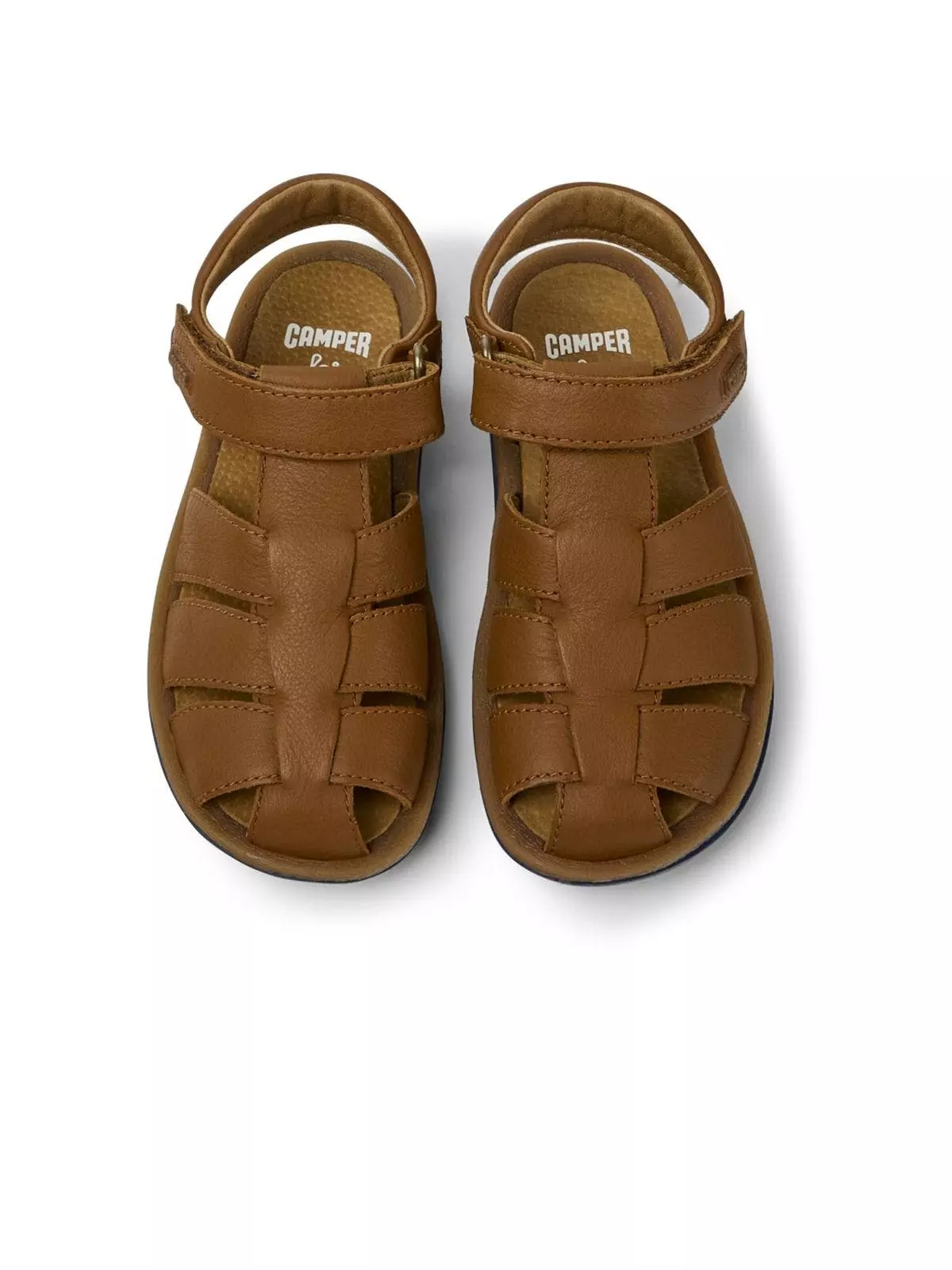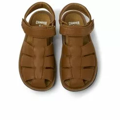 Brown leather kids’ sandals with hook-and-loop closing system and 100% rubber outsoles (20% recycled). Bicho offers a playful twist on the classic sandal, fusing better materials with pops of color, ergonomic design, and easy-fit fastenings.
