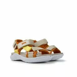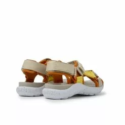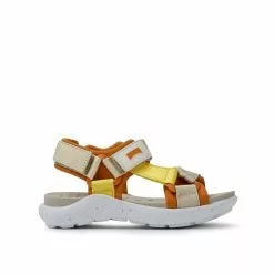 Yellow, orange, and beige coffee yarn kid’s sandals with recycled PET webbing, hook-and-loop closing system, and 100% rubber outsoles (20% recycled). This Wous sandal, built with recycled and natural materials, offers a technical look and all-day comfort for active boys and girls.