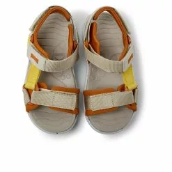 Yellow, orange, and beige coffee yarn kid’s sandals with recycled PET webbing, hook-and-loop closing system, and 100% rubber outsoles (20% recycled). This Wous sandal, built with recycled and natural materials, offers a technical look and all-day comfort for active boys and girls.