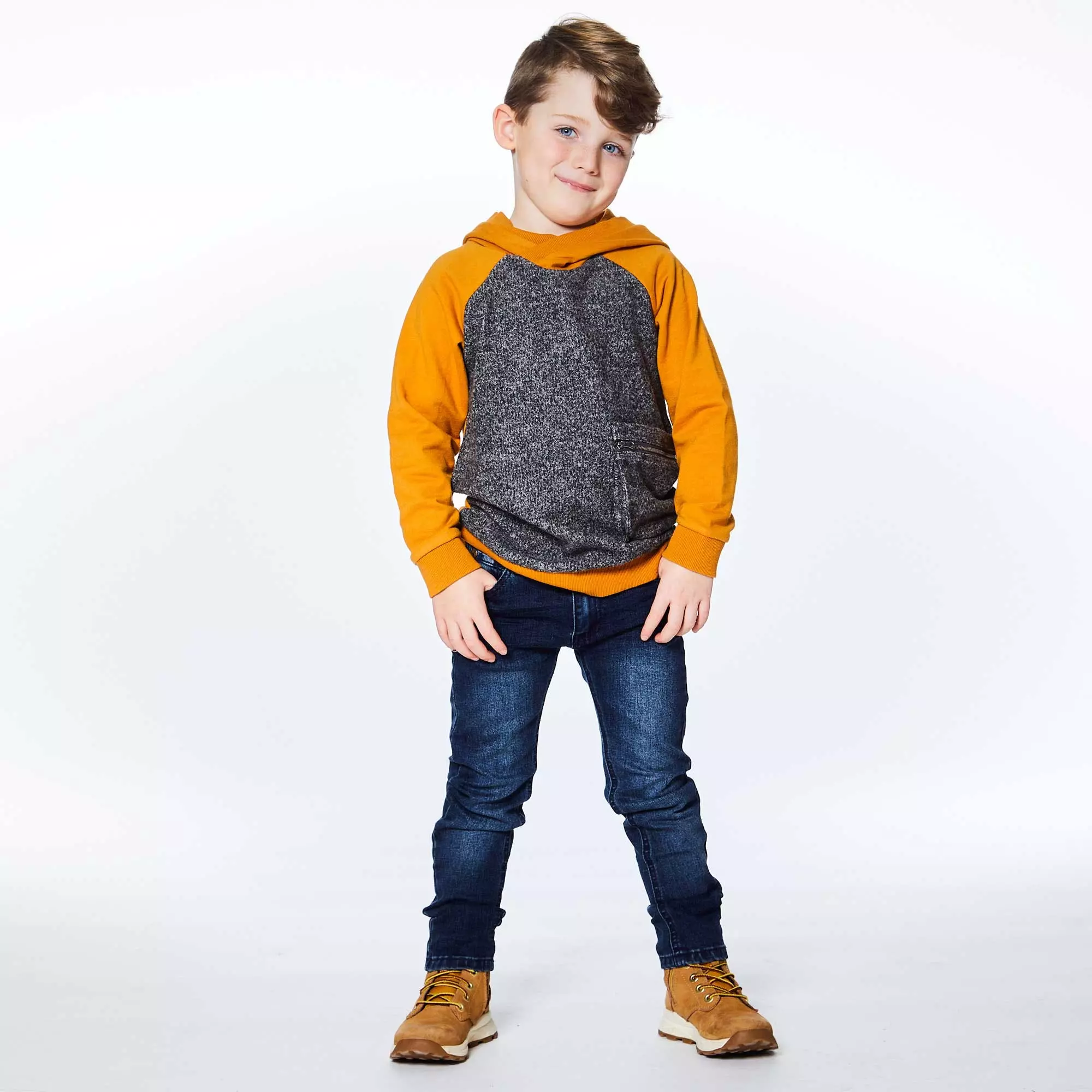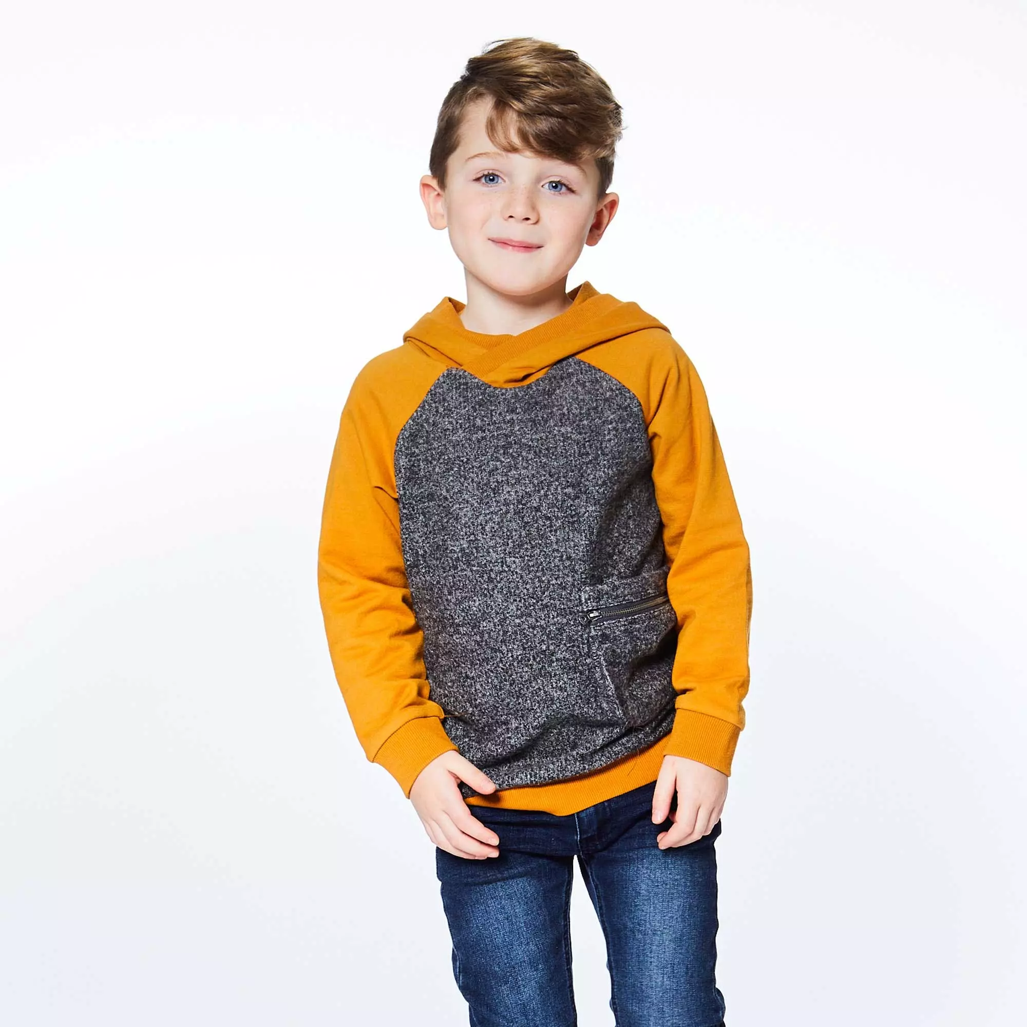 Make chilly days more sporty and more stylish with the Hooded Fleece Top With Zipper Pocket Brown and Dark Grey. This pullover sweatshirt features contrast long raglan sleeves, a contrast hood, and a zipper pocket on the front.
