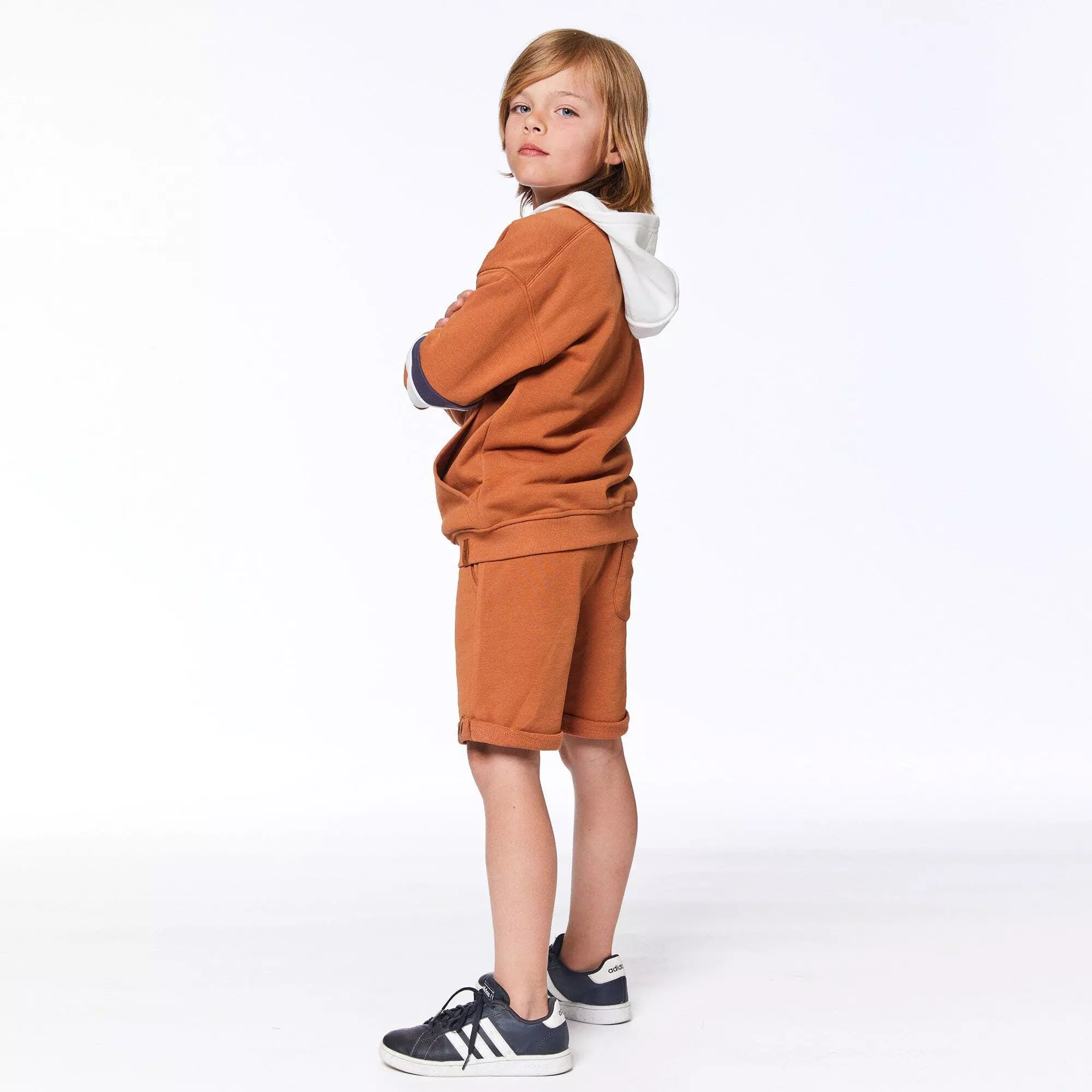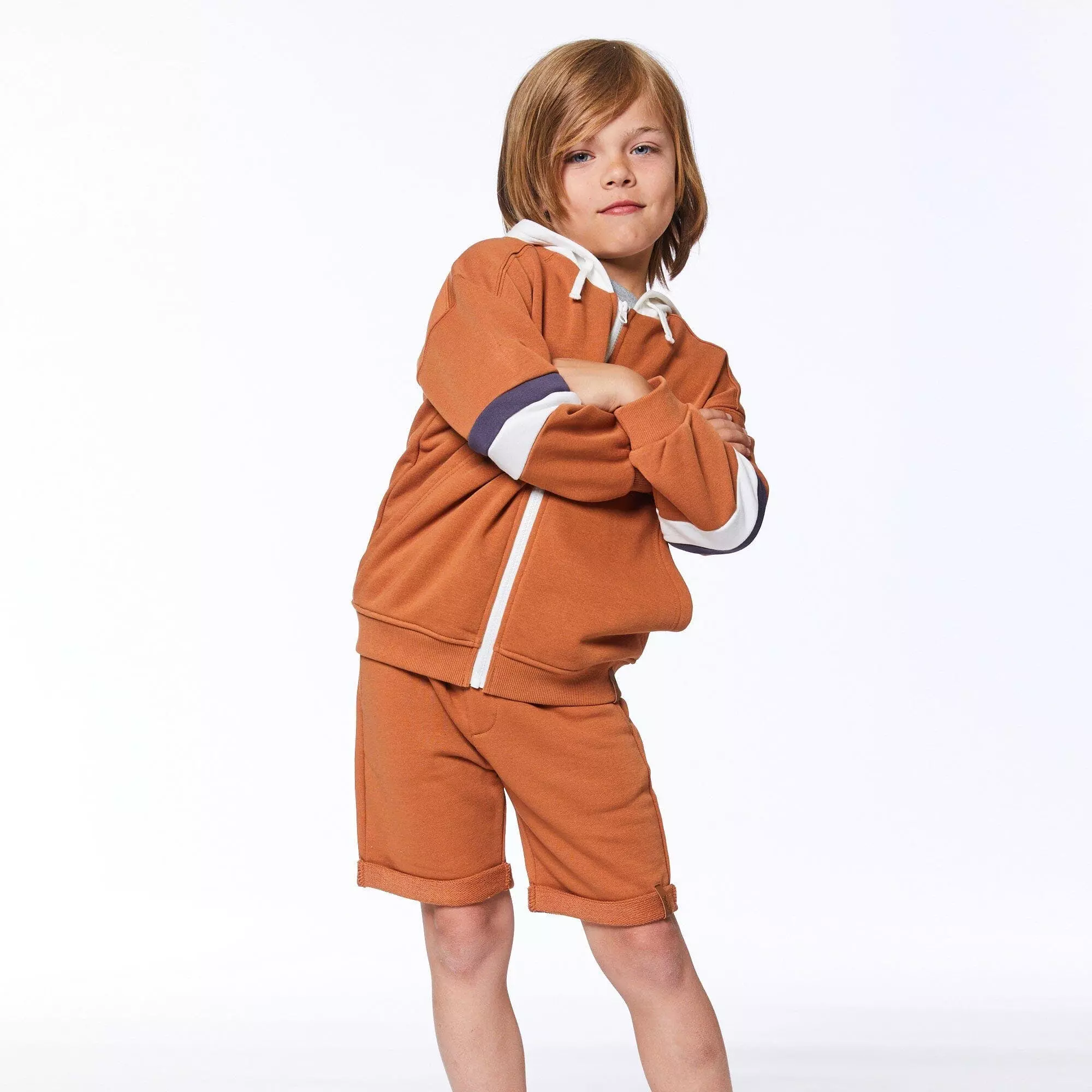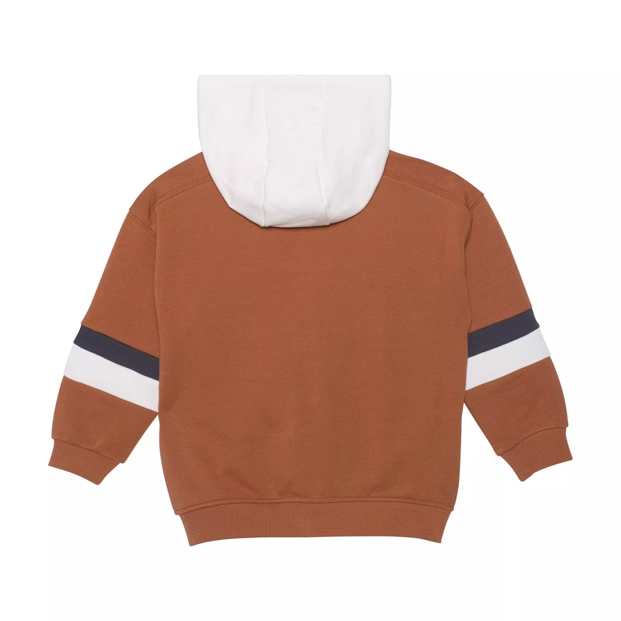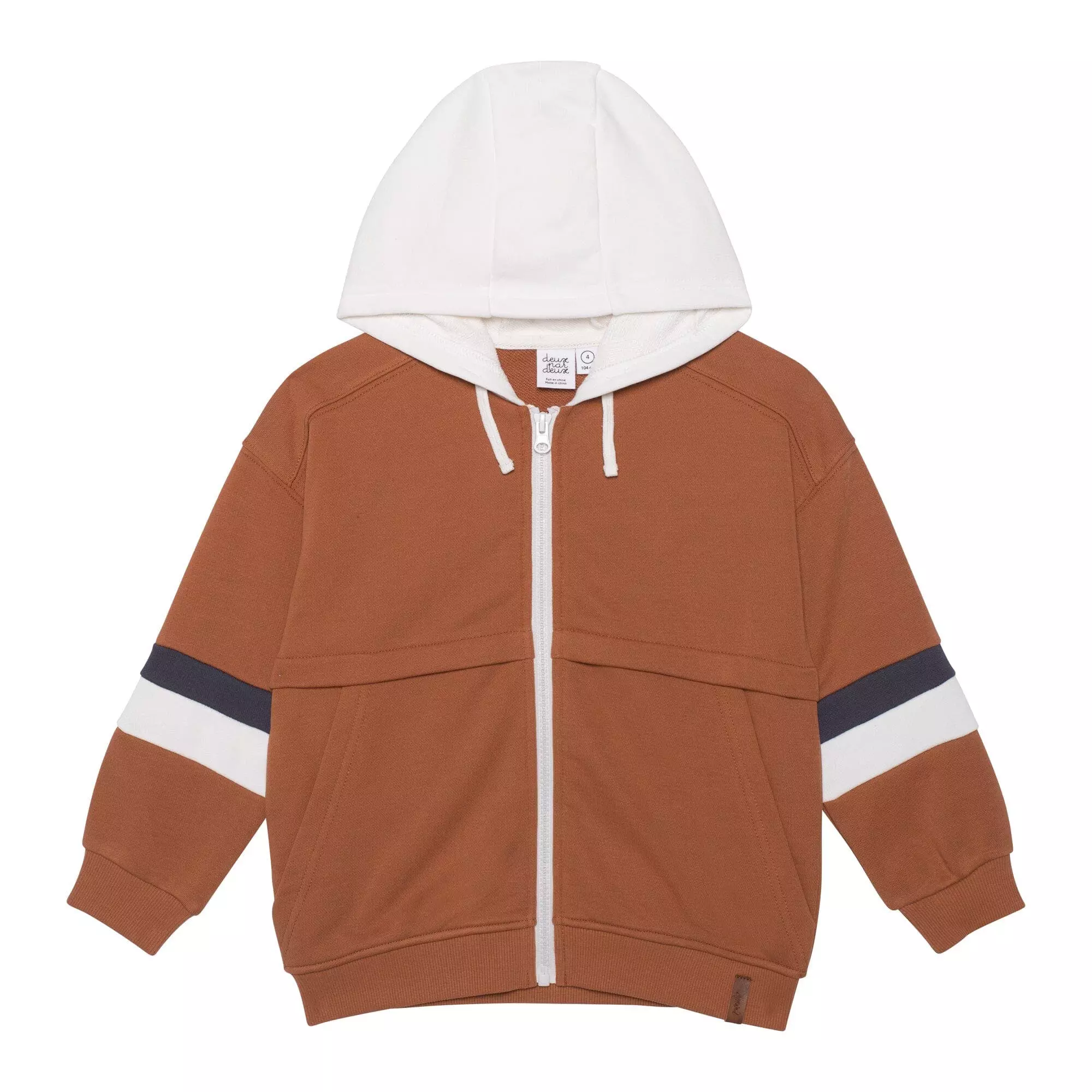 Contrast sleeve bands add sporty attitude to this Hooded French Terry Cardigan Caramel. This zip front sweatshirt features long sleeves, a contrast hood and slant pockets. It’s the perfect layering piece for a chilly spring day or a cool summer night.