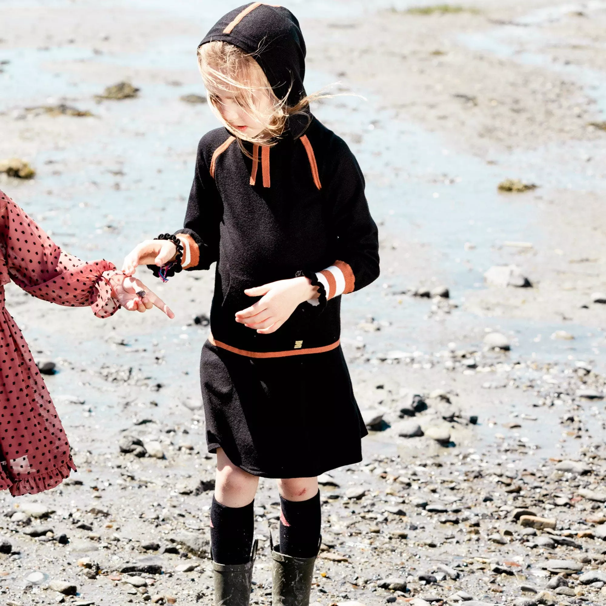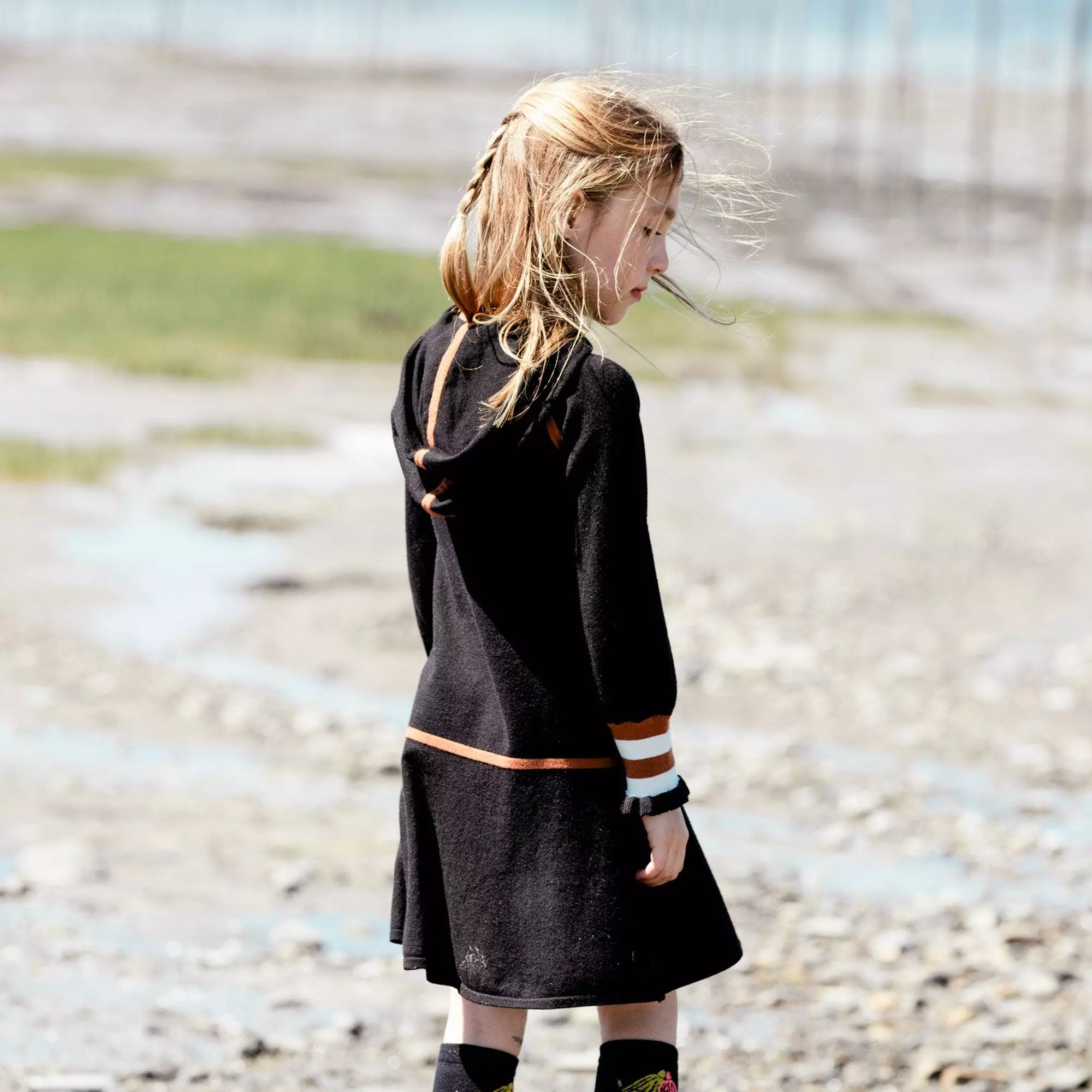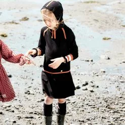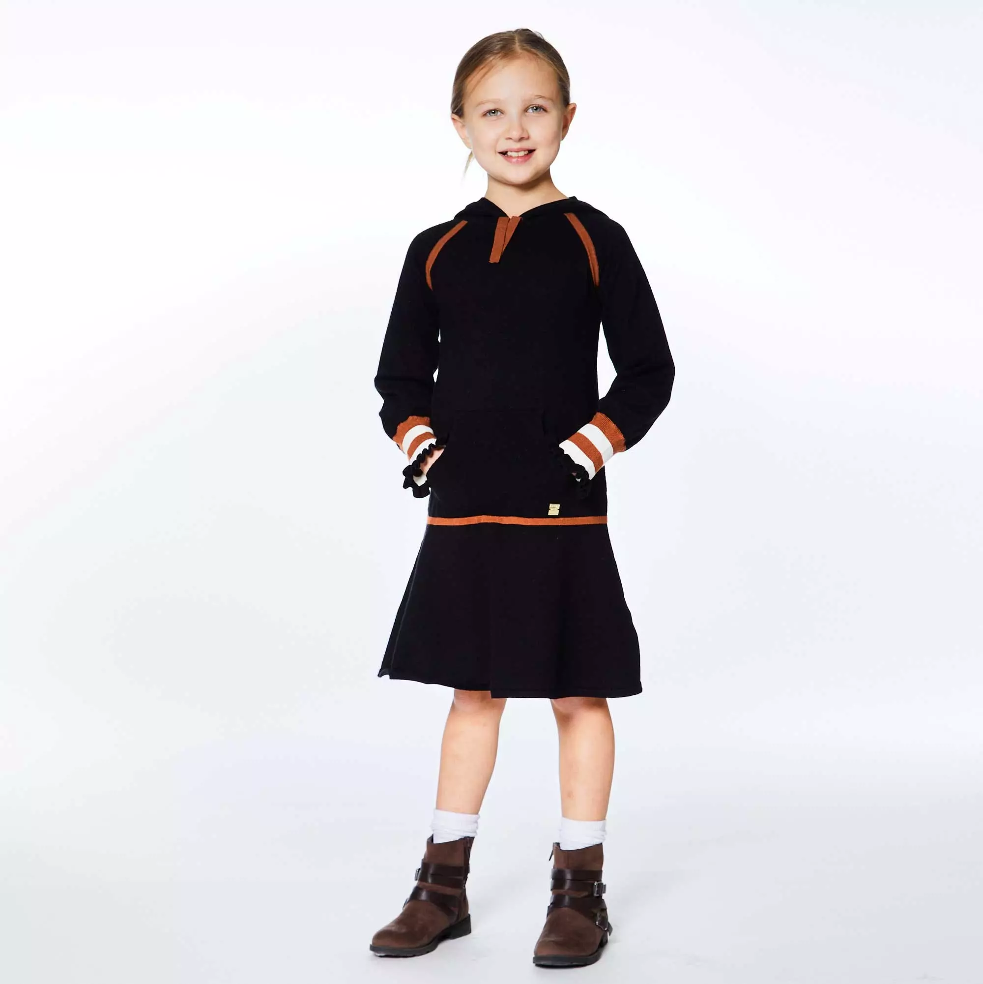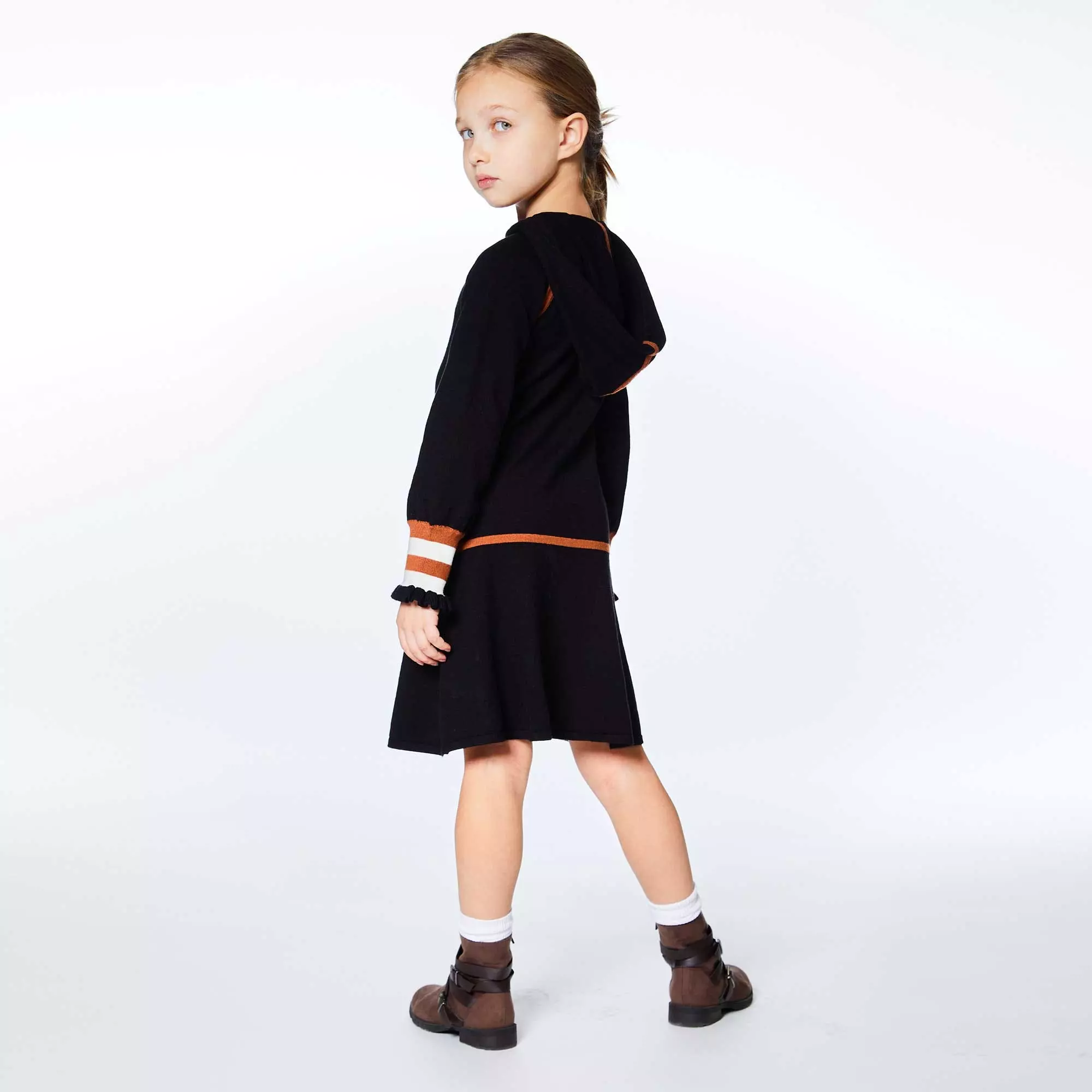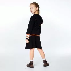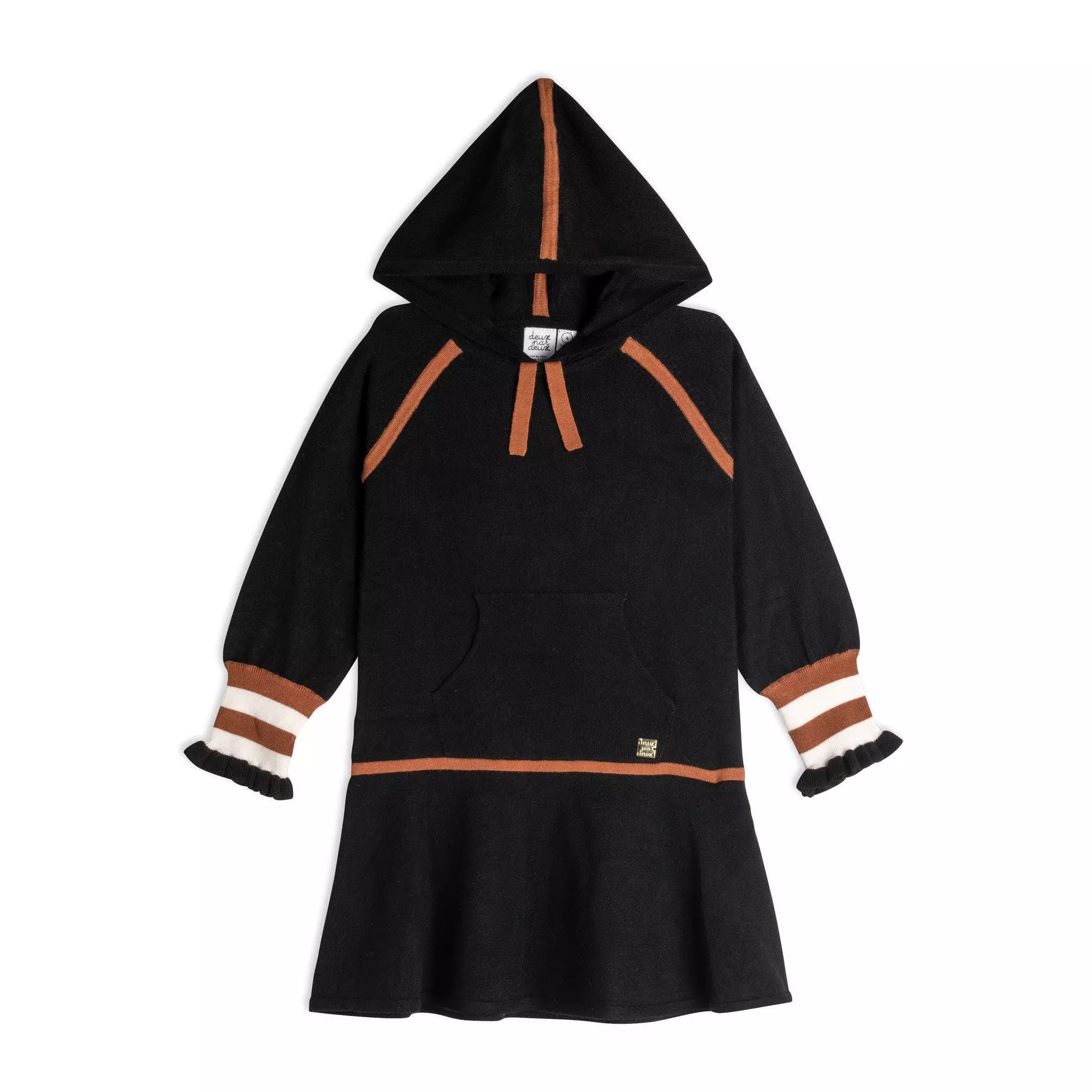Rib knit trim adds a sporty vibe to the Hooded Knitted Dress With Stripes. This viscose/nylon dress features long raglan sleeves, a drop waist skirt, contrast trim on the hood, and striped knit cuffs. It’s detailed with a ribbed kangaroo pocket and a contrast drawstring at the neck.