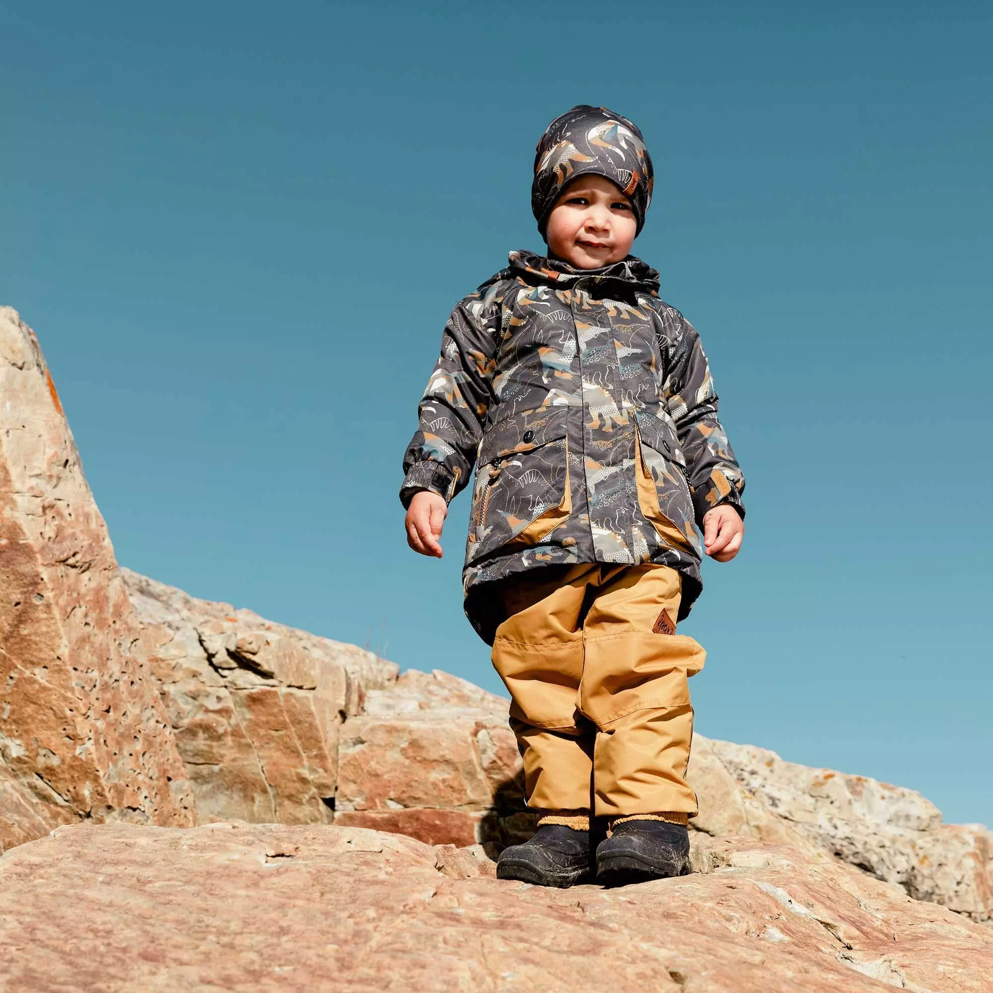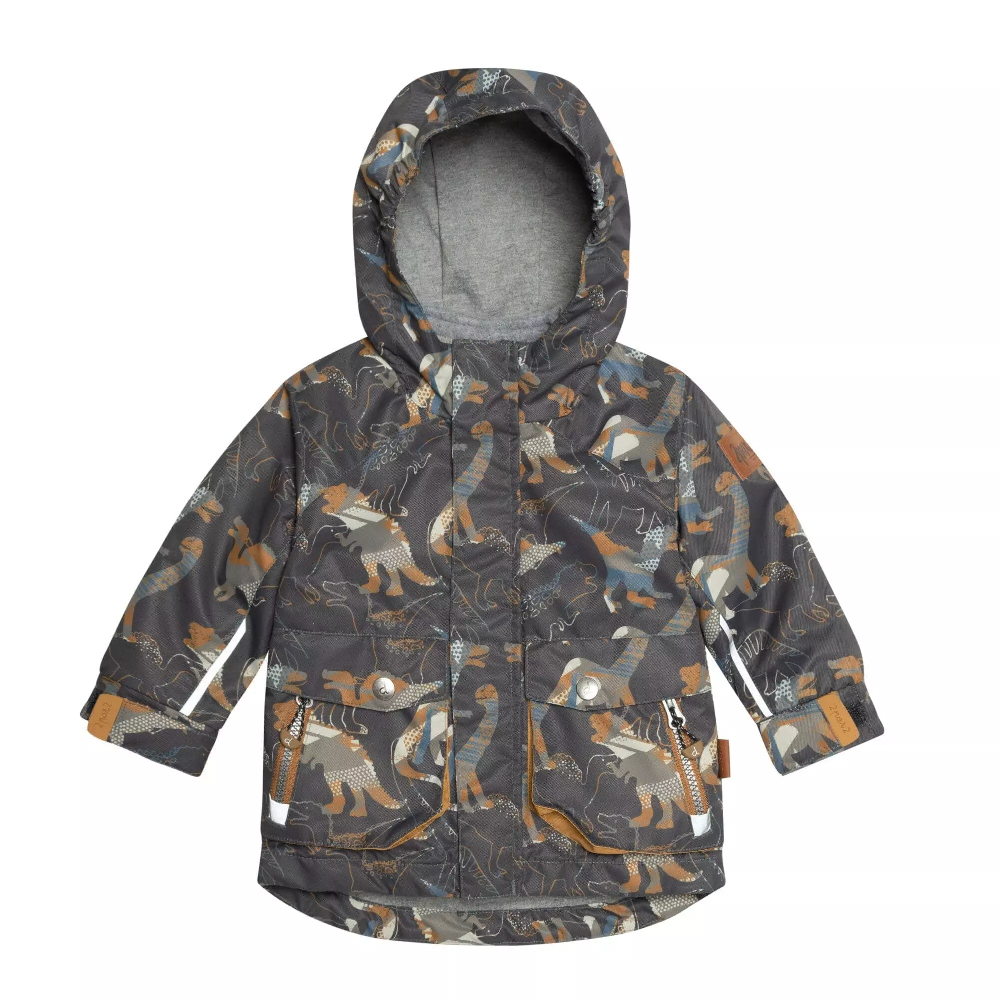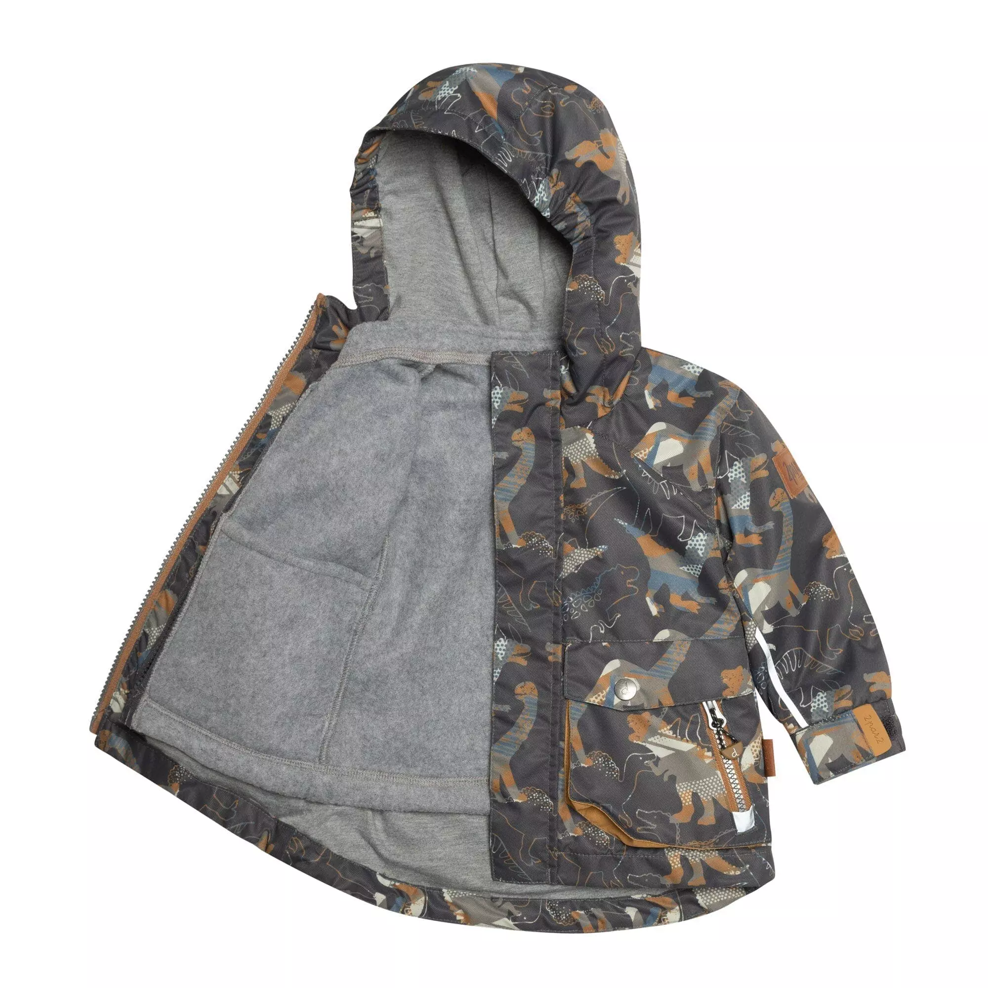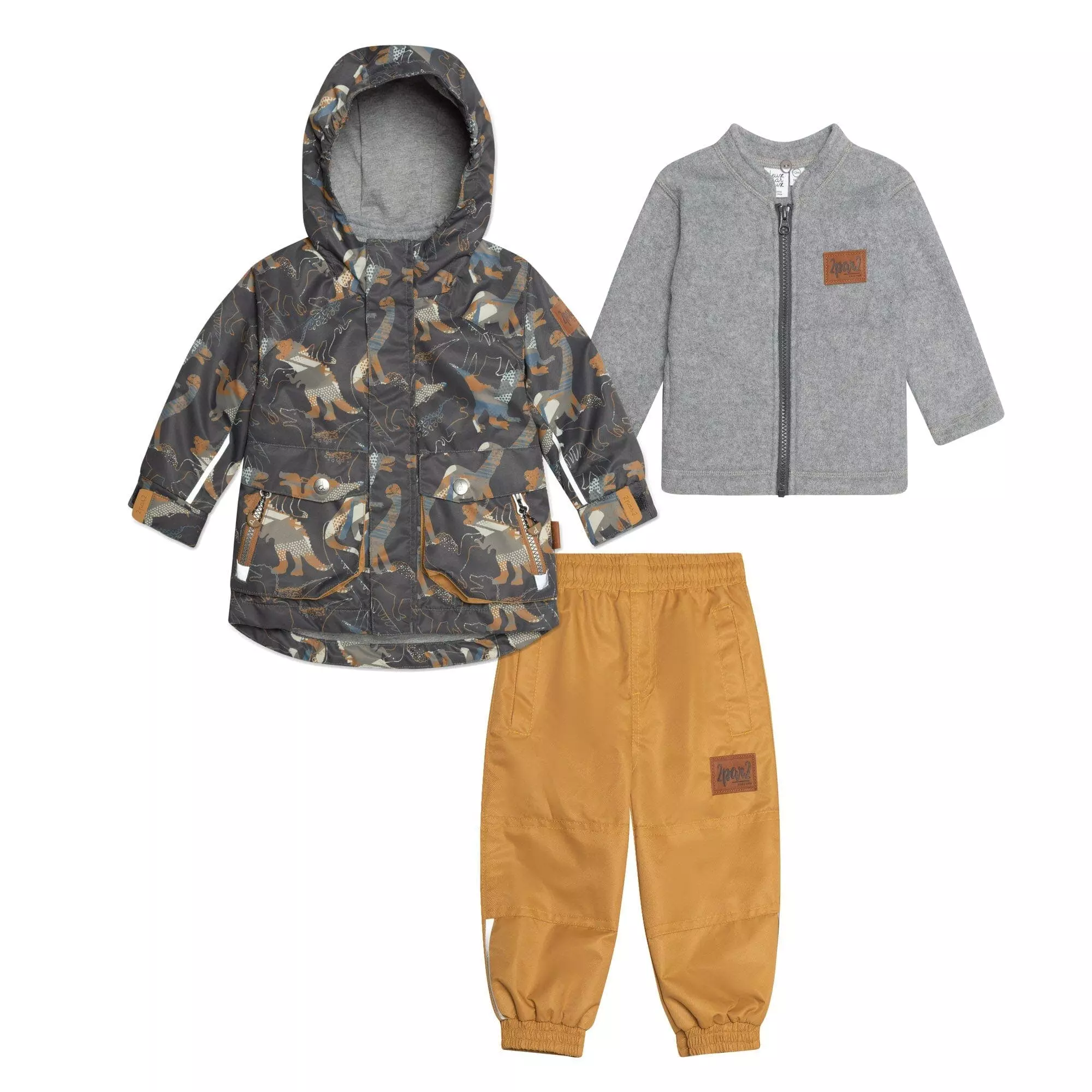 A removable polar fleece jacket lends versatility to this three-piece set, giving him all sorts of options for different types of weather. This Printed 3 in 1 Rain Set Khaki Dinosaurs and Golden Beige features a long sleeve zip front jacket with an allover dinosaur print, a windstopper placket, an attached hood with a cotton knit lining, and adjustable elastic cuffs. It includes a removable zip front jacket and solid pants with an elastic waist, elastic ankles, reinforced panels on each knee and lined for added comfort and warmth.
