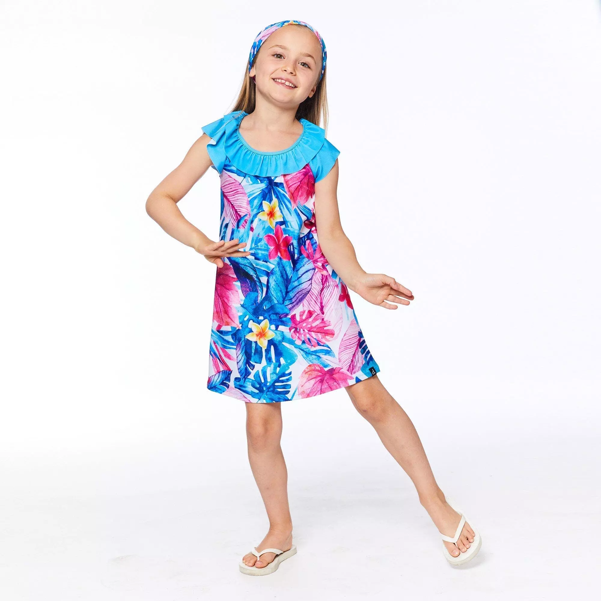 This Printed Beach Dress Blue Tropical is perfect for layering over a swimsuit and wearing to and from the beach. In a shift silhouette with ruffle cap sleeves, this dress features a scoop neckline, ruffle trim around the neck and a bold allover print. It’s made from recycled Repreve® fabric and offers sun protection with a UPF 50+ rating.