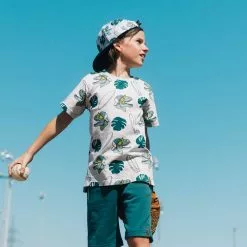 An allover print adds bold style to this Printed Cotton Jersey Tee Light Heather Grey Dinosaurs. Made from soft cotton fabric, this lightweight tee features short sleeves, a crew neckline, and a dinosaur and surfboard print. Mix and match with any of this french terry shorts, jogger pants, or twill bottoms.