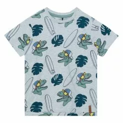 An allover print adds bold style to this Printed Cotton Jersey Tee Light Heather Grey Dinosaurs. Made from soft cotton fabric, this lightweight tee features short sleeves, a crew neckline, and a dinosaur and surfboard print. Mix and match with any of this french terry shorts, jogger pants, or twill bottoms.