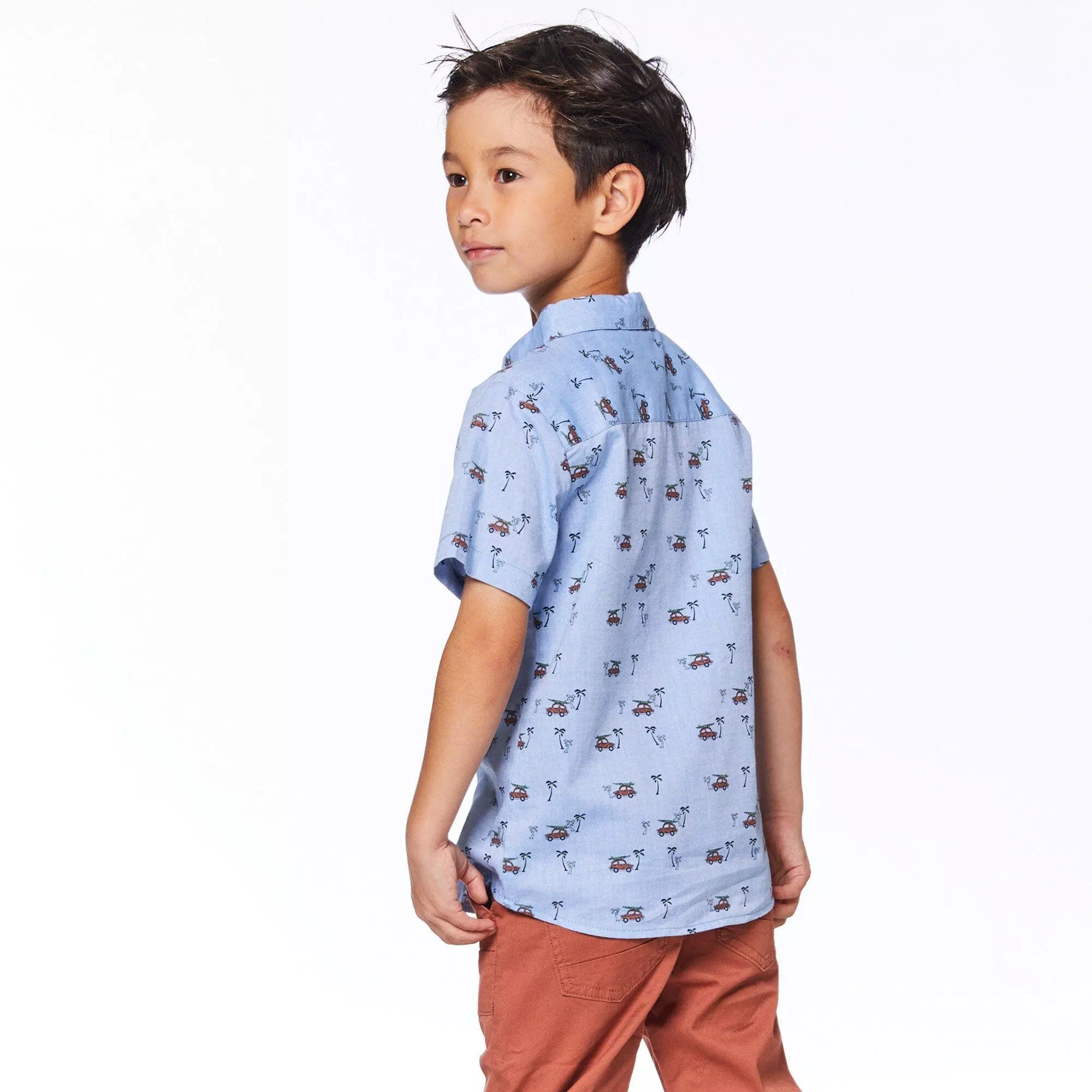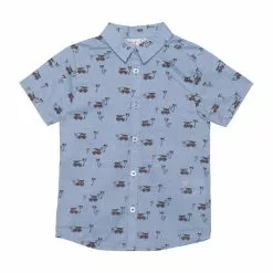 Cars, surfboards, and palm trees add beachy style to this Printed Cotton Shirt Blue Trucks. This shirt is made from 100% cotton and features a classic button front silhouette with a collar and short sleeves. Pair with solid twill shorts or joggers for the perfect head to toe look.