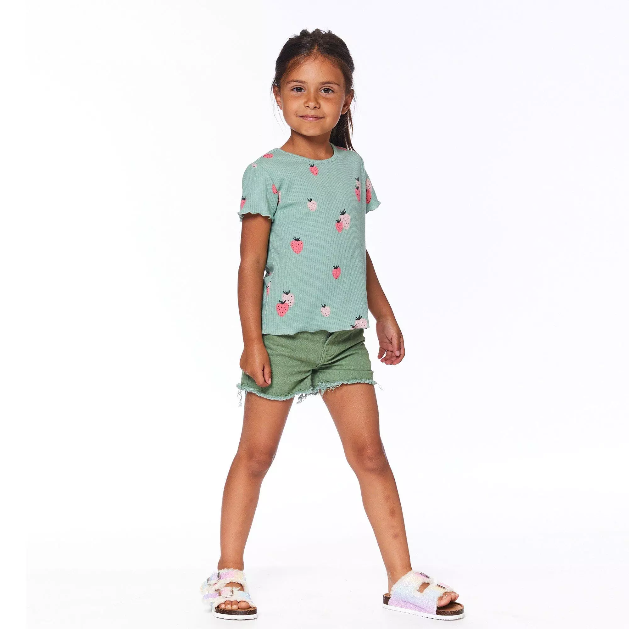 This Printed Short Sleeve Tee Frosty Green Strawberry is simply adorable in a cotton/elastane blend with a ribbed texture. This tee features short sleeves with lettuce edging, a round neckline, lettuce edging at the hem and a colorful allover strawberry print.