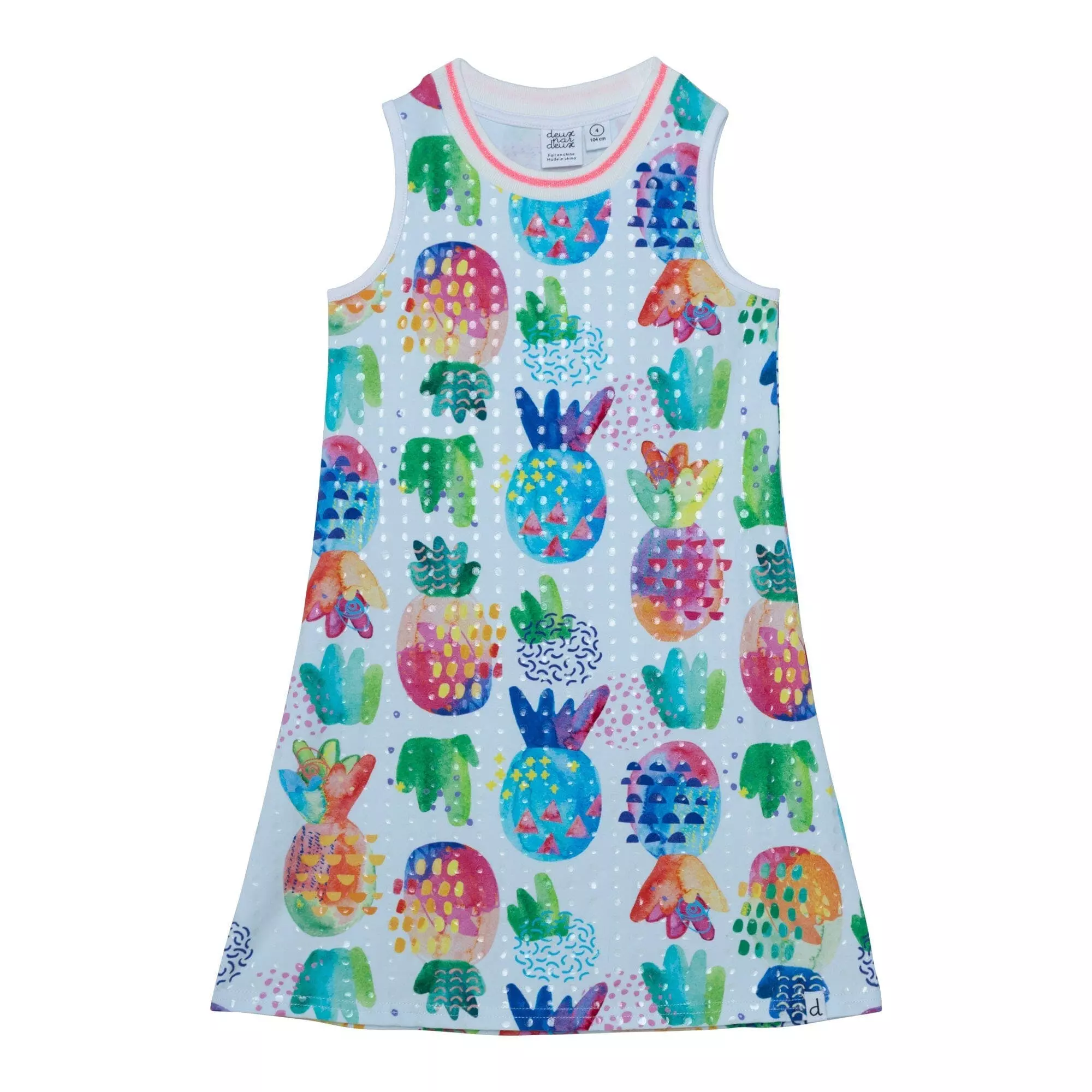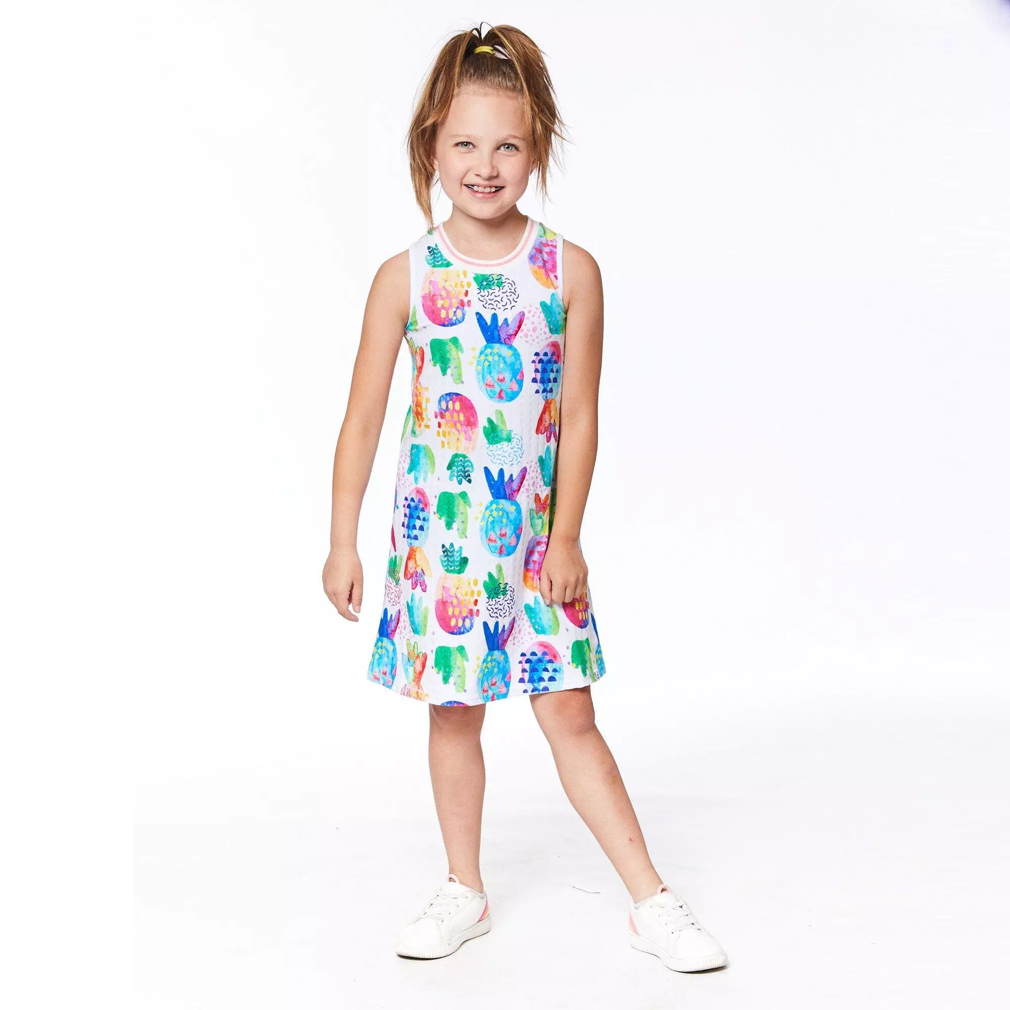 The Printed Sleeveless Dress White Pineapple is a perfect choice for any spring or summer day. this darling design is made from a soft cotton/poly/elastane blend and features a shift silhouette with a round neckline and striped trim at the neck. A colorful allover pineapple print adds a touch of tropical-inspired style.