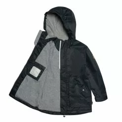 This Parka Black Texture offers cozy style on a chilly spring day. This jacket is made from recycled poly fabric with a poly lining in the body and a soft cotton knit lining in the hood. Water-repellent and coated for waterproofing, this jacket features an attached hood, a zip front closure, elastic cuffs, and a wind stopper placket for added protection against the cold.