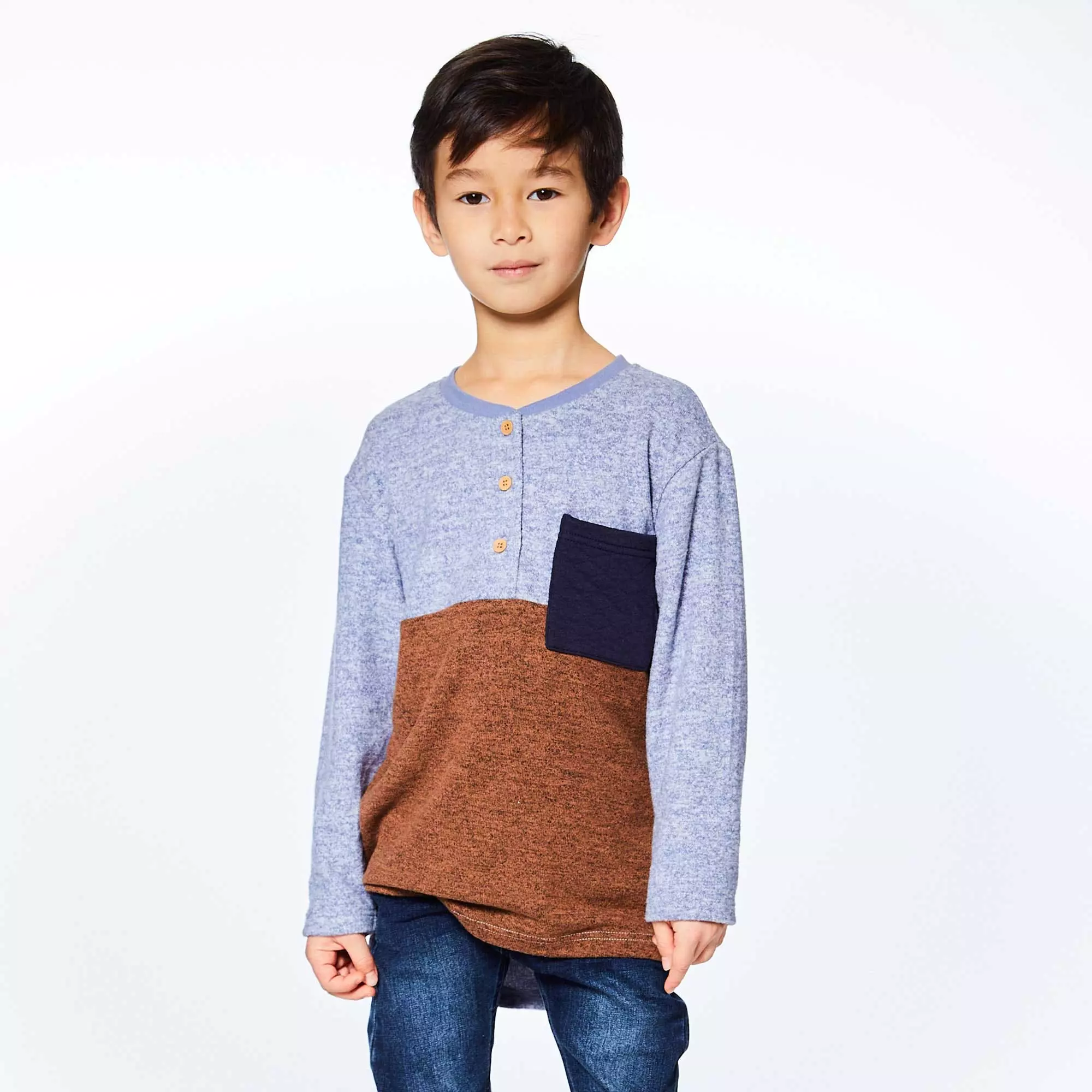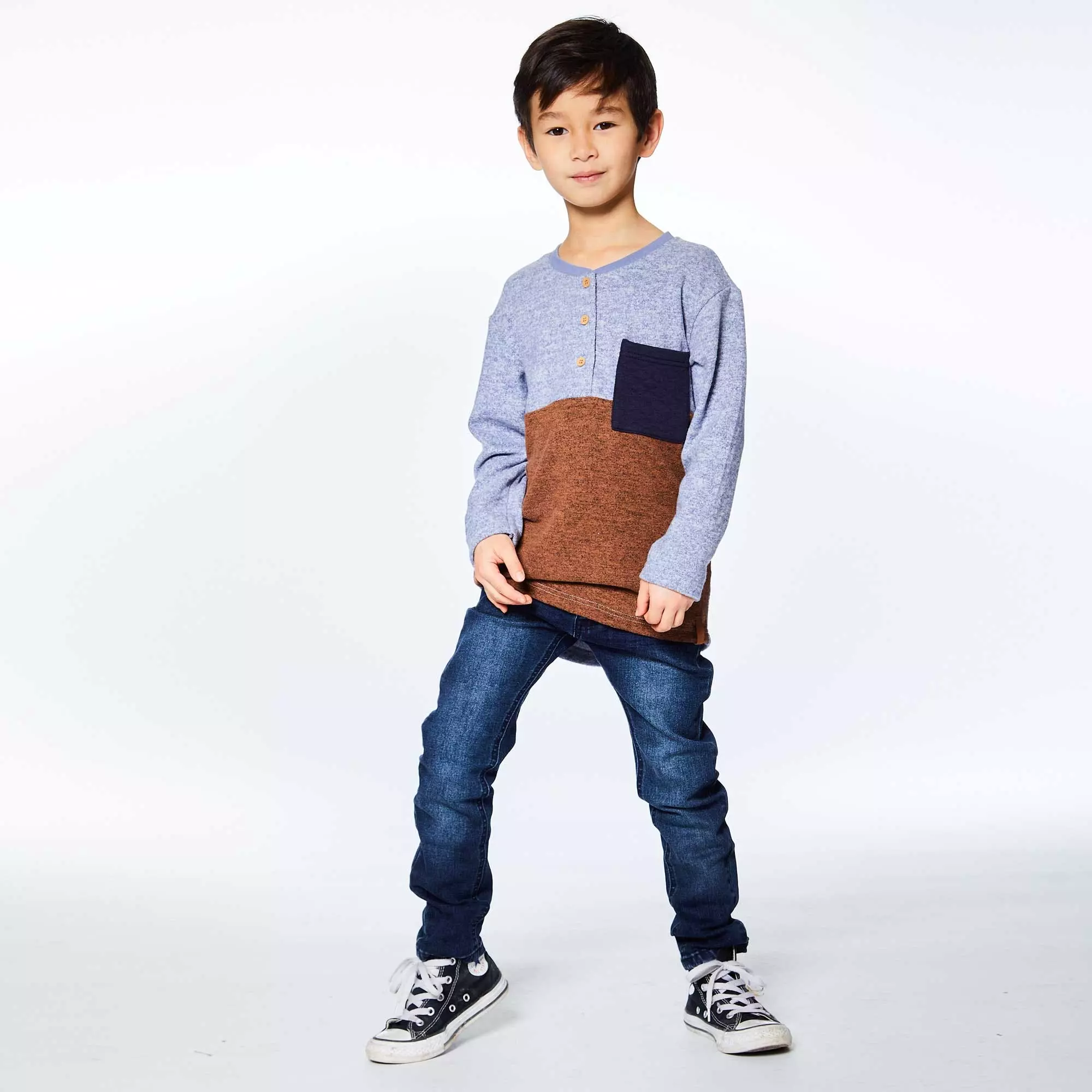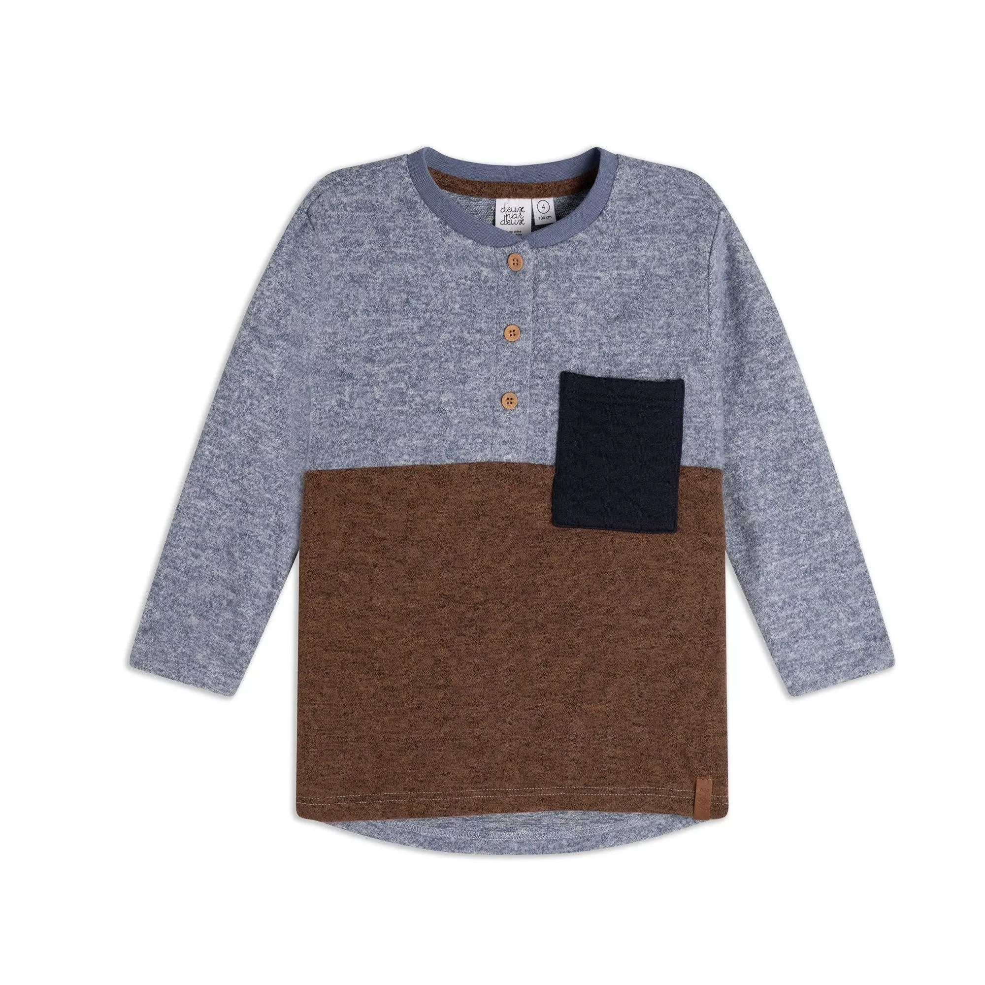 In a two-tone pattern with contrast trim, this top is the perfect choice when it’s too warm for a sweater but too chilly for a tee.