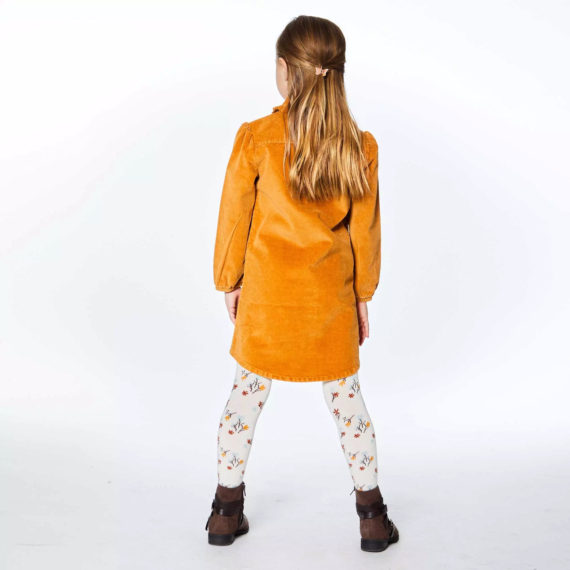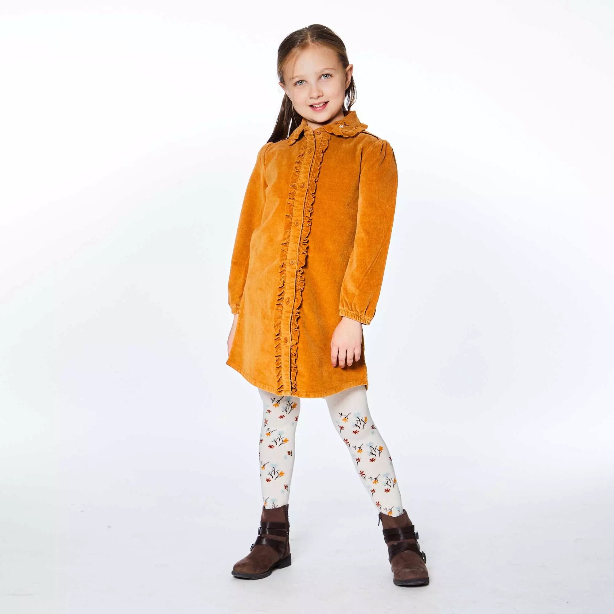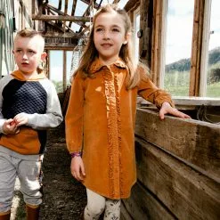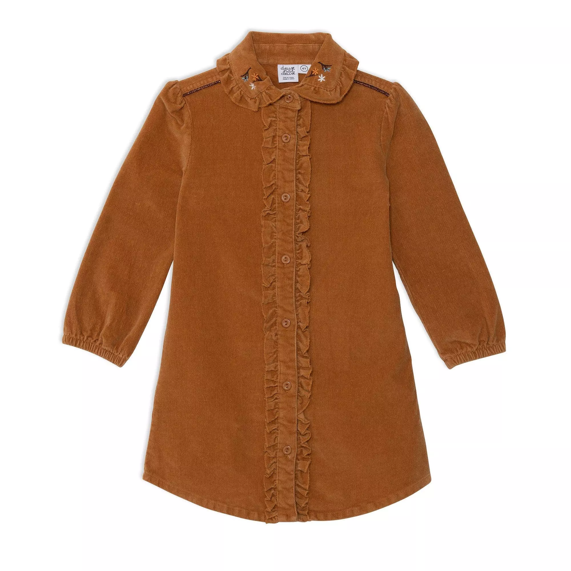 A ruffled placket lends a touch of texture to long sleeve corduroy shirt dress with frill. This button front shirt dress is made from pinwale cotton corduroy and features elastic cuffs, a rounded collar with floral embroidery, and contrast piping across the shoulders.