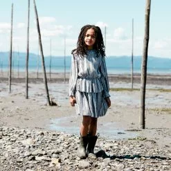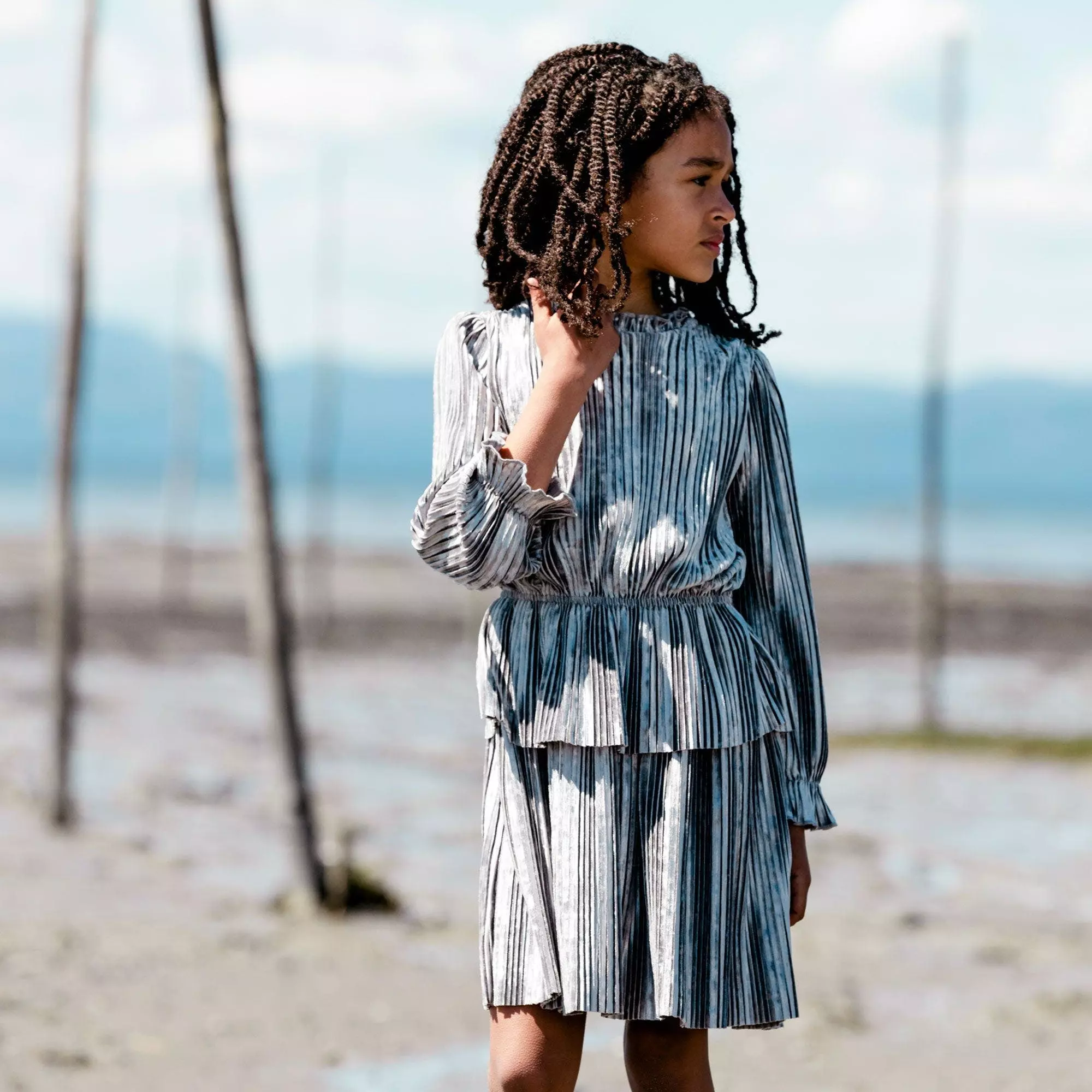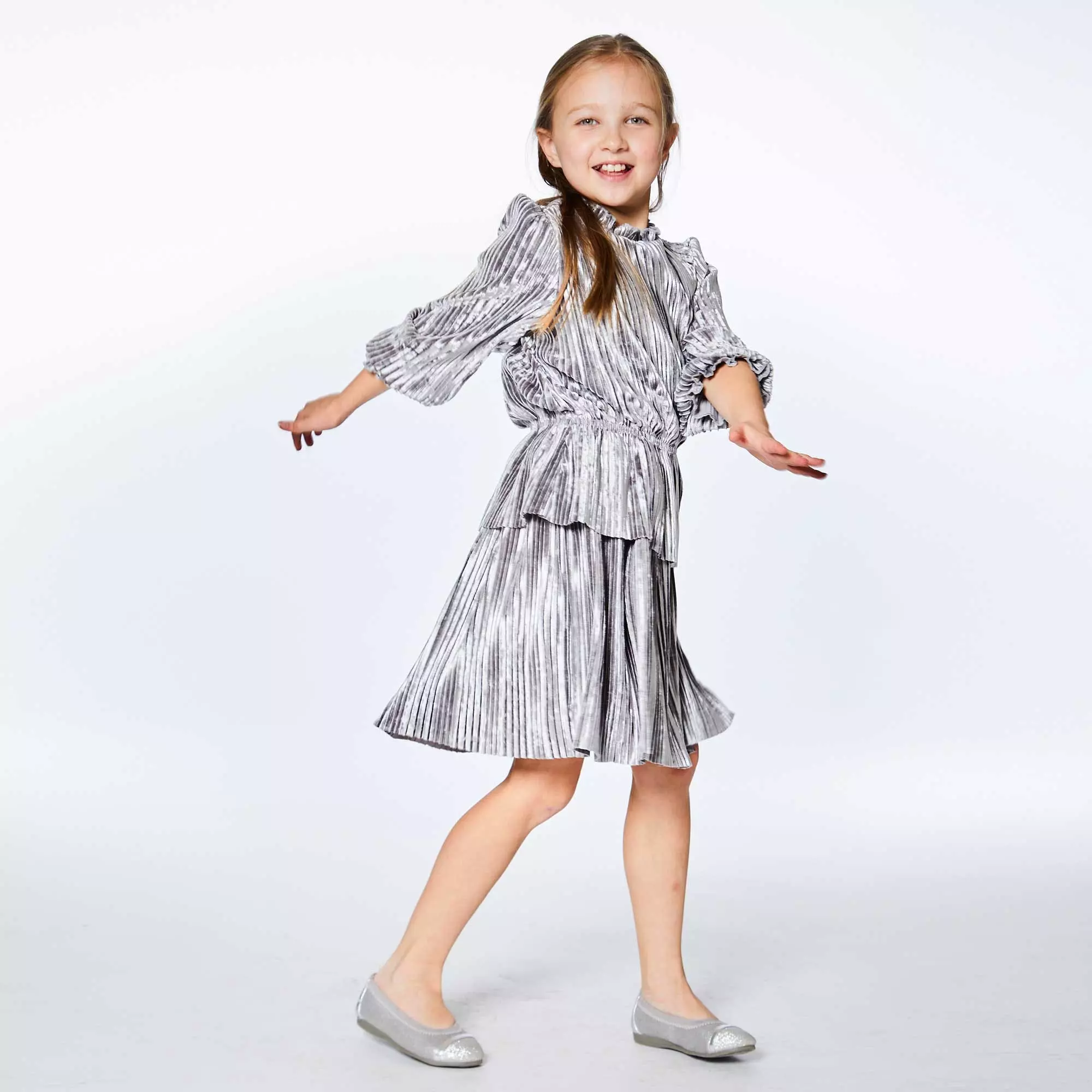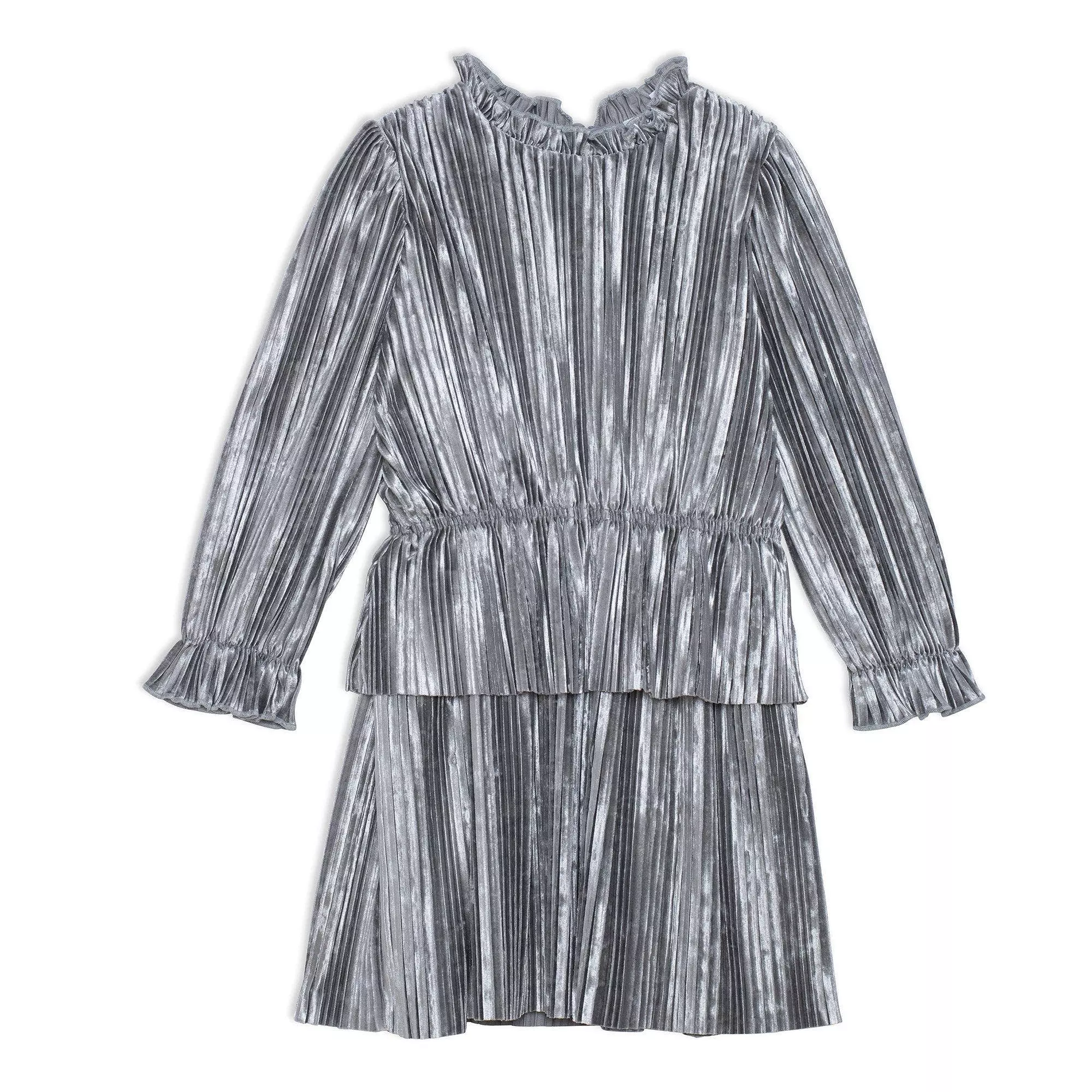 Long sleeve crinkle dress silver grey and red violet is a perfect choice for any party or special occasion. This design features long sleeves with elastic cuffs, a round neckline, and an elastic waist adorned with a fabric overlay.