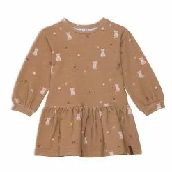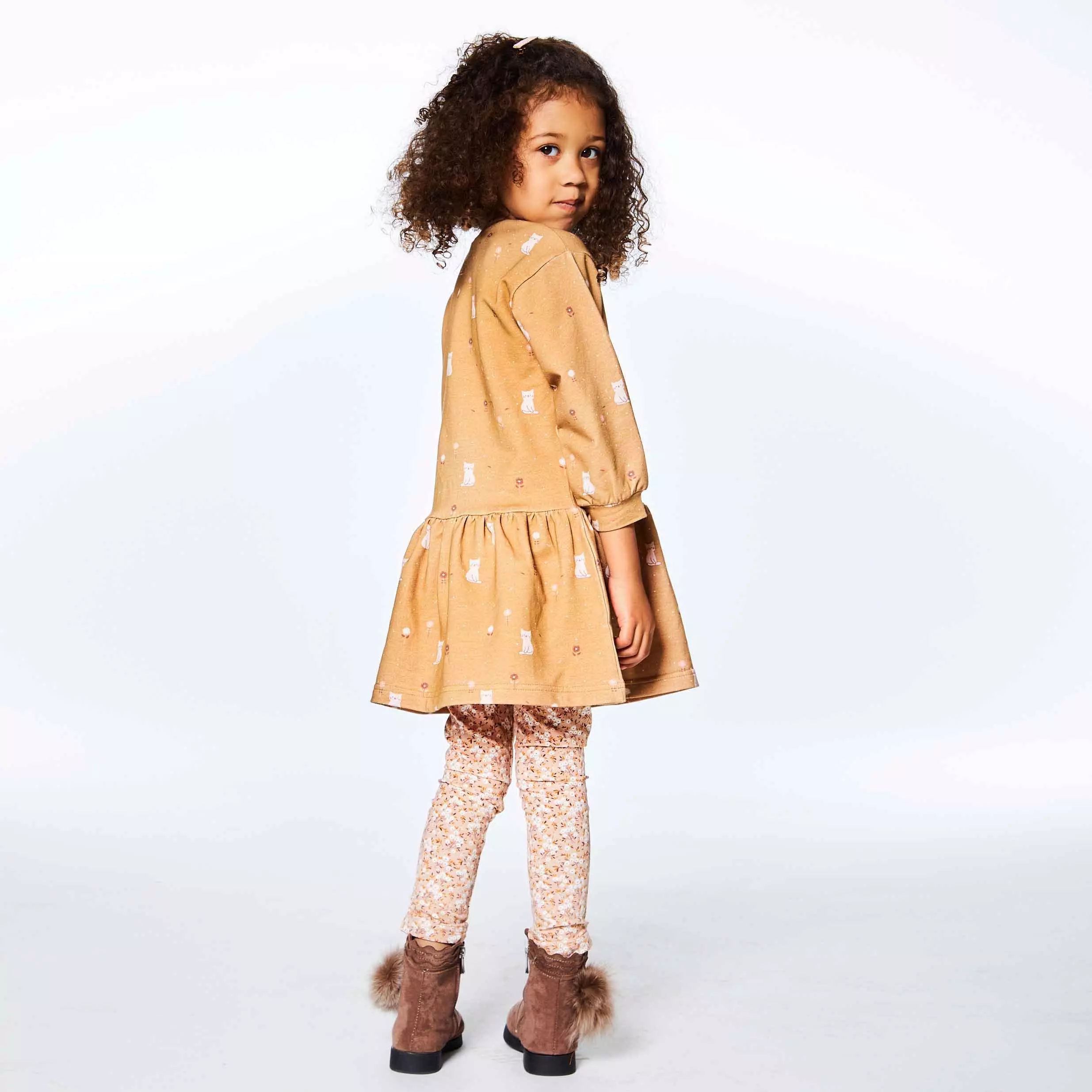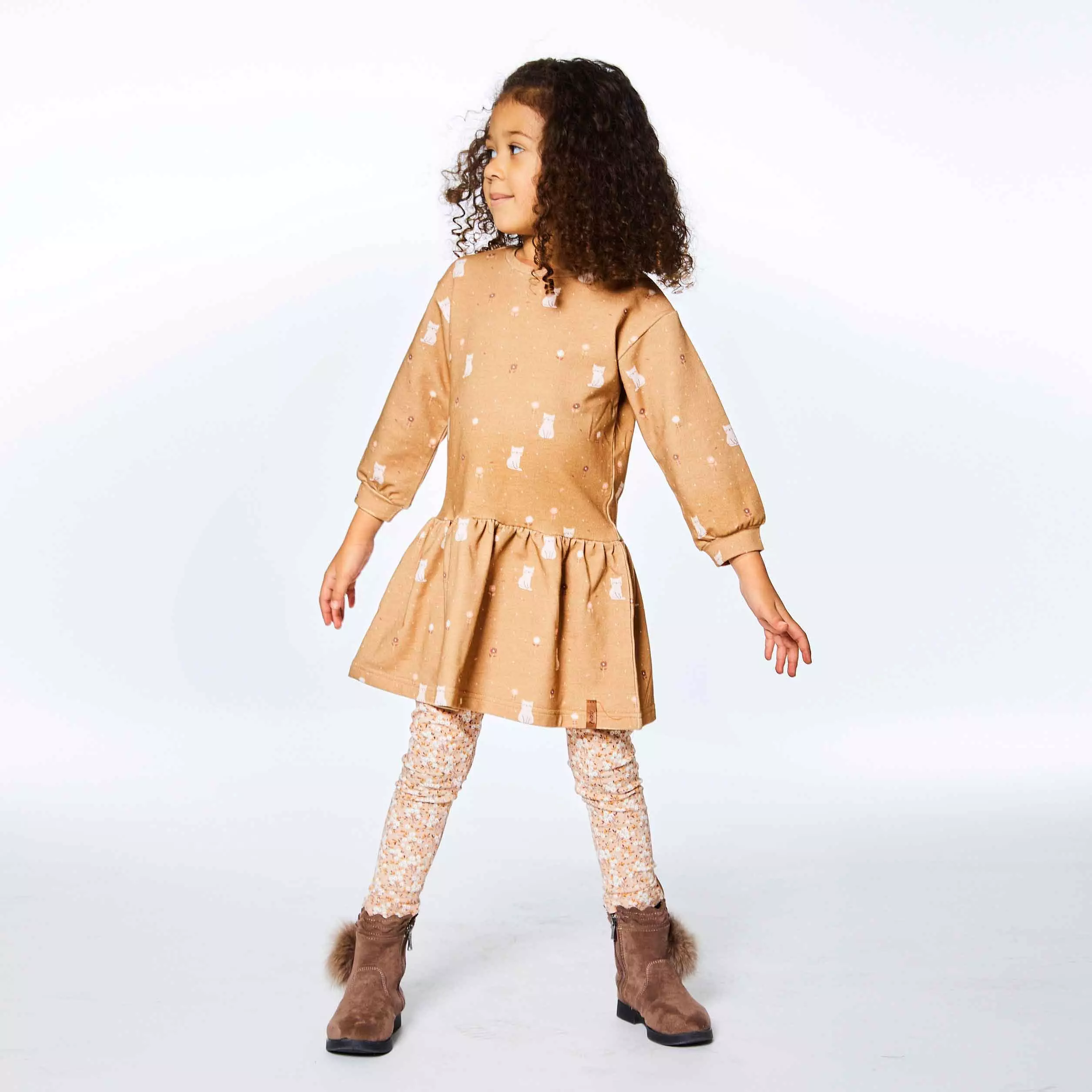 A drop waist silhouette adds charming style to our printed cats long sleeve fleece dress. This long sleeve dress is made from soft cotton fleece fabric and features long sleeves, a crew neckline and an adorable allover cat and flower print.