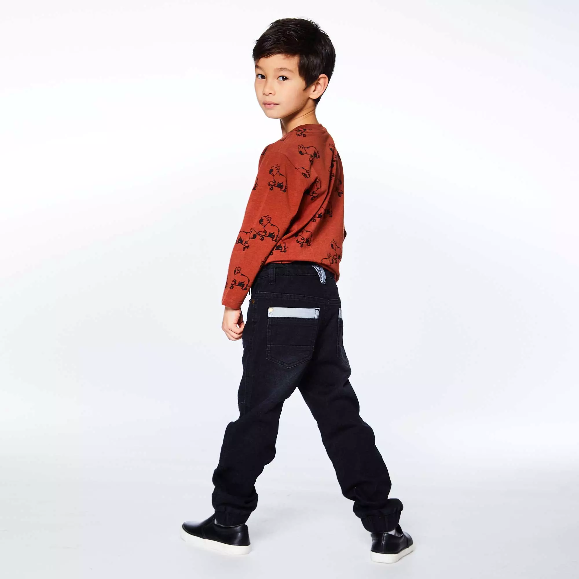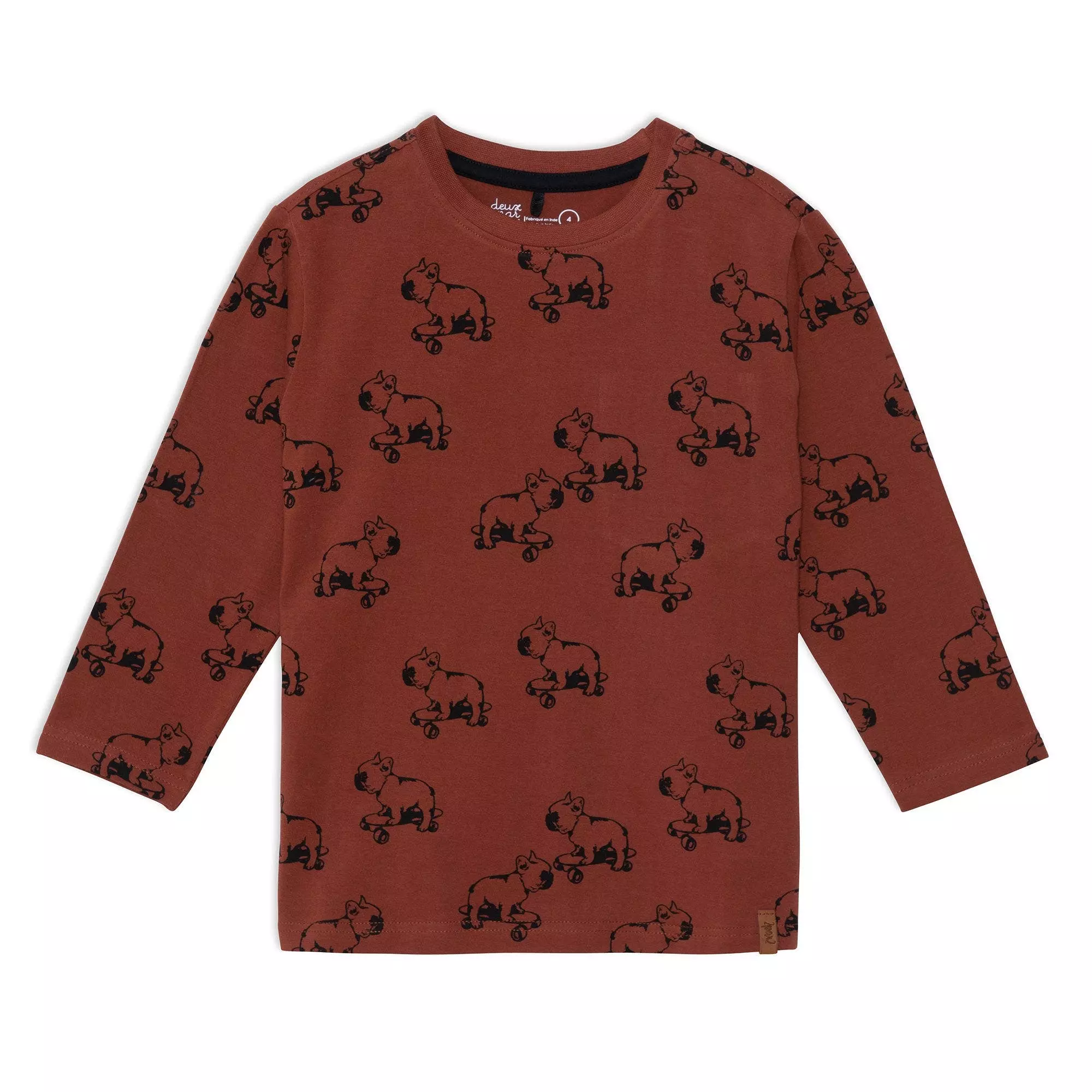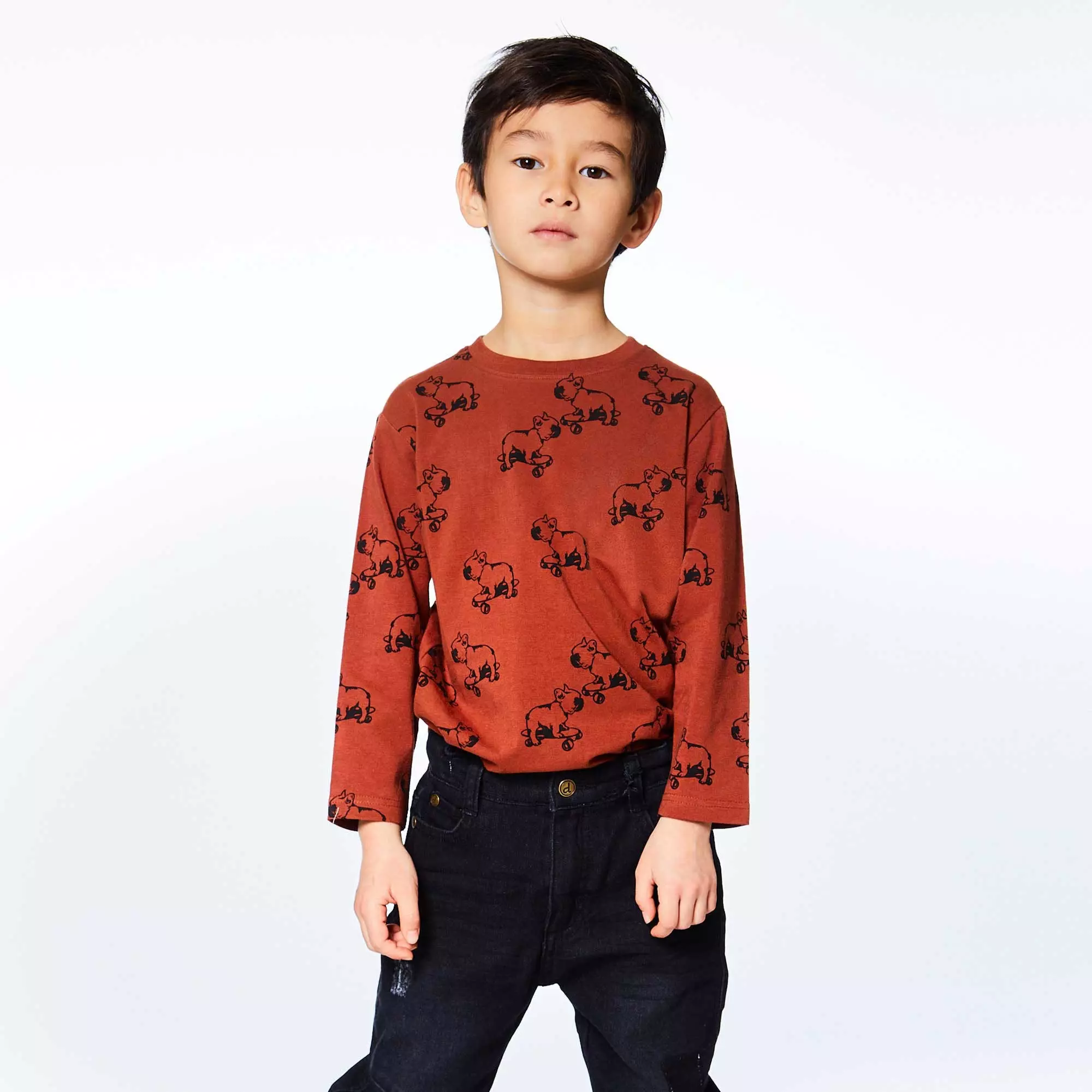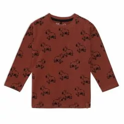 Worn alone or layered beneath a hoodie, long sleeve jersey printed top with dogs is one that he can wear any day of the week.