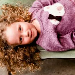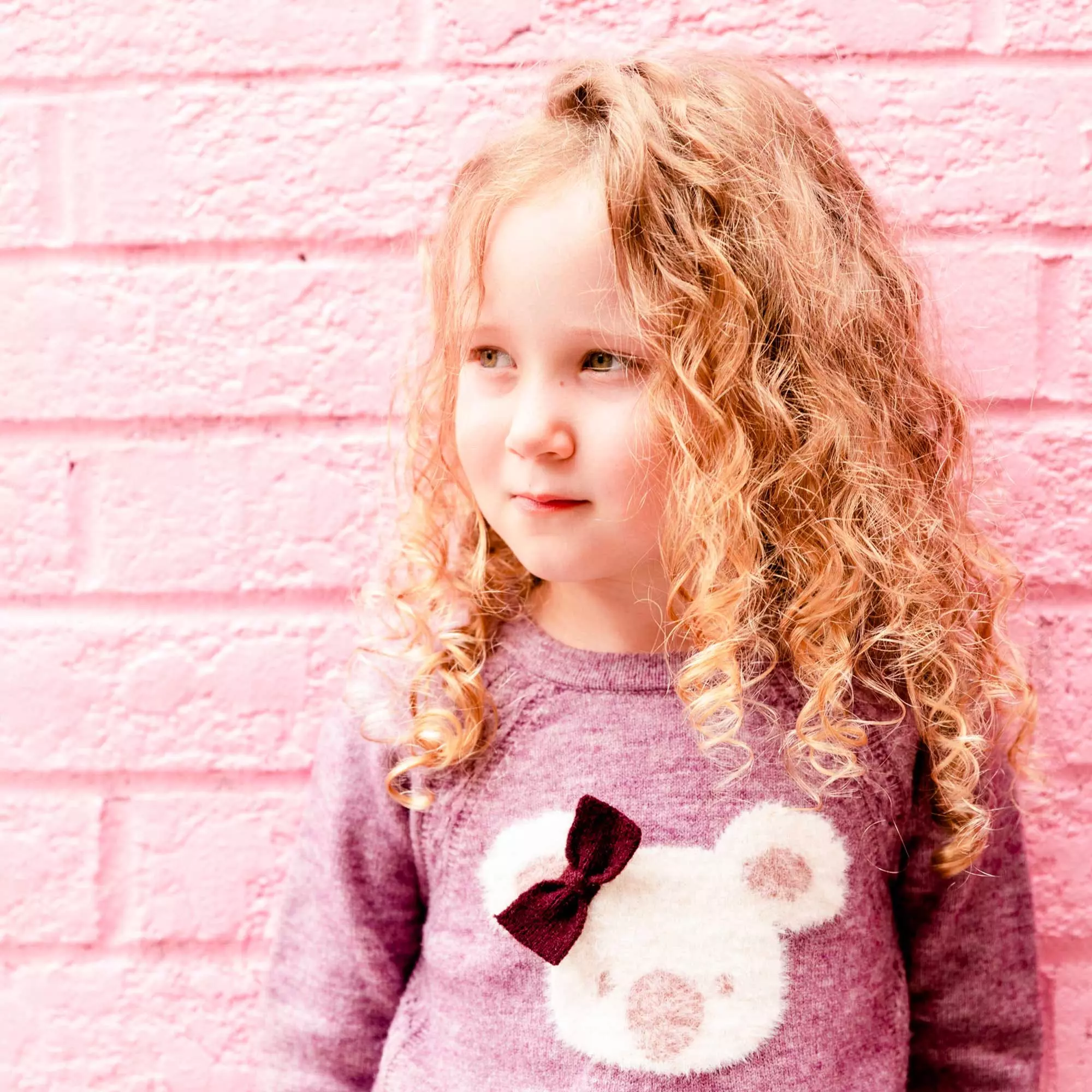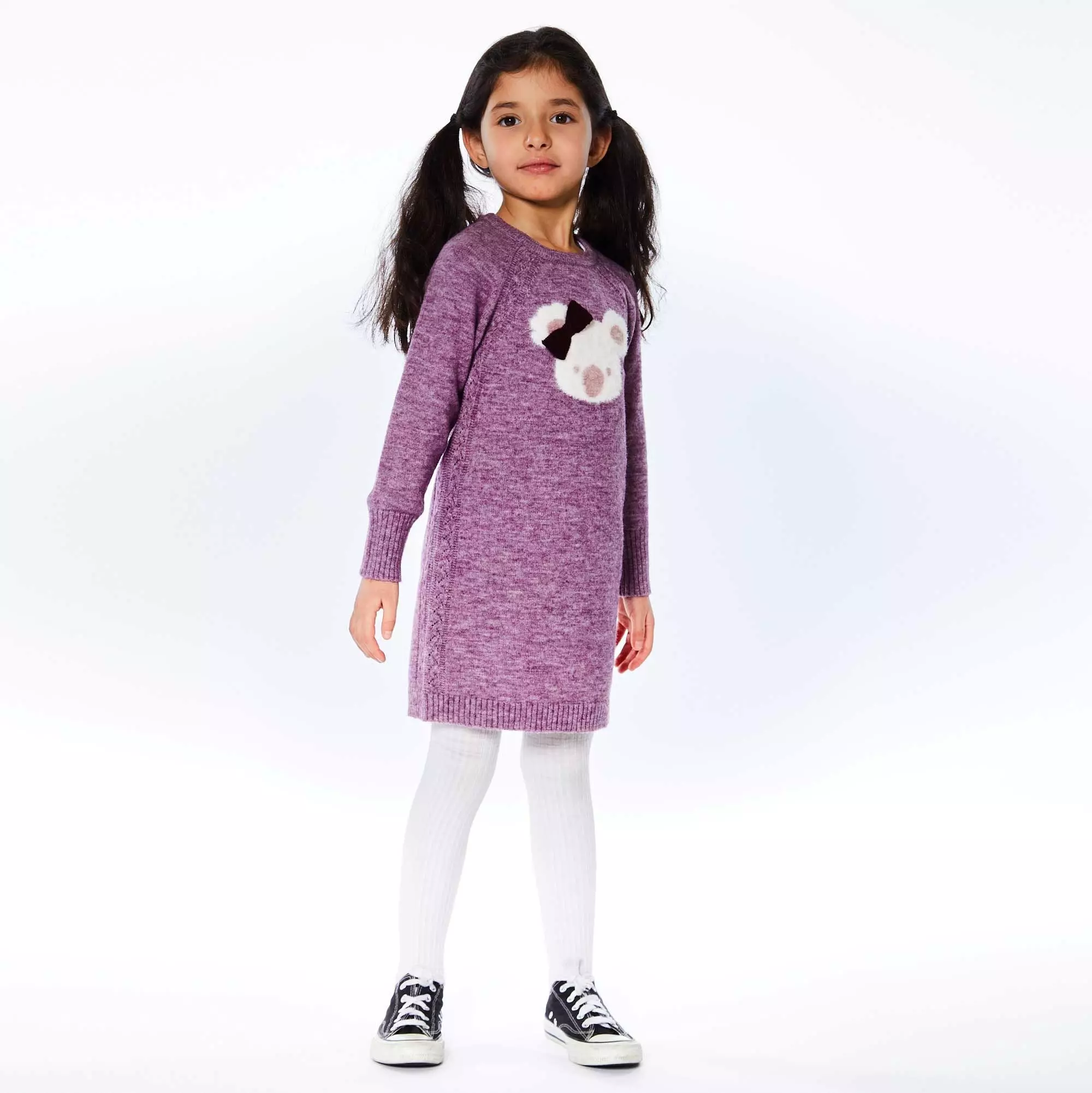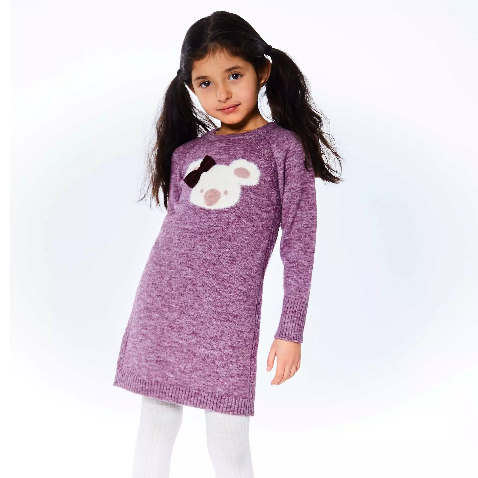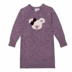 A bow applique on the chest lends unexpected texture to this adorable sweater dress. This Long Sleeve Knitted Dress With Applique is made from an acrylic/nylon/poly blend and features long raglan sleeves, a crew neckline and a koala bear face with a bow on the head.