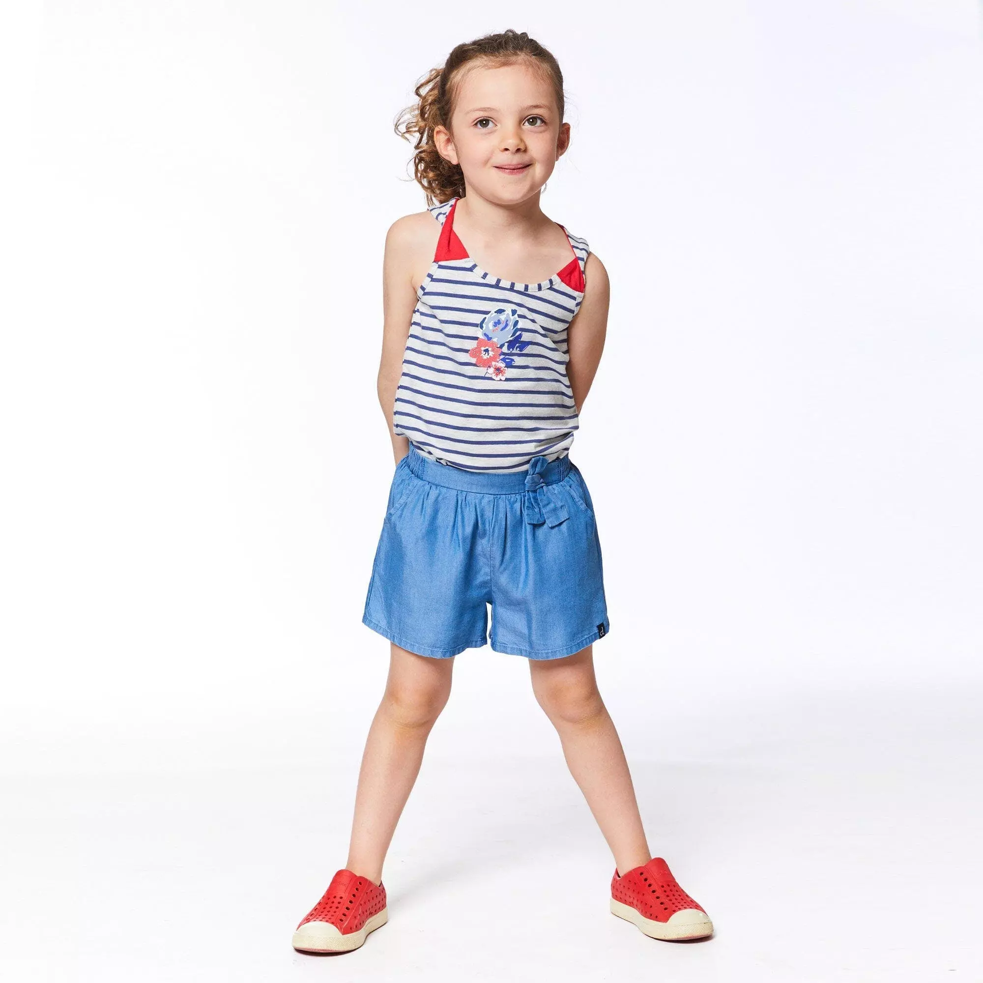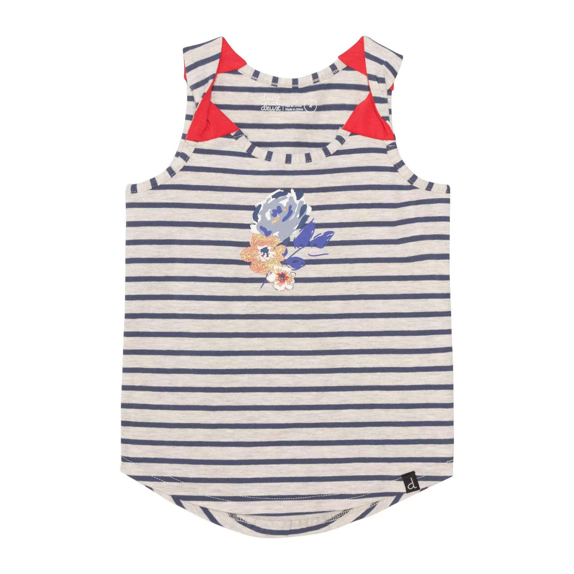 Twisted shoulder straps add distinctive style to this Organic Cotton Graphic Tank Top Oatmeal Mix and Navy Blue Stripes. This comfortable stretch cotton tank top features wide straps, a scoop neckline, allover horizontal stripes and a floral print on the chest. It’s finished with a rounded back hem that adds a sporty touch.