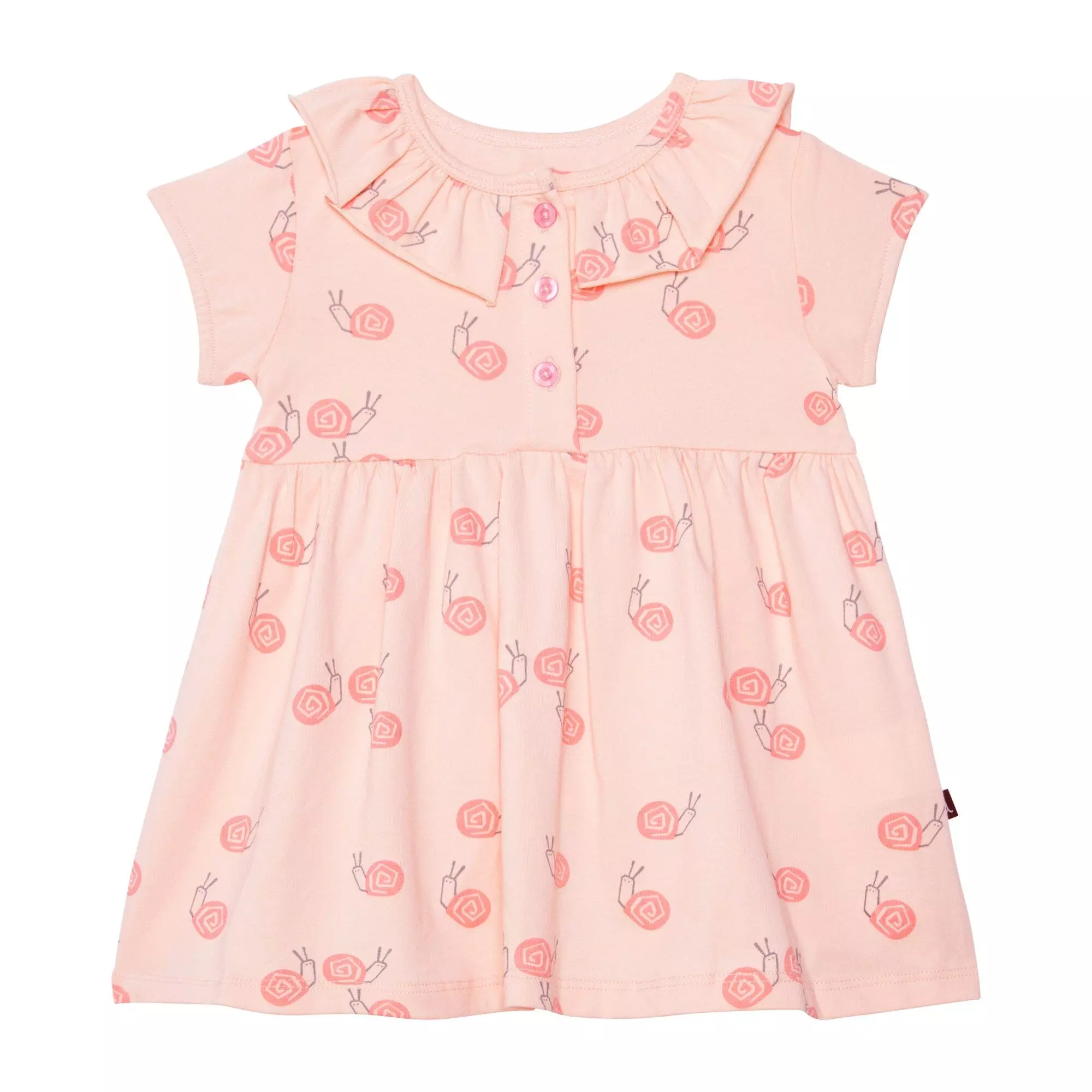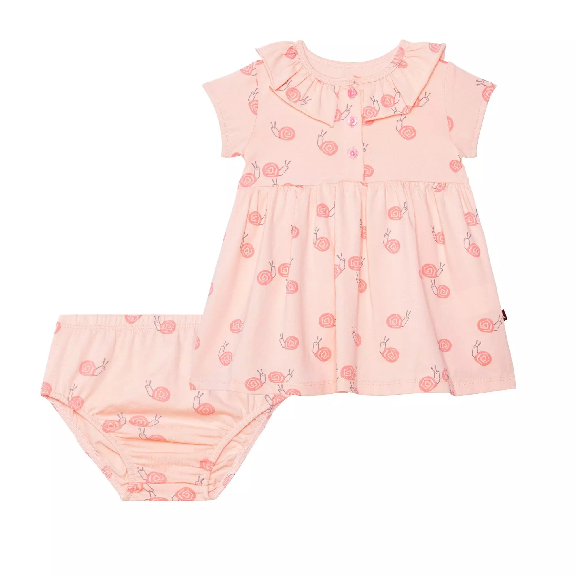 A ruffled neckline adds a touch of texture to the Organic Cotton Printed Dress Set Pink little Snails. Featuring a soft allover print, this dress boasts short sleeves, a round neckline, and three little buttons down the bodice. A matching panty with an elastic waistband completes the look.
