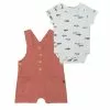An allover gator print adds whimsical style to this comfortable two-piece set. The Organic Cotton Printed Onesie and Shortall Set heather beige alligator features a cotton short with an elastic waistband, flat straps that crisscross in back, and side pockets. It coordinates perfectly with a short sleeve onesie with a round neck and bottom snaps.