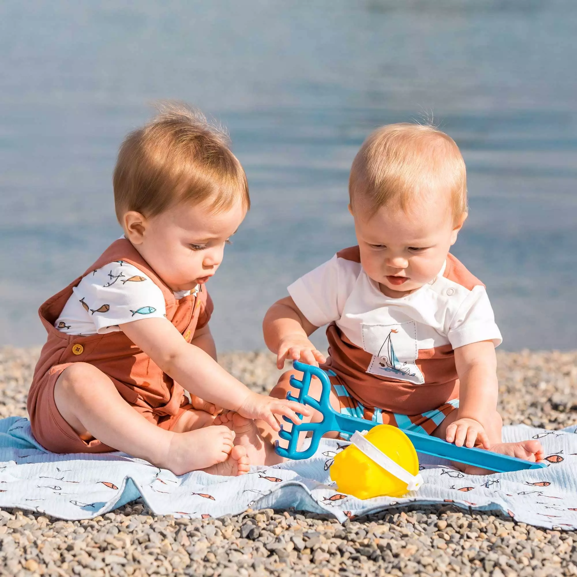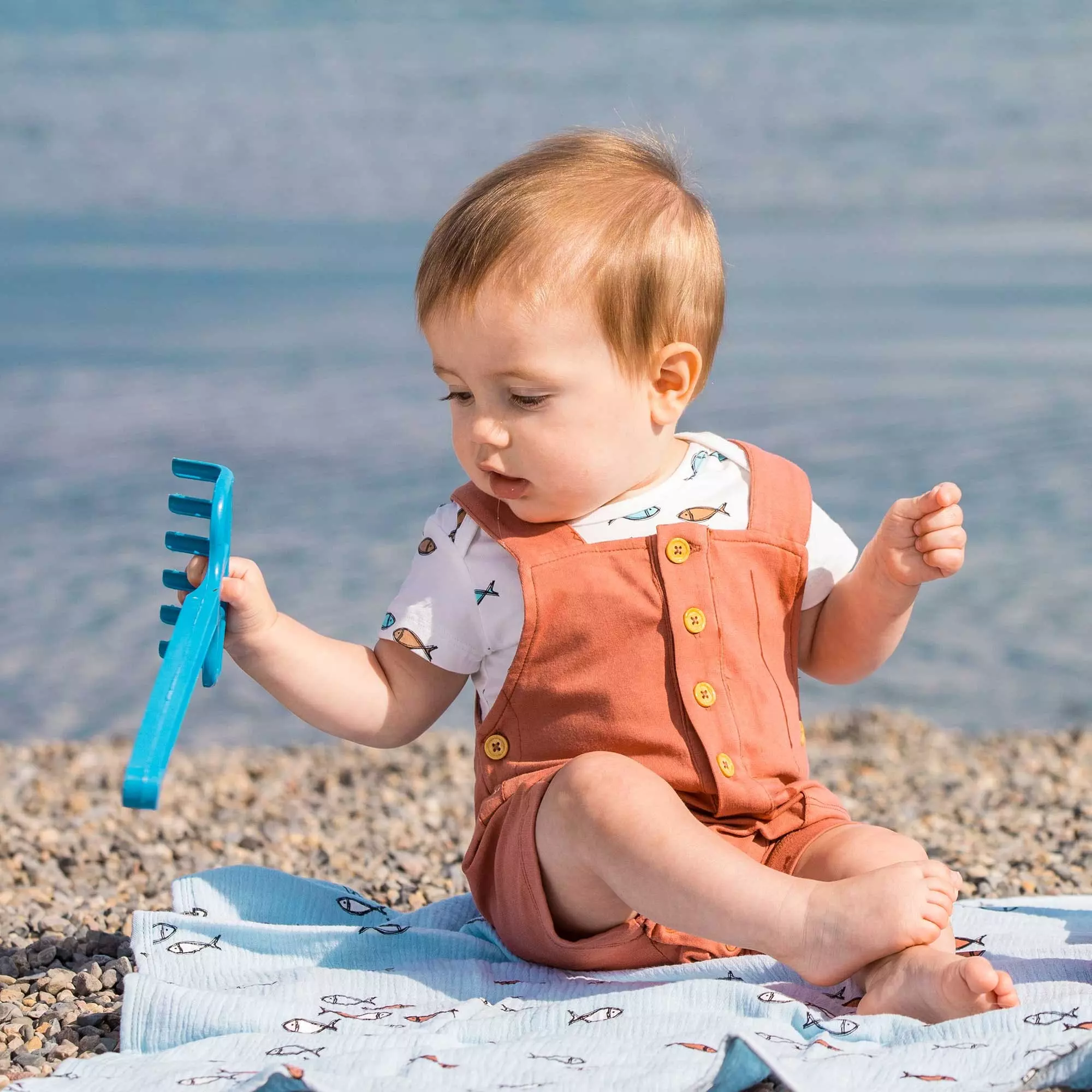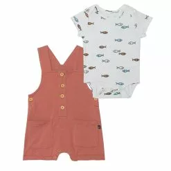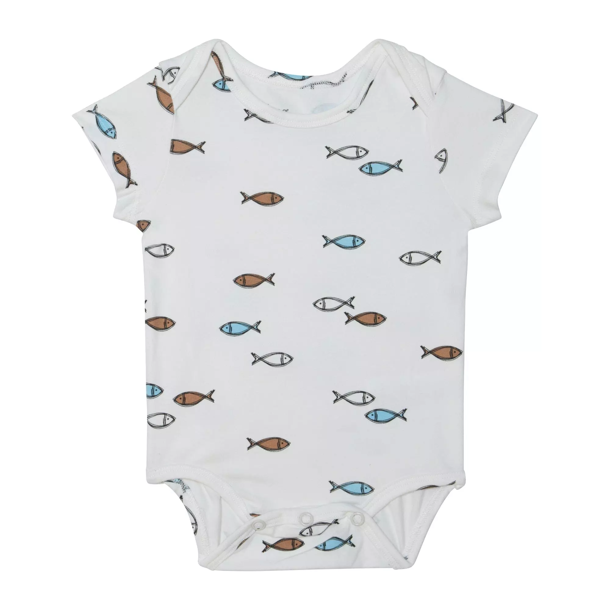 In this Organic Cotton Printed Onesie and Shortall set White Fish Print, he can play and learn and lounge in style all day long! This soft two-piece set features a sleeveless shortall with flat straps, four front buttons, and front patch pockets. It layers perfectly over a short sleeve onesie with a crew neckline and an allover fish print. This shortall features a snap opening at the crotch for easy diaper changes.