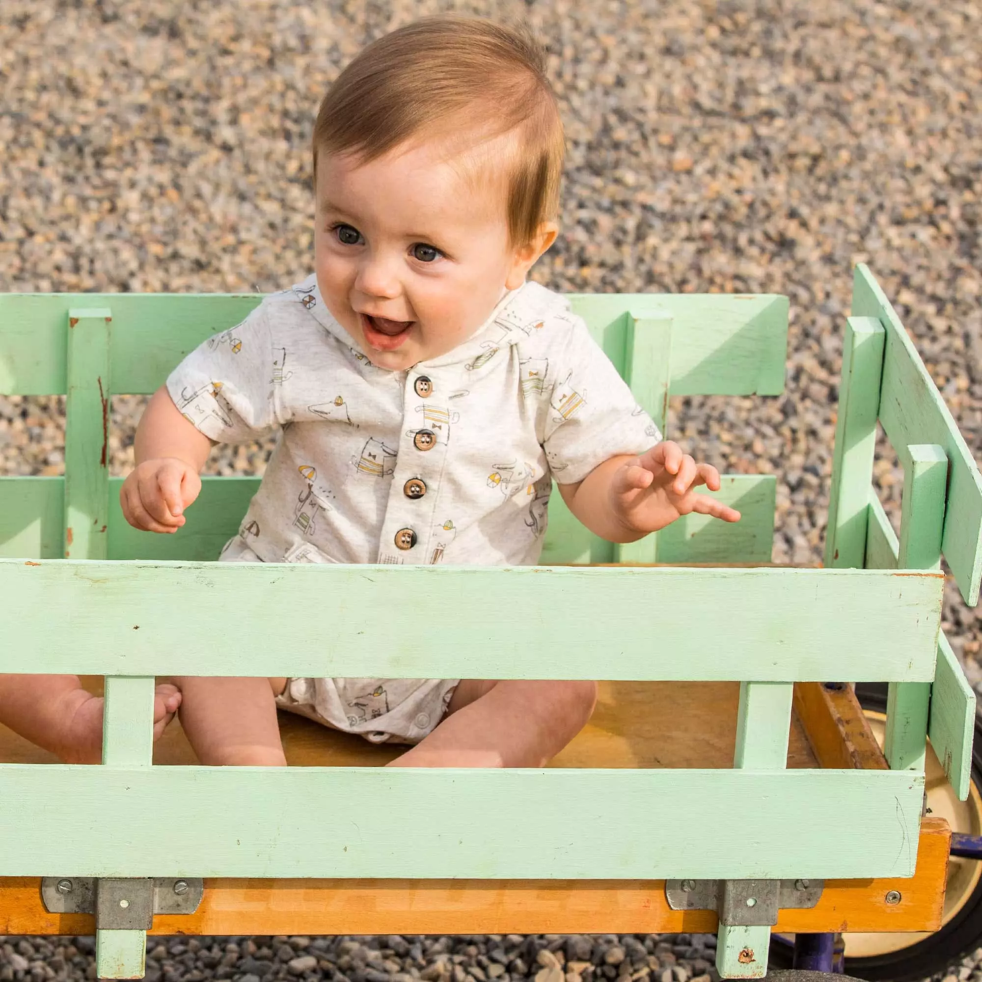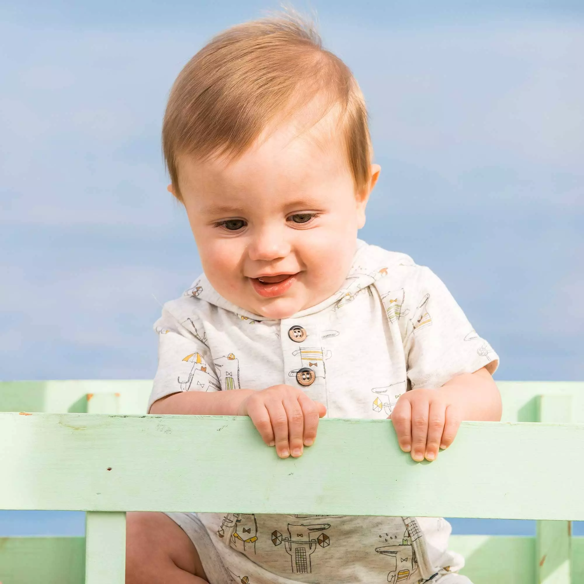 He’s sure to love the adorable look and comfy feel of this Organic Cotton Printed Romper heather beige alligator. With a whimsical allover alligator print, this one-piece features short sleeves, an attached hood, four buttons down the bodice, and a kangaroo pocket on the front.