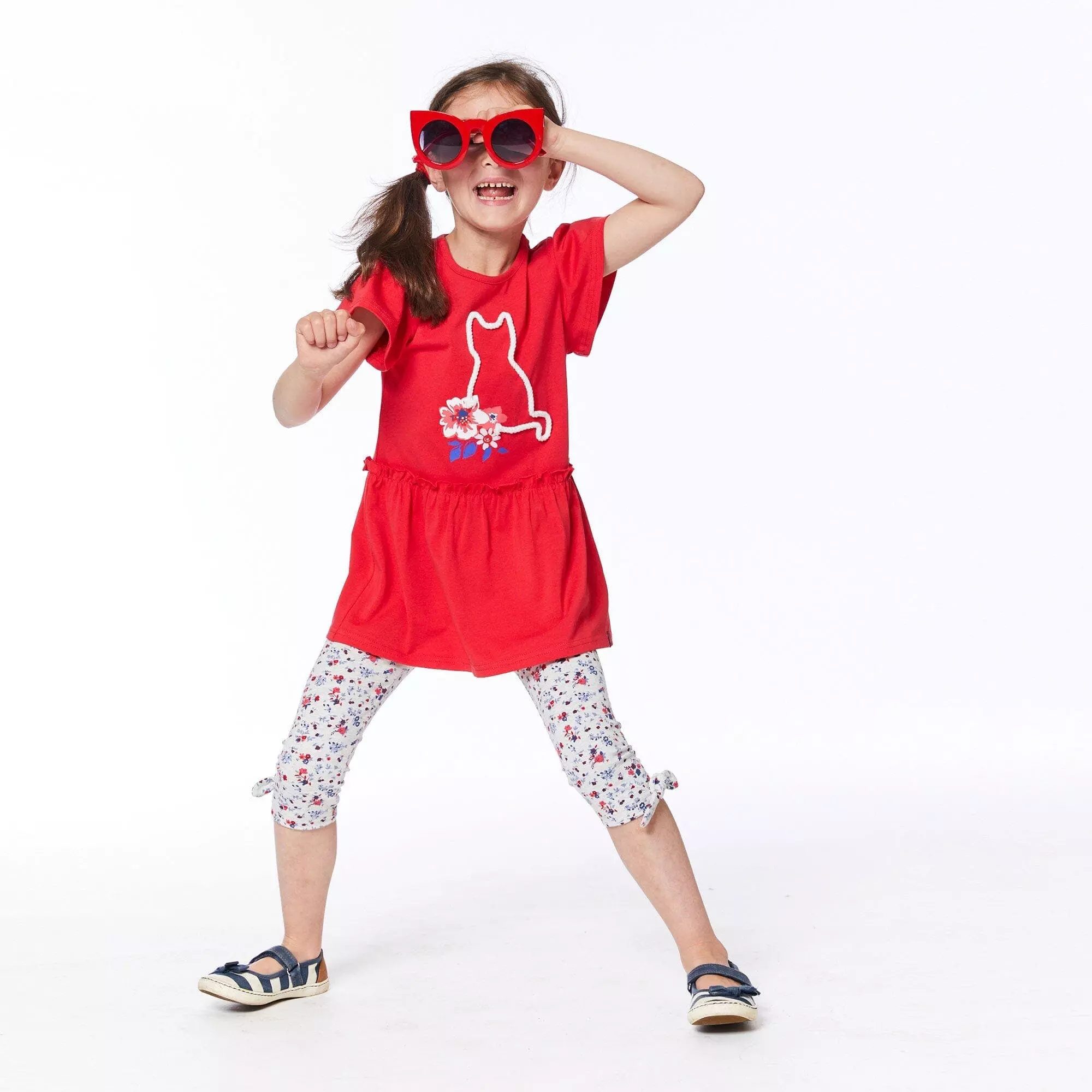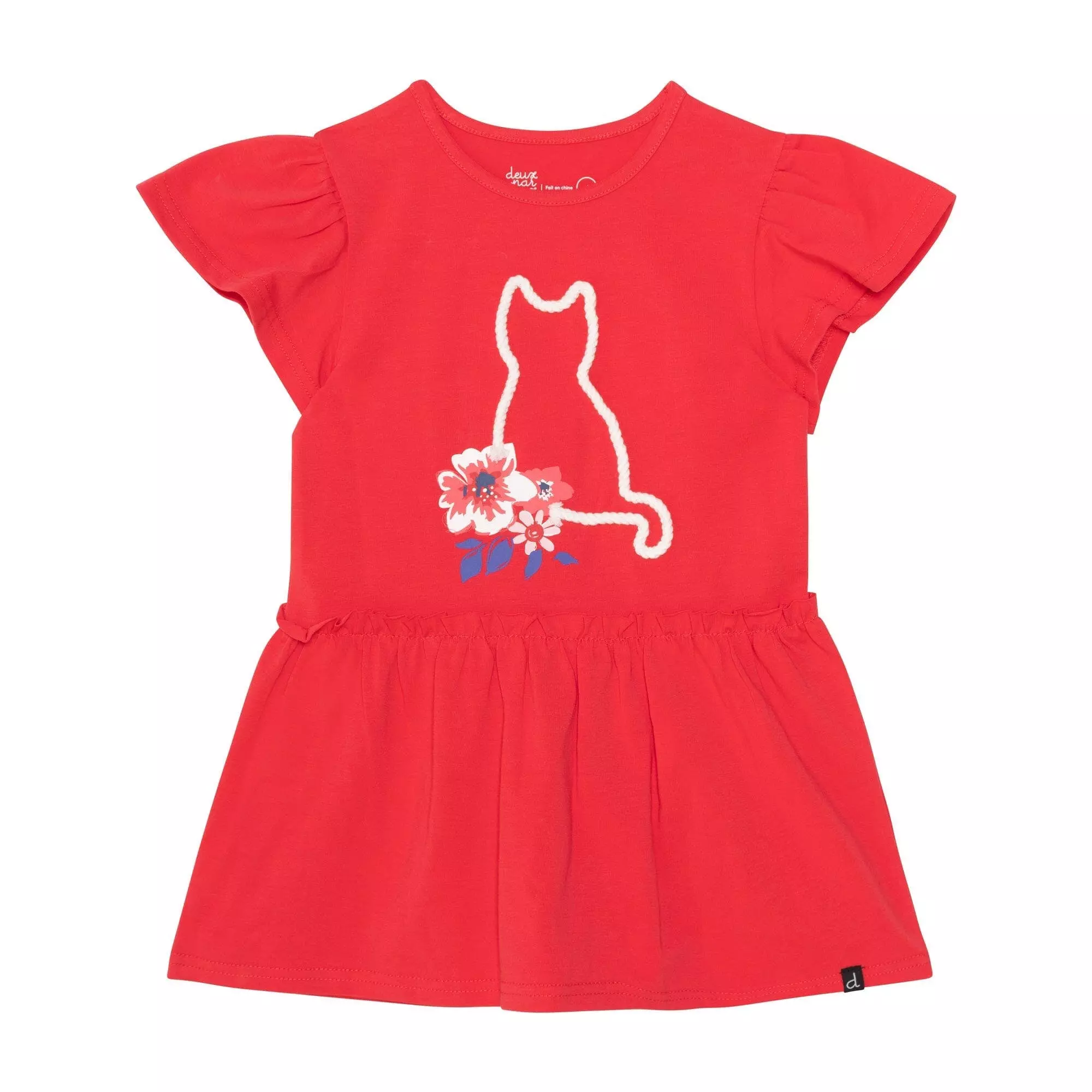She’s sure to enjoy the sweet styling and comfortable fit of this Organic Cotton Short Sleeve Graphic Tunic Red. This stretch cotton top features short flutter sleeves, a round neckline, an elastic waistband that creates a ruffled effect, and a cat graphic on the chest. Pair it with any of the shorts or leggings in Deux Par Deux’s Where Are You Blue Flower? collection.