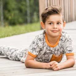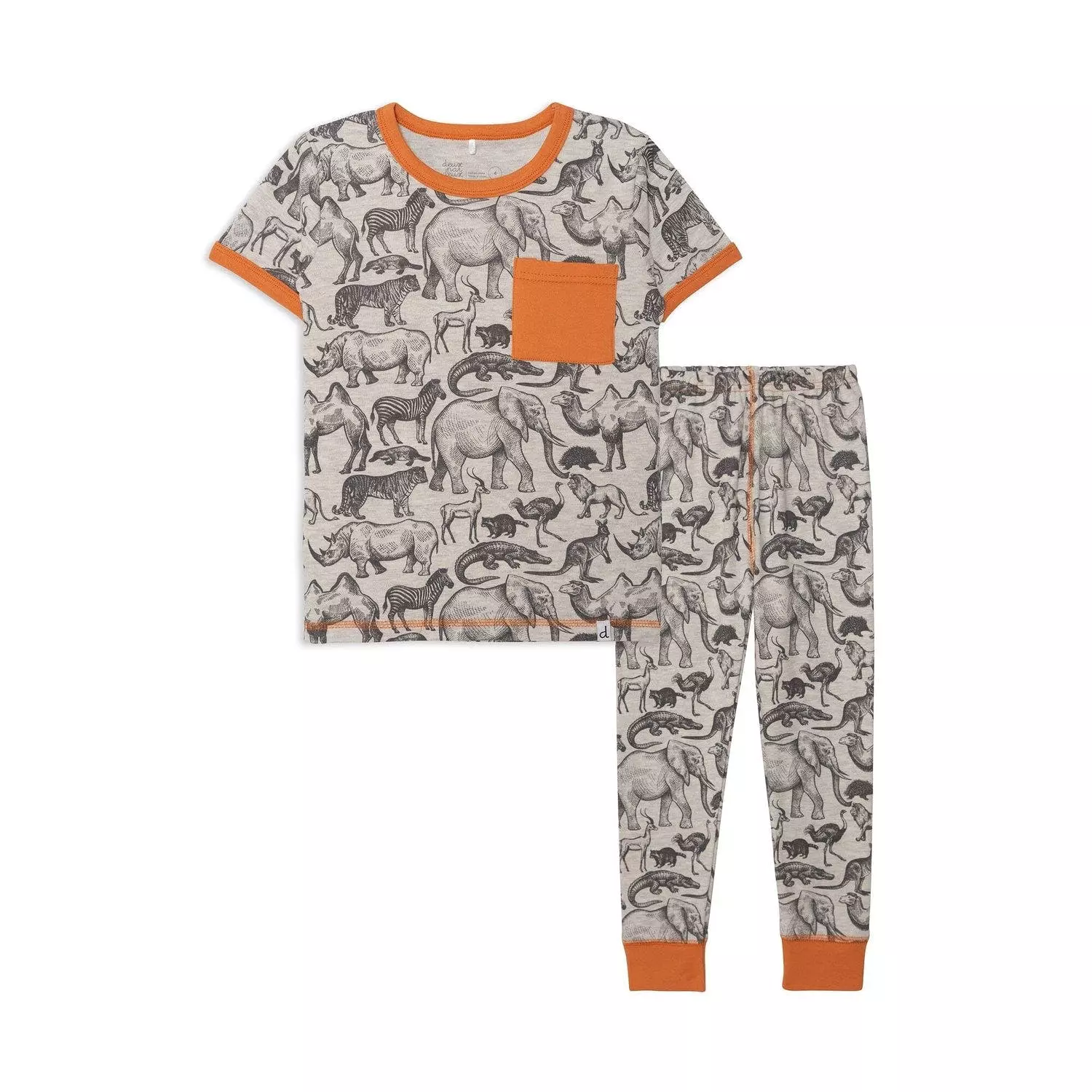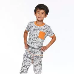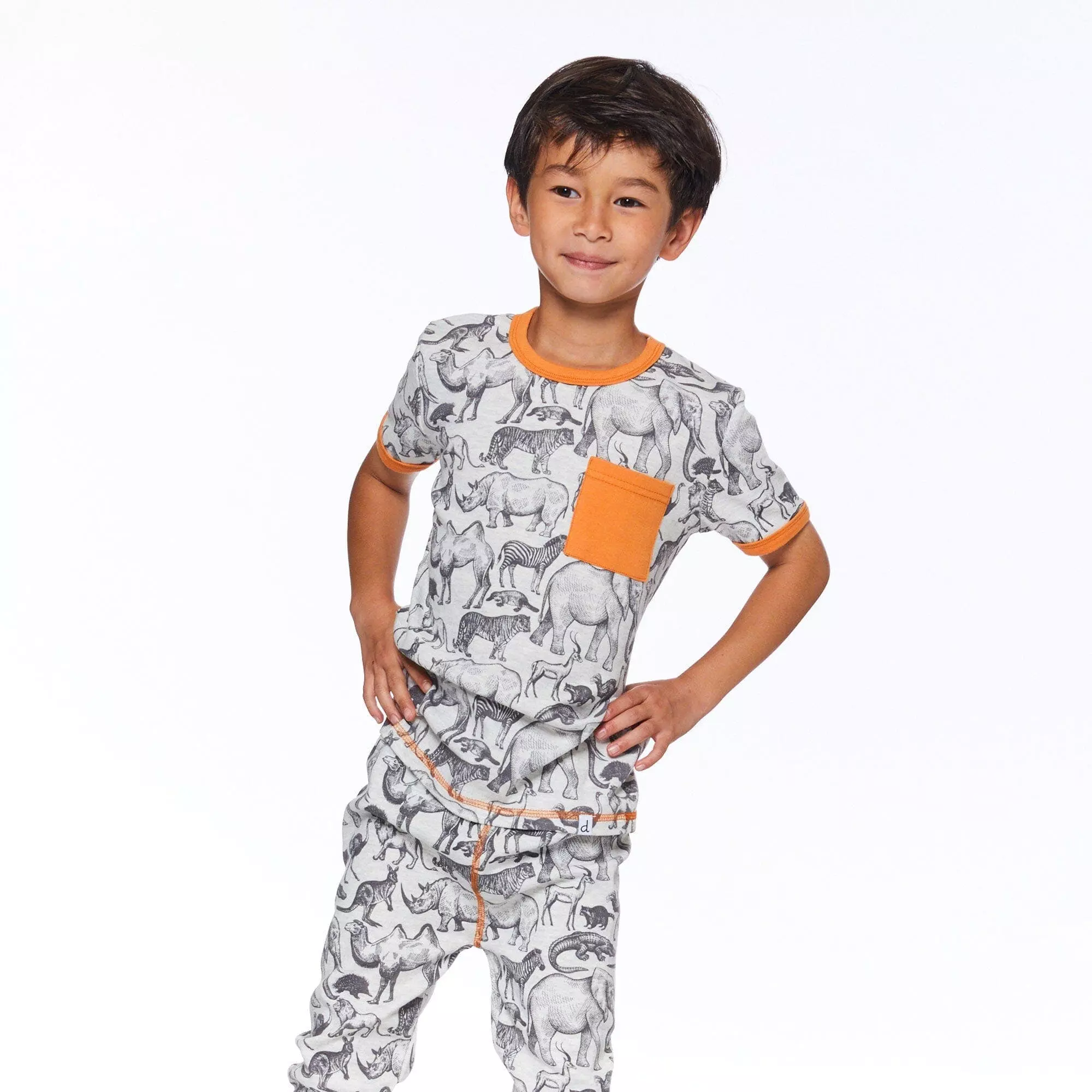A solid patch pocket and solid trim adds a touch of contrast to this allover print pajama set. This Organic Cotton Two Piece Printed Pajama Sett Grey Mix Safari features a short sleeve ringer tee with a crew neckline and a pull-on pant with an elastic waistband. It’s detailed with contrast topstitching and contrast cuffs.