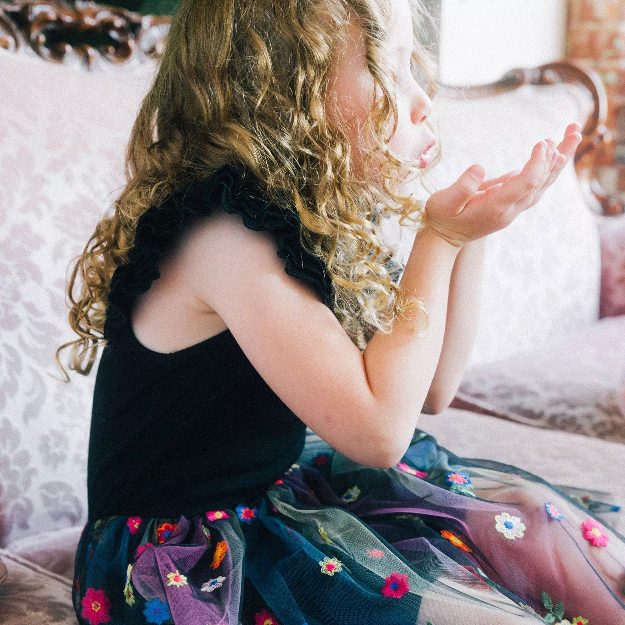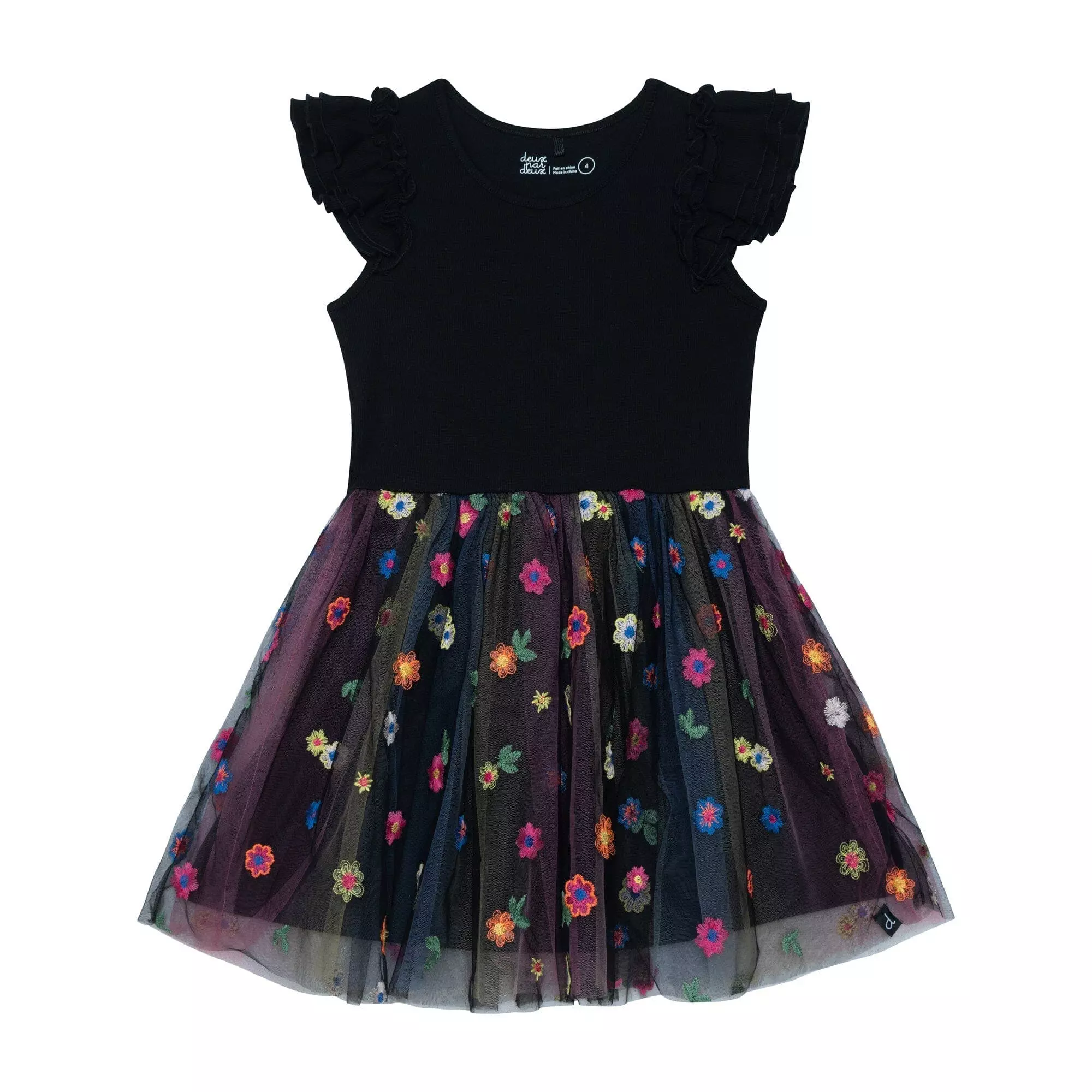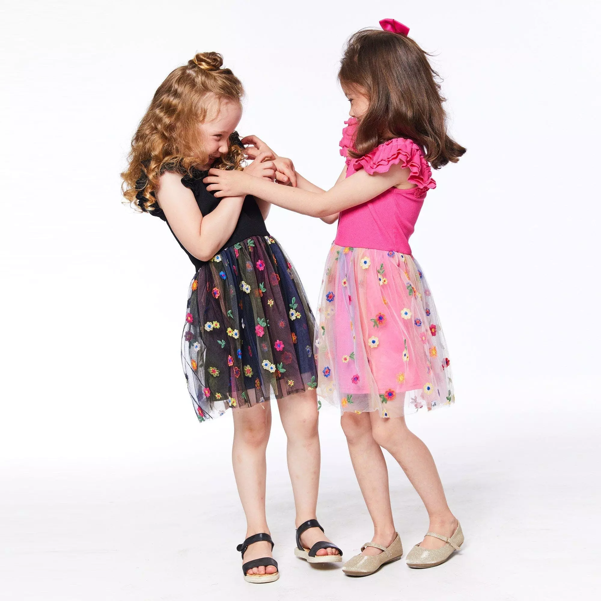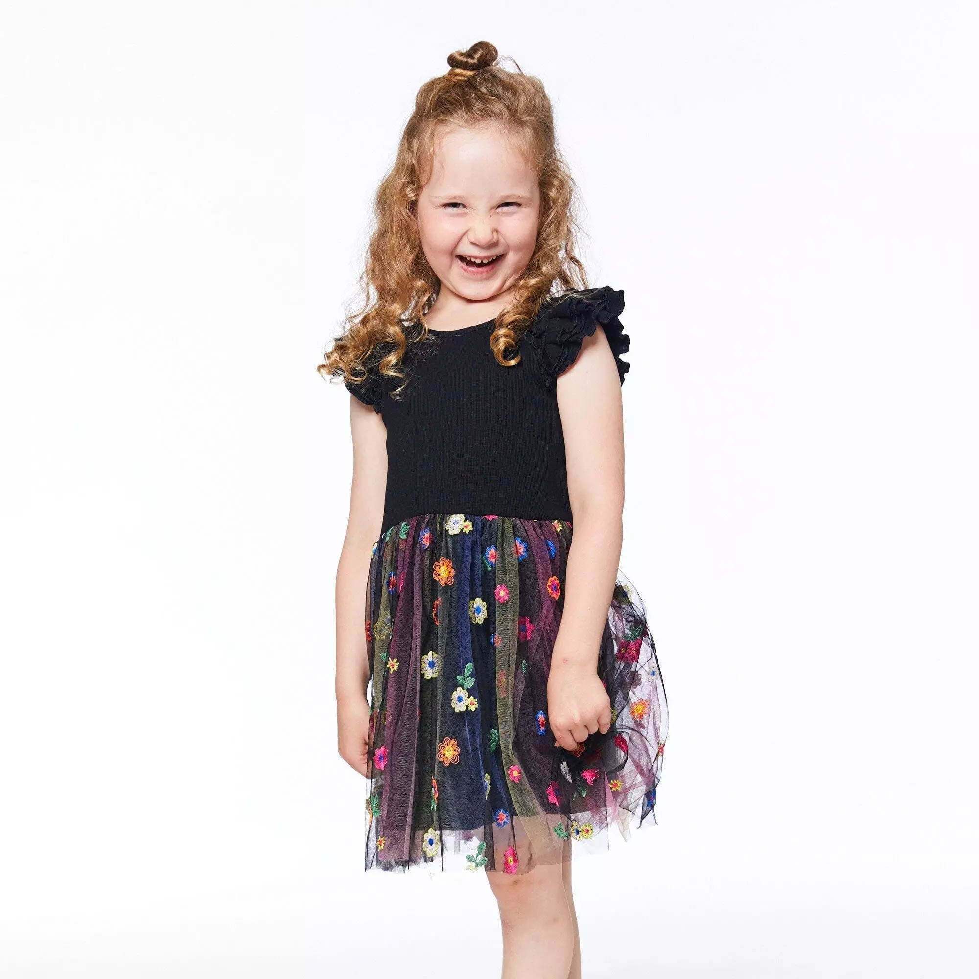 With a flared A-line skirt and soft tulle overlay, she’s sure to adore this Short Sleeve Dress With Embroidered Tulle Skirt Black With Multicolor Flowers. This adorable special occasion dress features a short sleeve cotton bodice with layered, ruffled sleeves and a round neckline. The skirt is detailed with a soft tulle layer with a floral print, making it a charming choice for any party or special occasion.