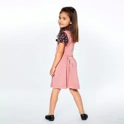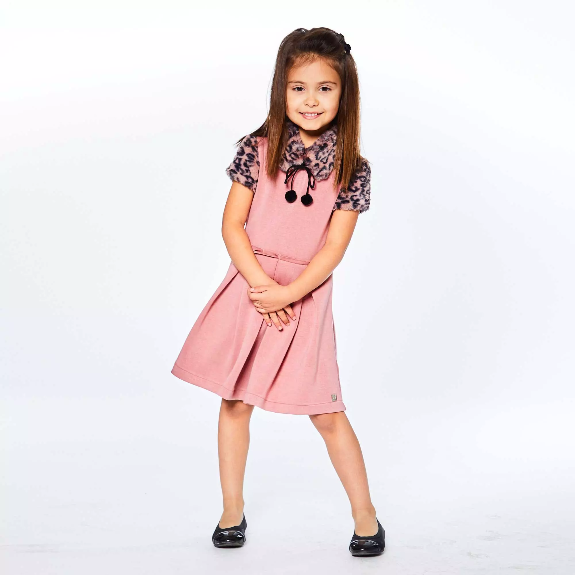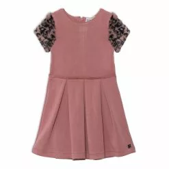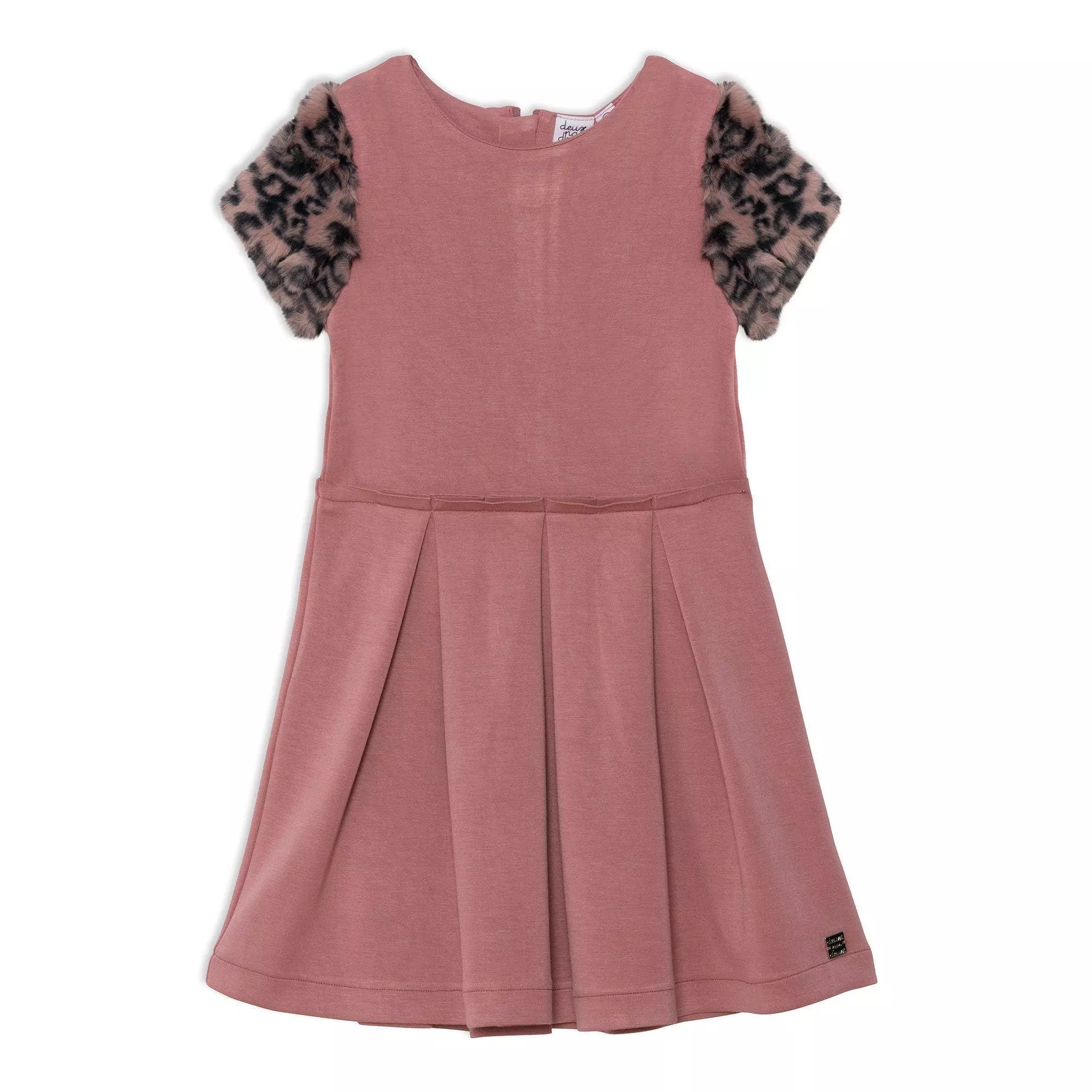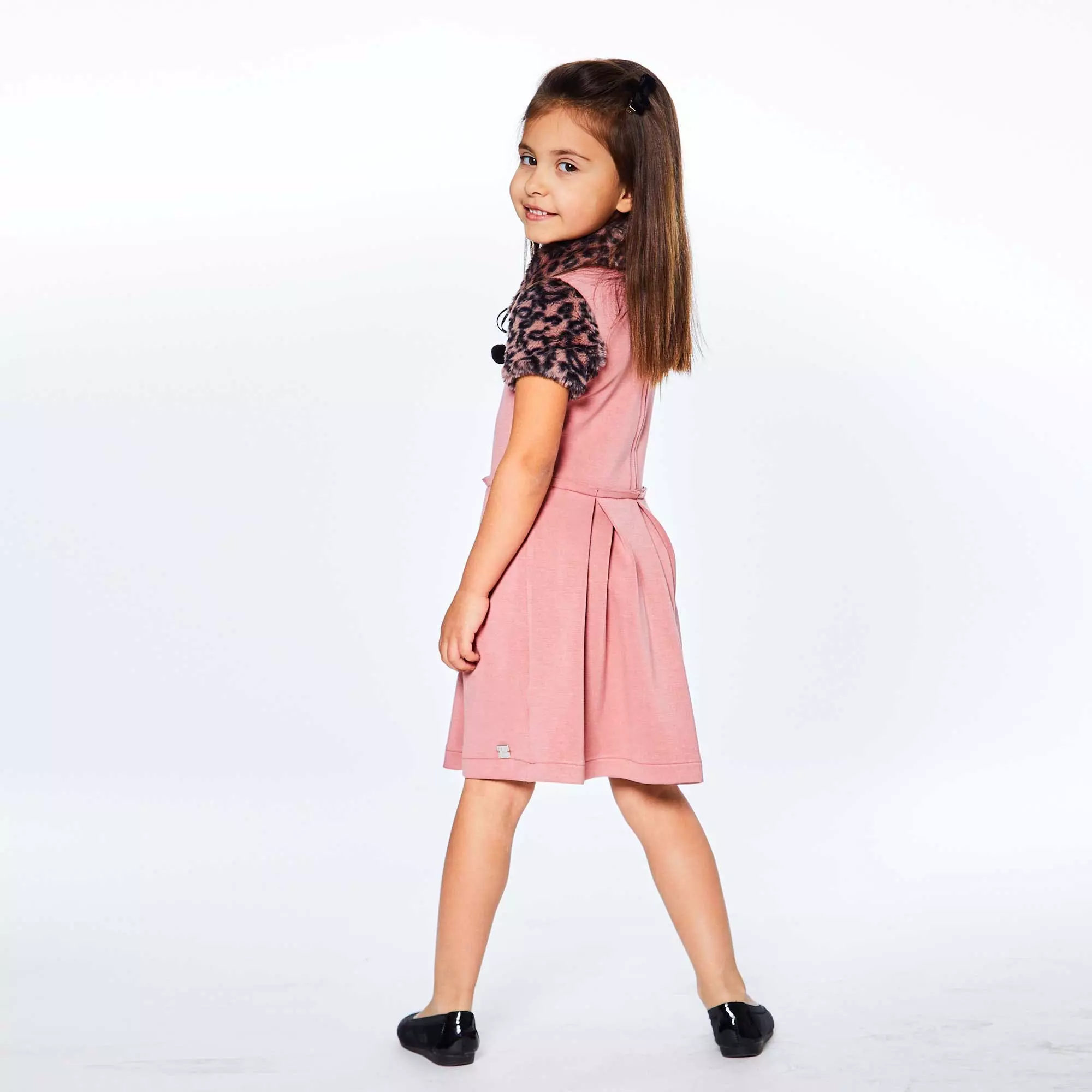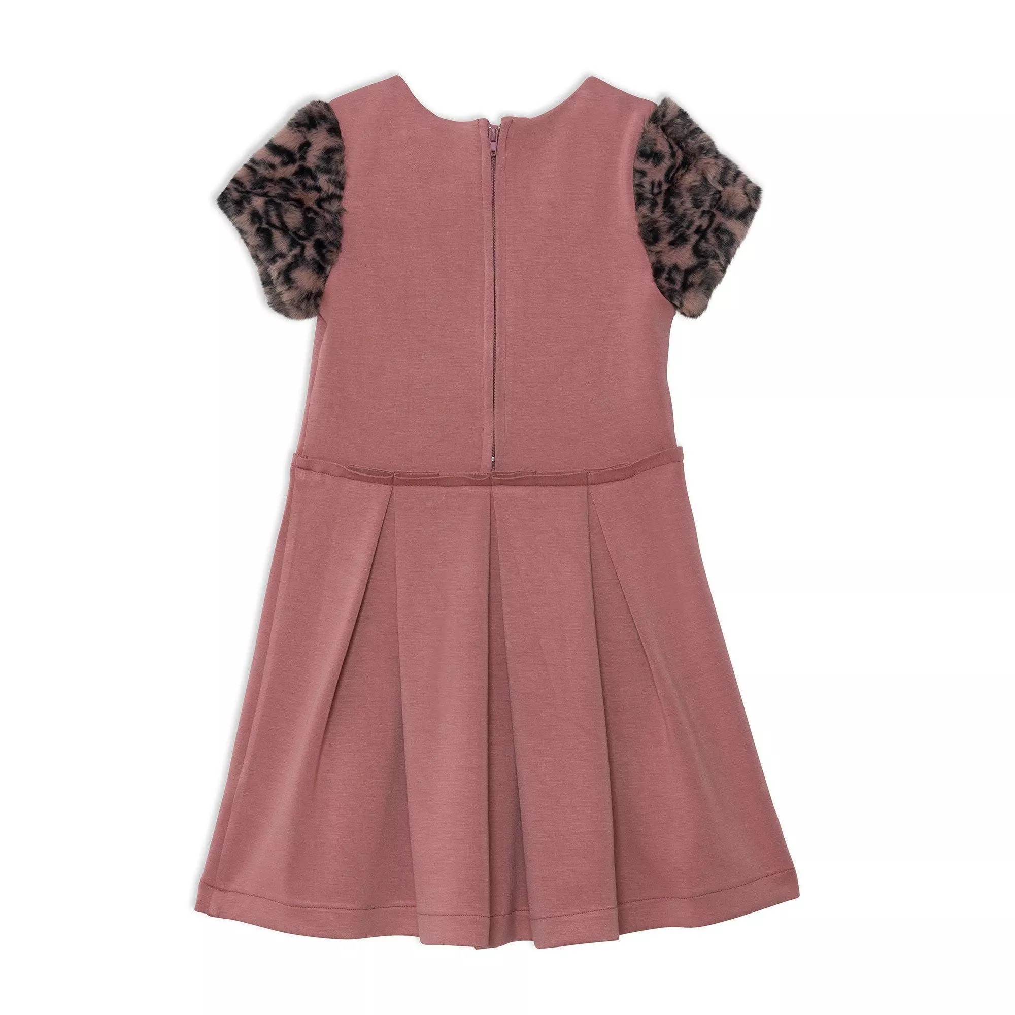 Faux fur sleeves add distinctive style to this pleated A-line dress. This Short Sleeve Fake Fur Dress is made from a soft poly/viscose/elastane blend and features animal print sleeves, a round neckline, and a pleated skirt. It includes a detachable faux fur collar with pompom ties.