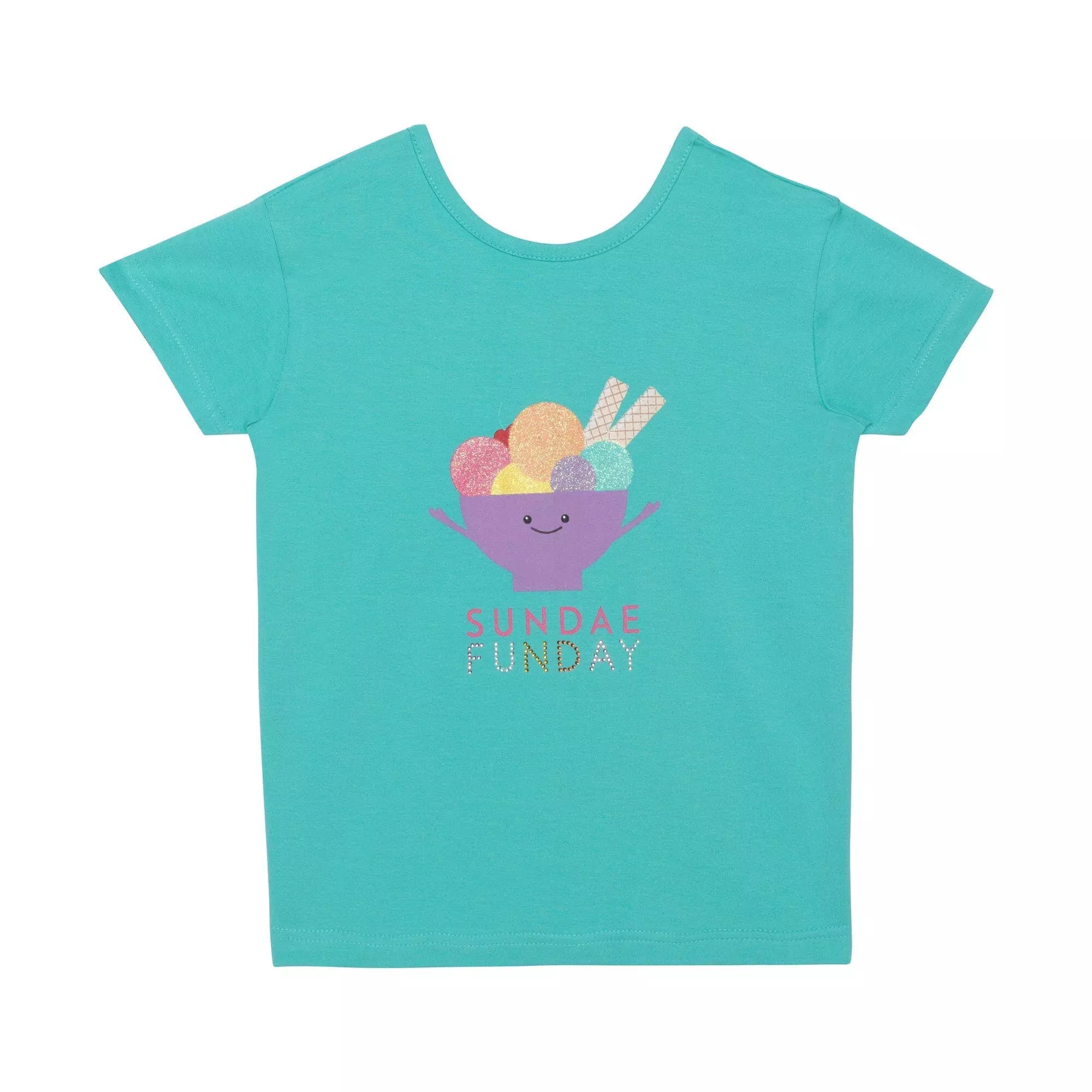 Nothing screams spring like this Short Sleeve Top With Back Detail Turquoise. This cotton tee is simply darling in a short sleeve silhouette with a round neckline, a gathered V-back, and an ice cream sundae print on the chest. It’s an easy match to any bottom in the life is an ice cream collection.
