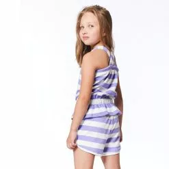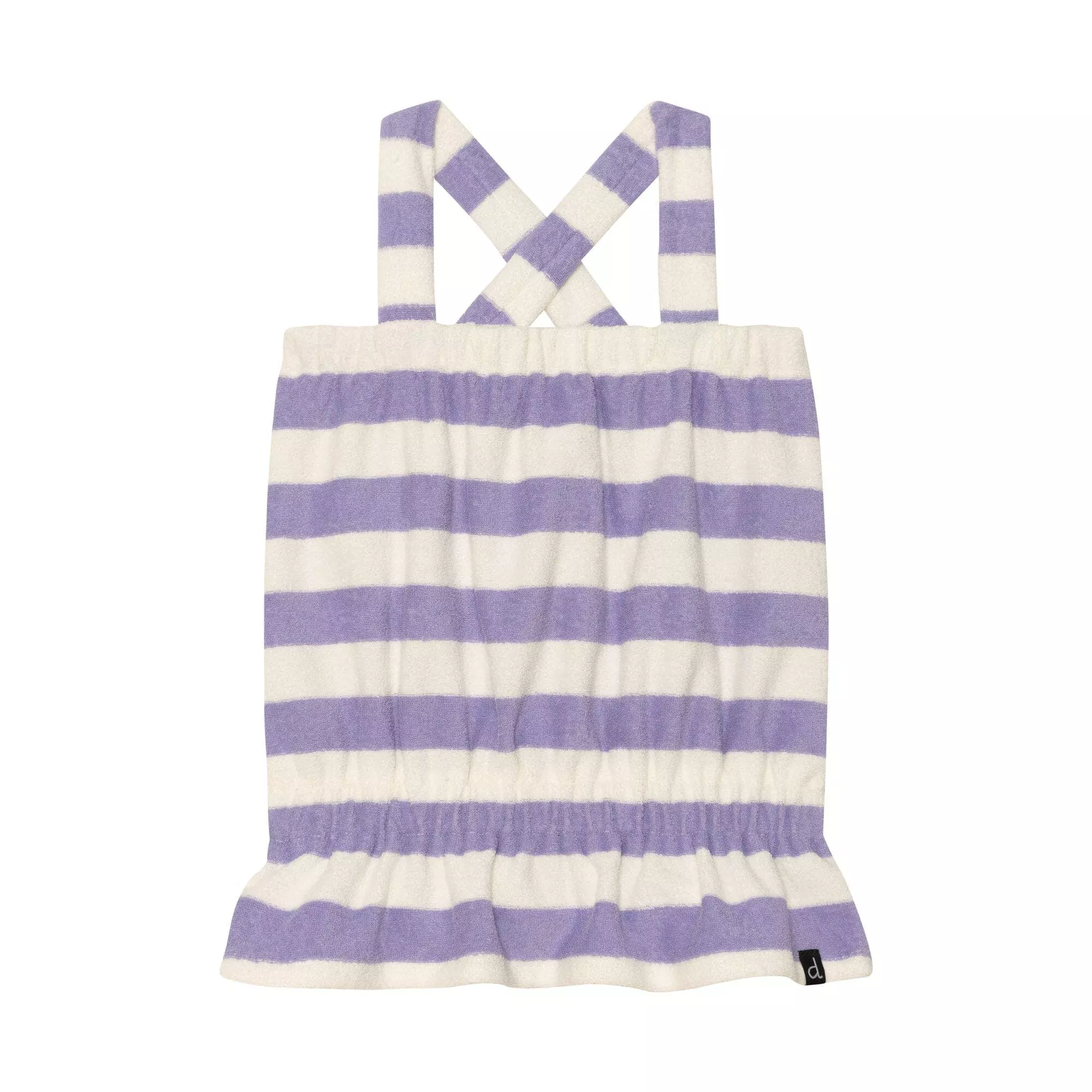 A flared peplum hem adds ultra-girly attitude to Striped Basic Tank Top Violet and White. This terry cloth tank is made from a soft cotton/poly blend and features a square neckline, flat straps that crisscross in back and a stretch elastic waistband.