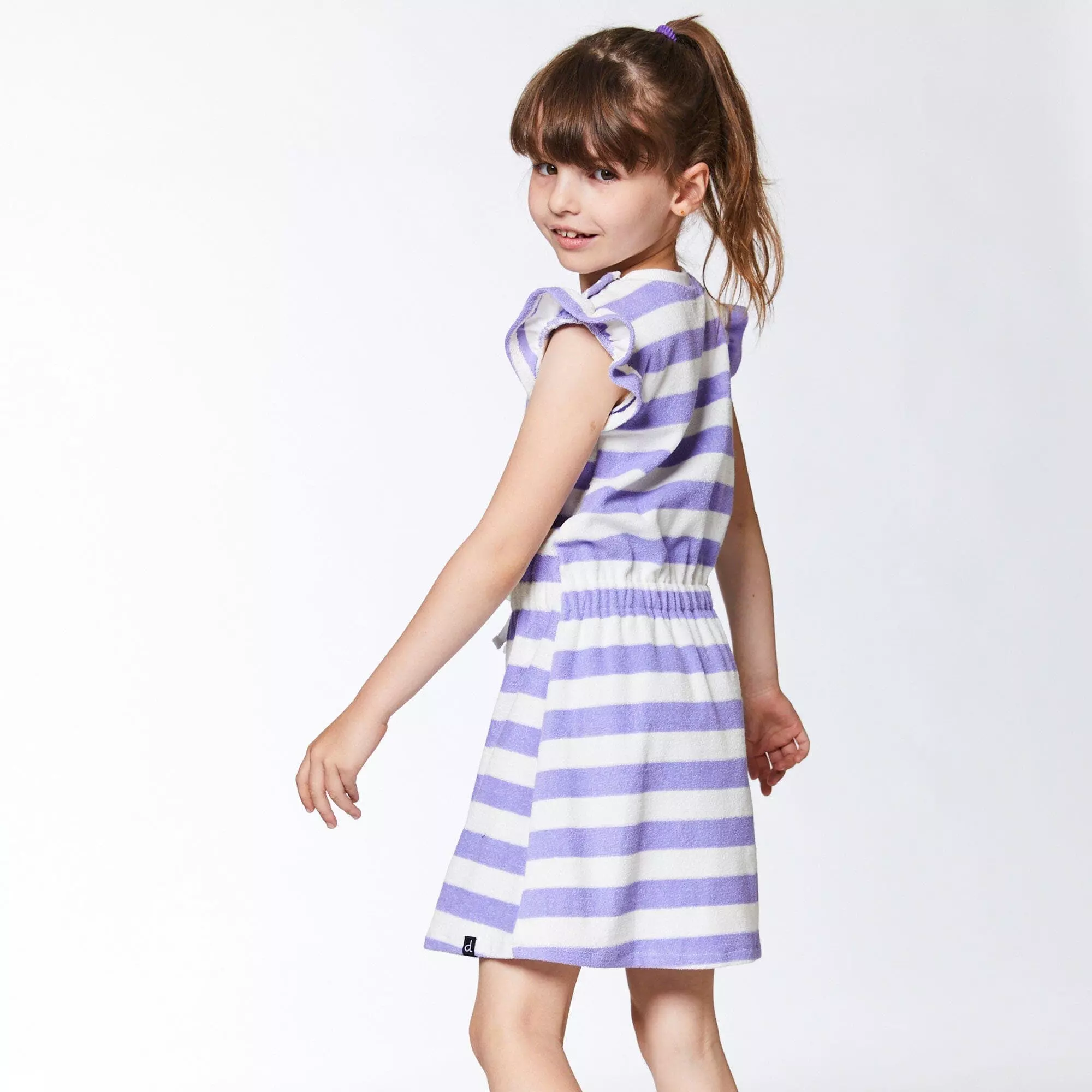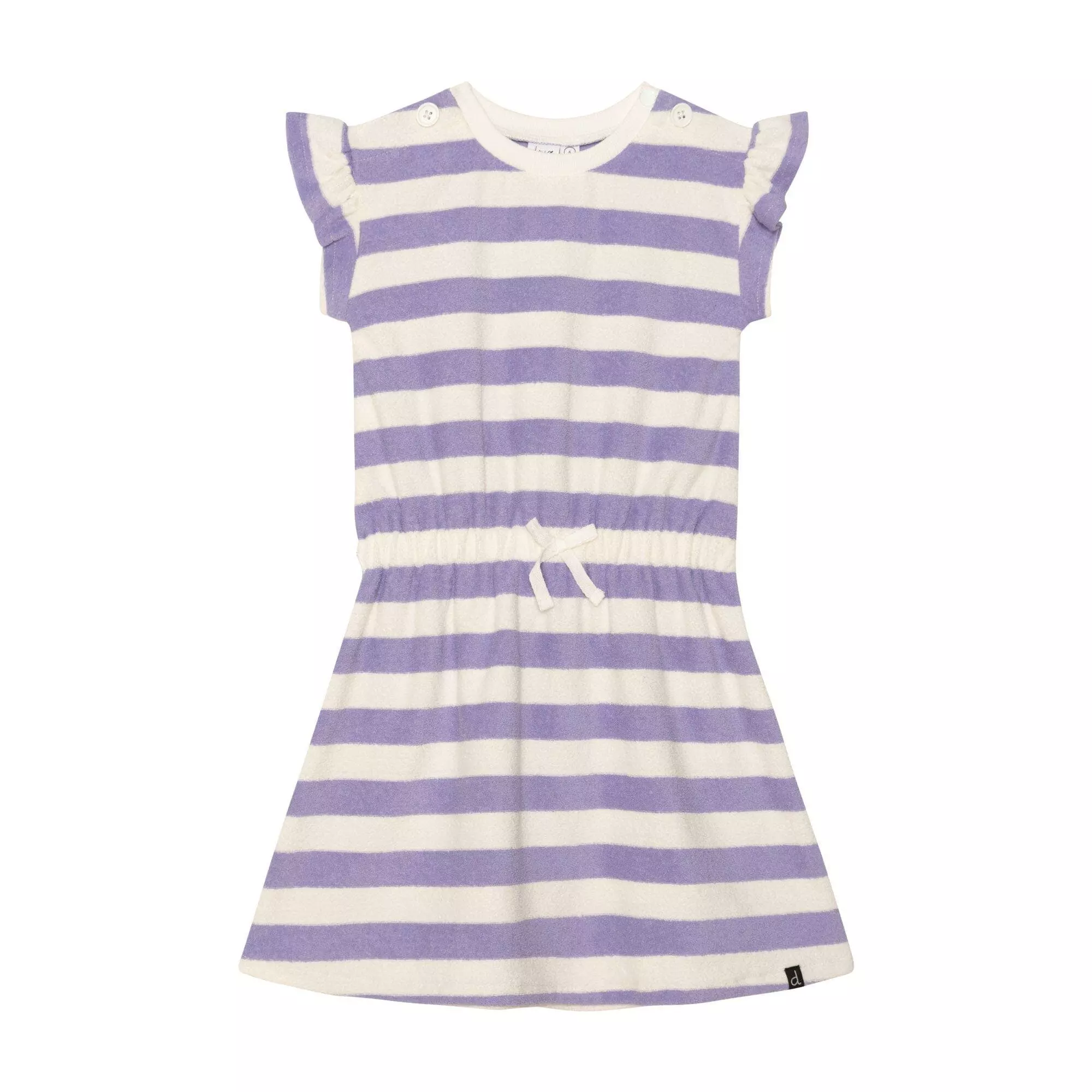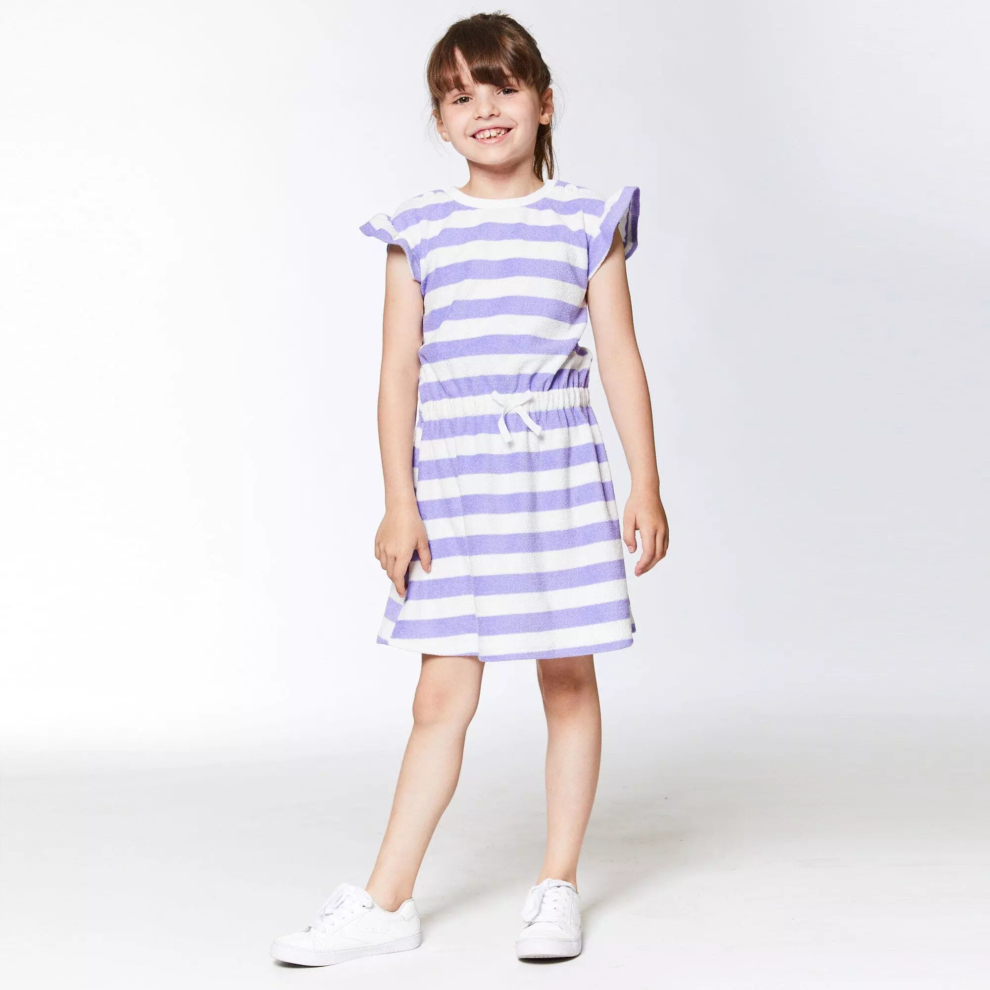 With flutter sleeves and a flared skirt, this terry cloth dress is a perfect choice for any casual spring or summer occasion. The Striped Short Sleeve Dress Violet and White features allover horizontal stripes in a sporty silhouette with a drawstring elastic waistband, a round neckline, and short sleeves