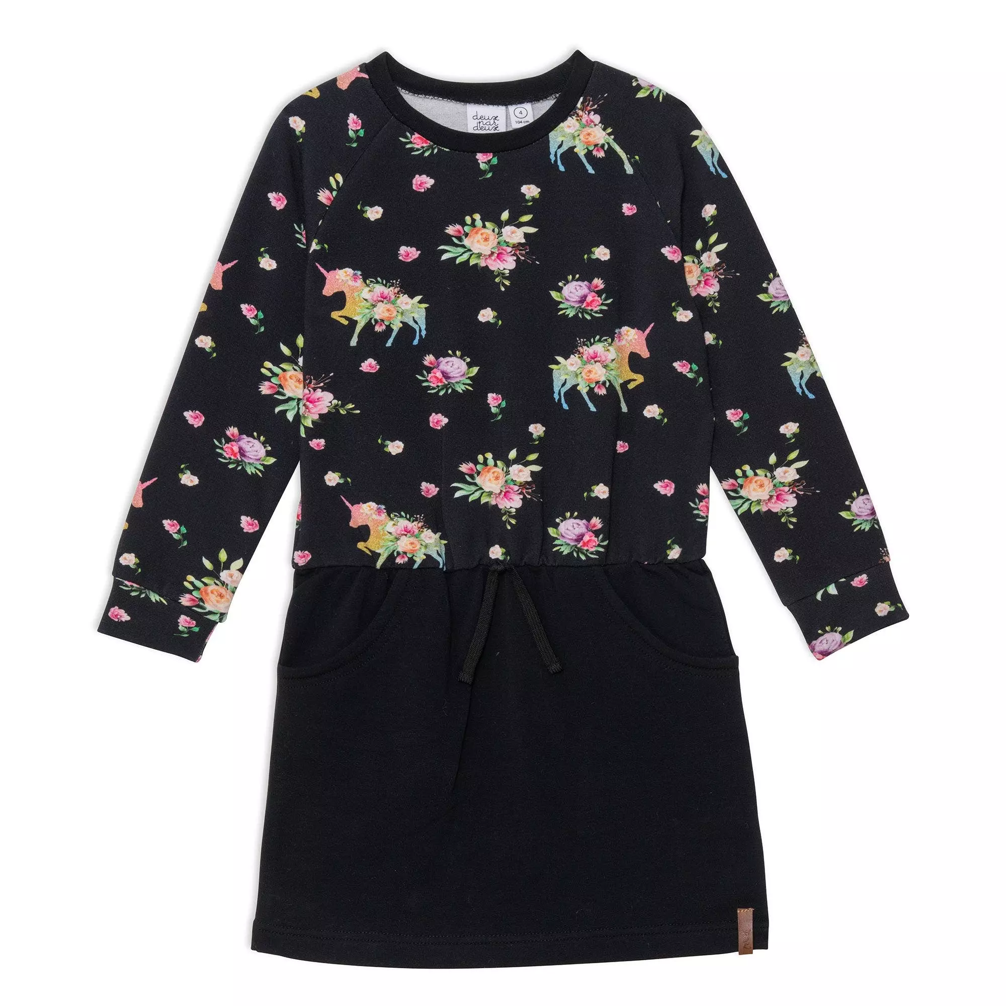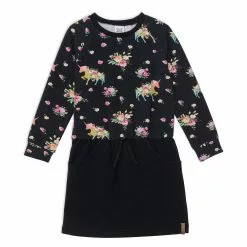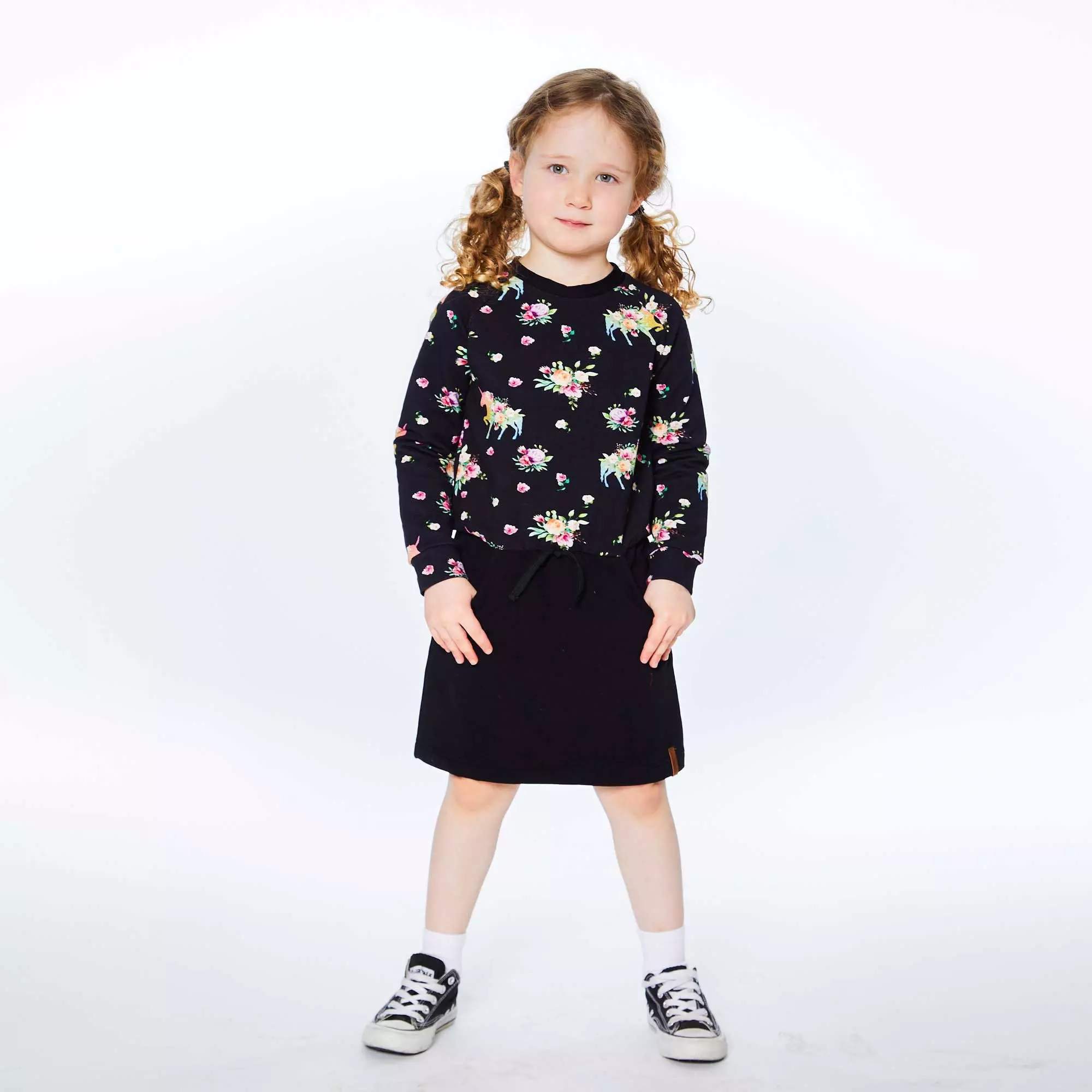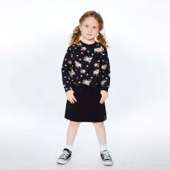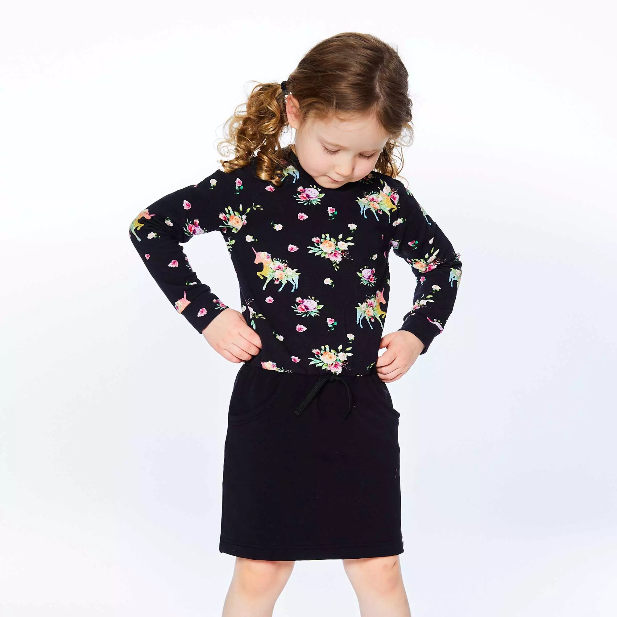 An elastic waistband makes this Unicorn Printed Raglan Long Sleeve Dress a cute and comfortable addition to any little girl’s wardrobe. This casual dress is made from a cotton/elastane blend and features long sleeves, a round neckline, an allover print bodice, and a solid skirt with a bow at the waist.