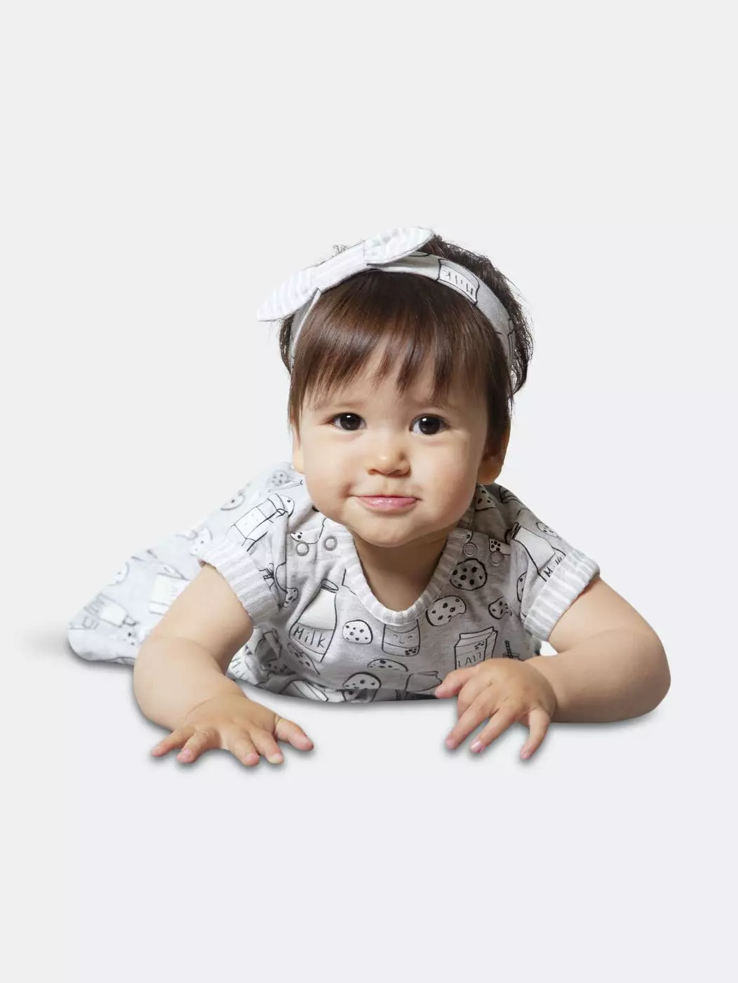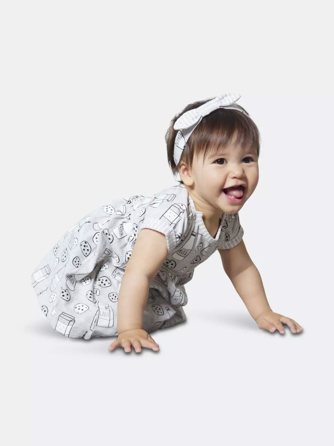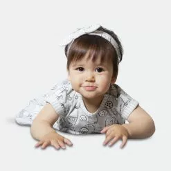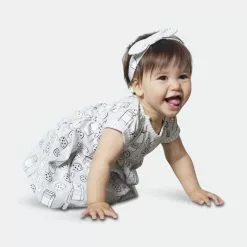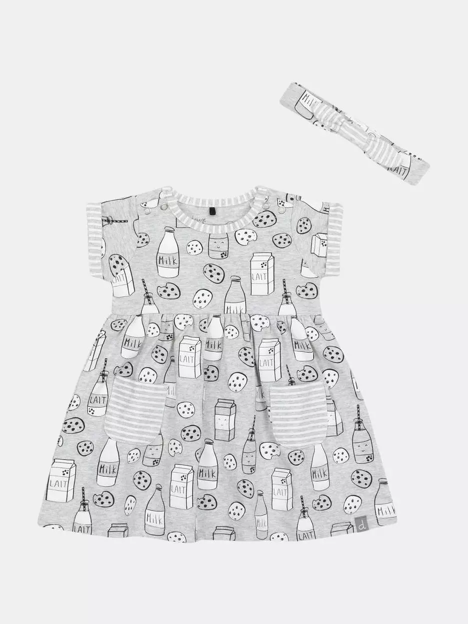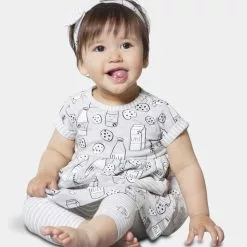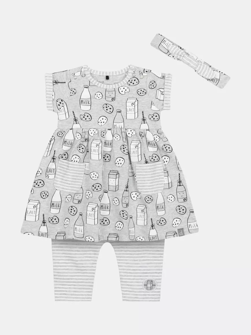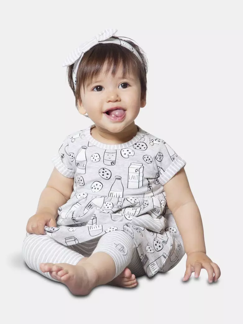 Featuring an allover print with milk bottles, milk cartons, and chocolate chip cookies, the Printed “Milky Tummy” Dress & Striped Capri Legging Set is as perfect a pair as the milk and cookie print upon it. Soft and comfortable in organic cotton, this set features a short sleeve flared dress with cuffed short sleeves, a round neckline, patch pockets, and a shirred waist. Striped leggings with an elastic waistband and a matching bow headband complete this adorable look.