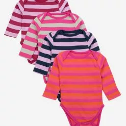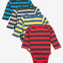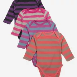 Stripes are a loved classic print. Our Baby Cotton Bodysuits Striped 4-Pack comes in four color combination sets. These bodysuits are made from 100% natural cotton and should be washed inside out in warm water to minimize shrinkage. Our tagless design features a lapped shoulder and stretchy soft fabric to assure their comfort. These onesies are perfect for layering and playtime! Be sure to check out our matching striped patterns for the whole family.