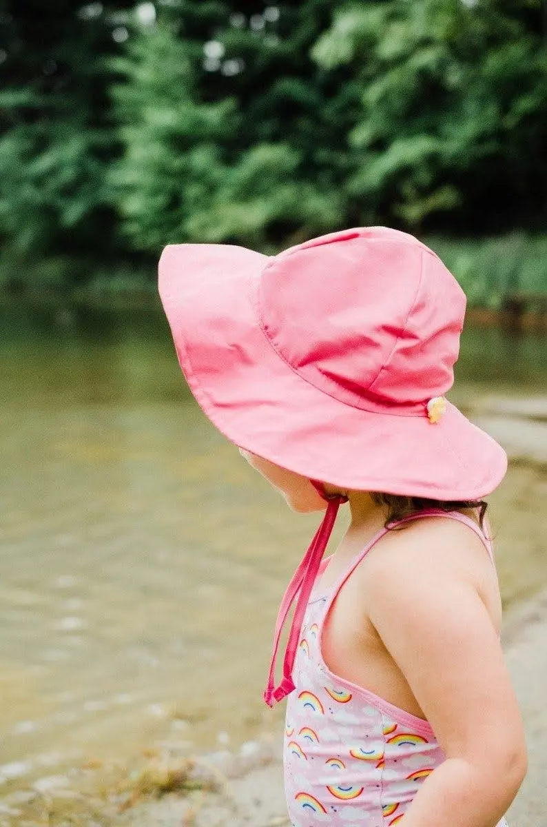 The perfect hat for your outdoor adventures! Our Baby Toddler Brim Swim Hat will protect sensitive eyes and skin from the suns UV rays. Our hat is available in thirteen colors and is made from water-resistant UPF 50+ fabric. To prevent damage to this unique fabric, be sure to wash your hat in cold water. Our adjustable chin and head straps keep the hat secure and snug. The 0-9 month size does not feature the adjustable chin strap for safety. Be sure to measure your baby’s head for the perfect fit. To do so, measure around the forehead just above the eyebrows to the back of the head. The Baby Toddler Flap Swim Hat is perfect for travel and will quickly become a diaper bag essential!