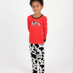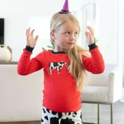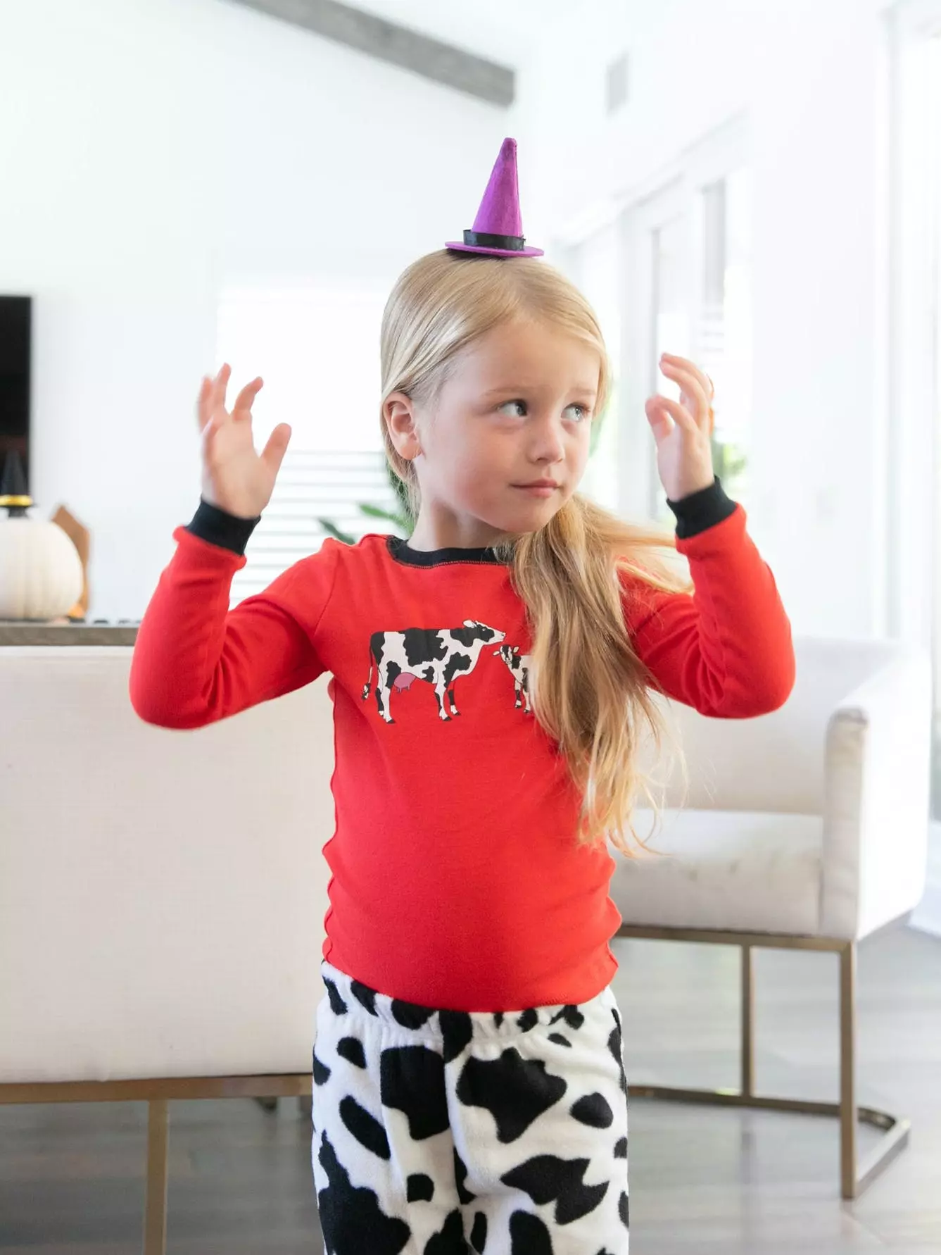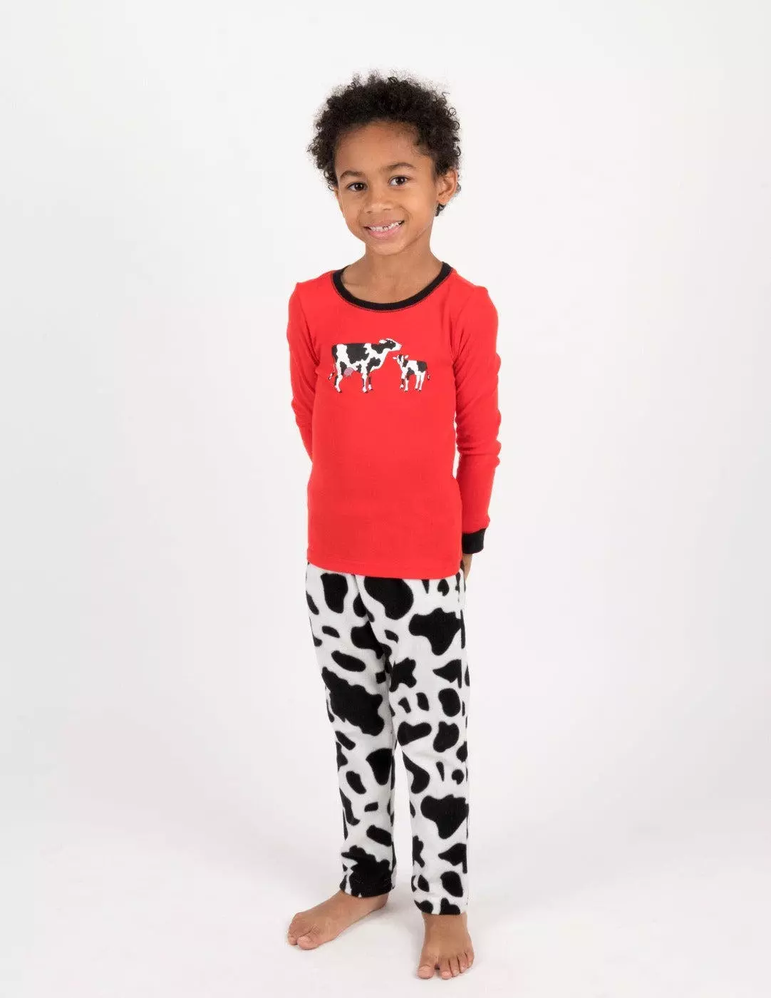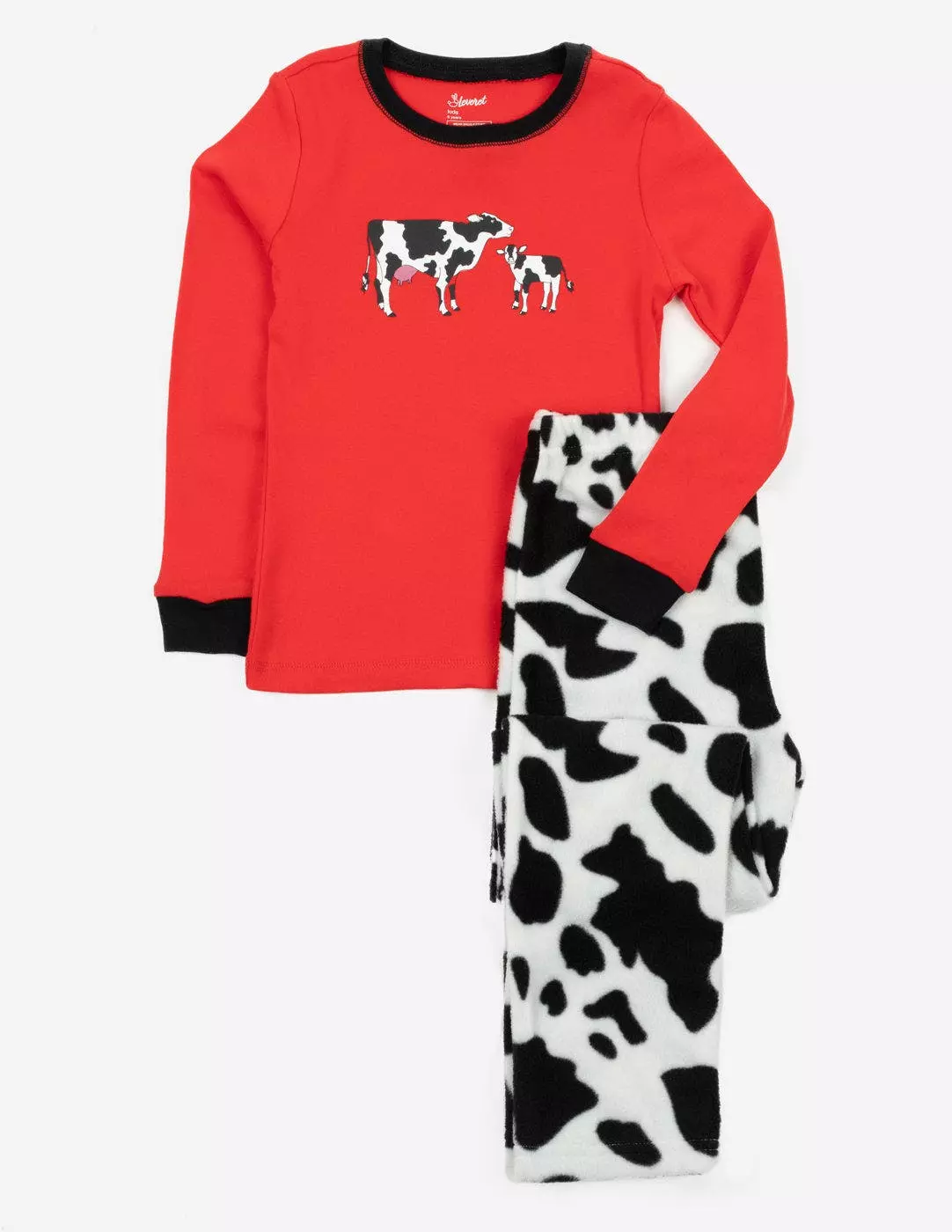 Your little farmer will love our cute cotton & fleece cow print pajamas! They are tagless and made from ultra-soft 100% cotton (top) and cozy warm 180% gsm fleece (bottom). The top is free of flame retardants and fits snug safety, while the cow print bottoms are flame resistant. If you prefer a looser fit, please order one size up. To keep your jammies beautiful and prevent potential shrinkage, wash them inside out in cold water. Our cotton & fleece cow print pajamas are perfect for sleep and play. Have the whole family match with our cow patterns for babies, adults, pets, and even dolls!