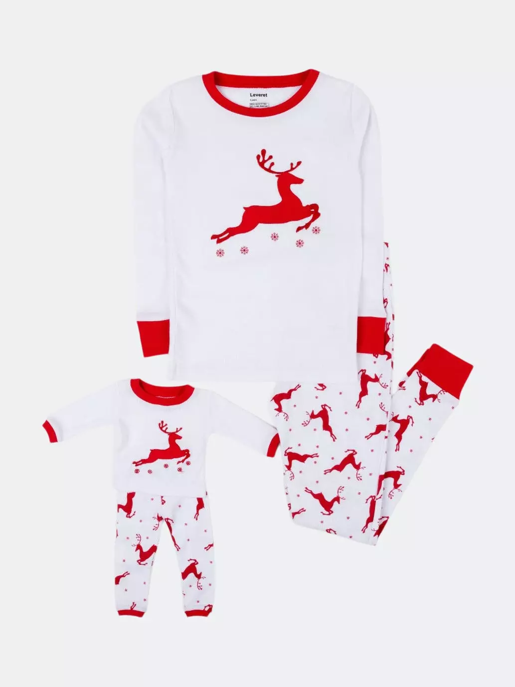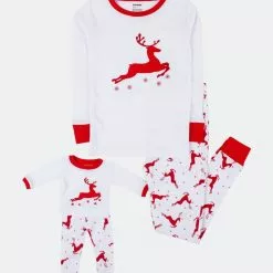 Get in the holiday spirit with our super cute Christmas pajamas for your little one and their doll. Our Matching Girl & Doll Christmas Pajamas come in two adorable varieties: Pink Santa and Reindeer White Red. Our pajamas are made from breathable 100% GOTS-certified cotton and feature a tagless design for the ultimate comfort. They are free from fire-retardant chemicals and fit snug for safety. If you like your jammies to have a looser fit, be sure to order one size up. To minimize shrinkage and protect your Christmas prints, be sure to wash the pajamas inside out and in cold water. Our doll jammies will fit an 18″ doll similar to the American Girl® Dolls. This set is lightweight yet warm, so they are perfect for layering in cool weather as well as for play and sleep. Take a look at our matching holiday pajamas for the whole family!