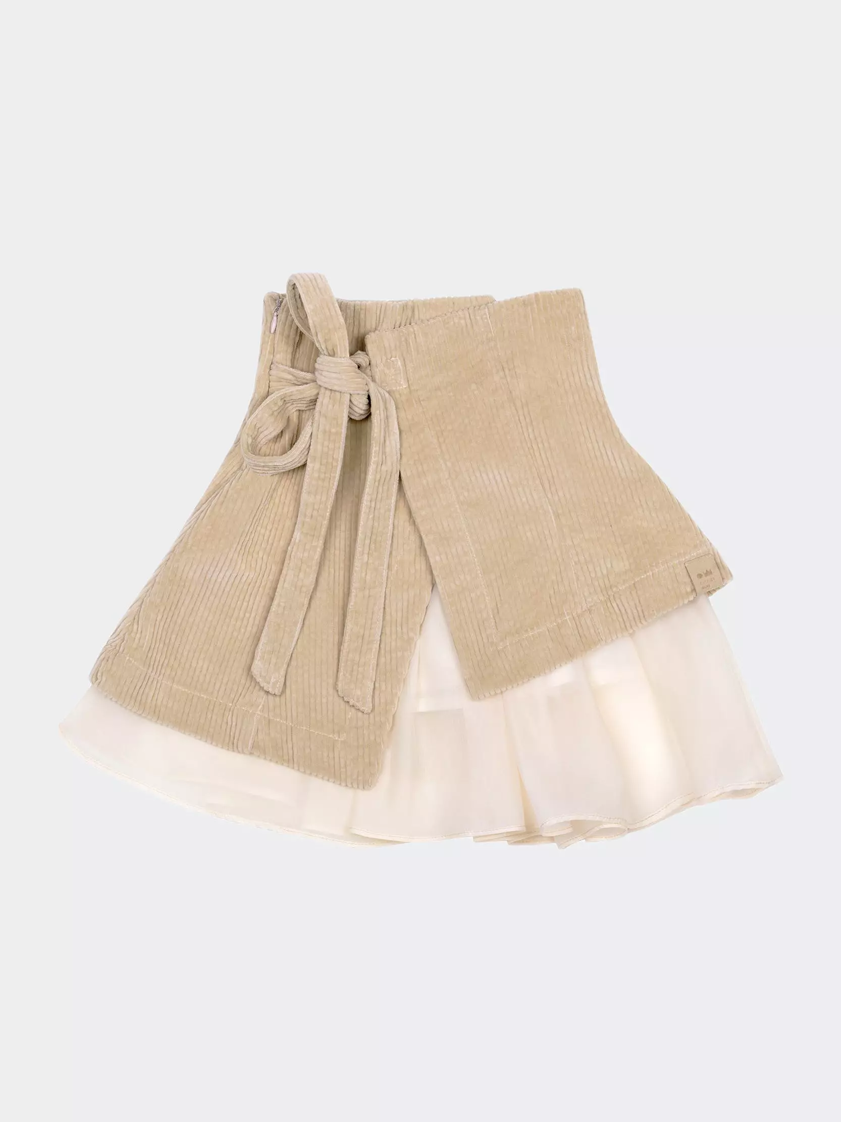 Your new go-to everyday edgy favorite. This sophisticated wrap-around corduroy skirt is layered with a matching color organza and features side zipper and ties for the adjustable fit. Hits above the knee.