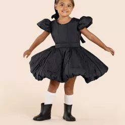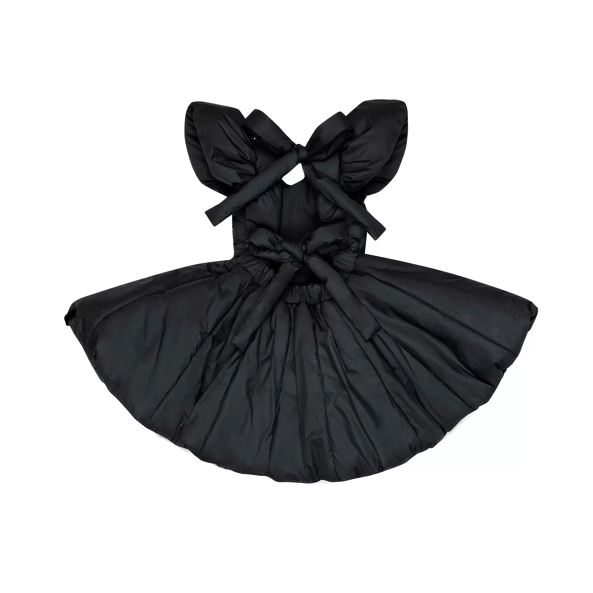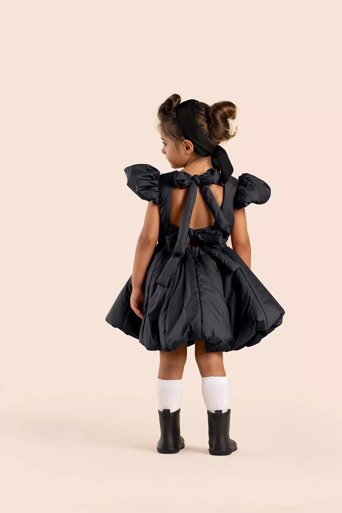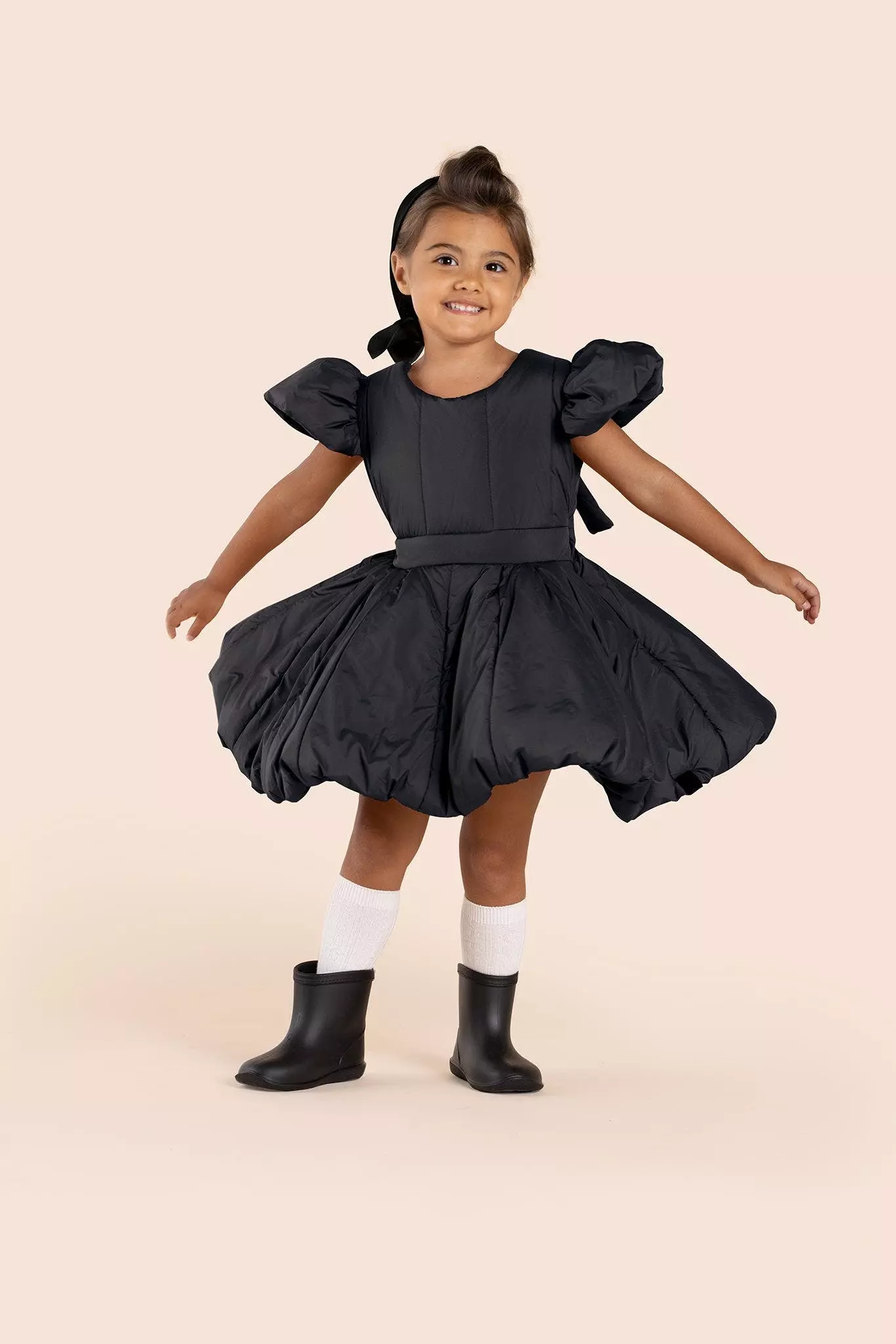 However you style it, with a sweatshirt underneath, short sleeve tee under and cardigan over – we’re huge fans of this unique number. Featuring little cap sleeves and bow ties at the back, generously shirred skirt and super soft quilted cotton jersey lining it’s a sure show stopper.