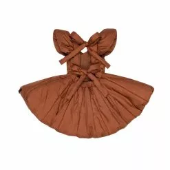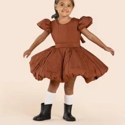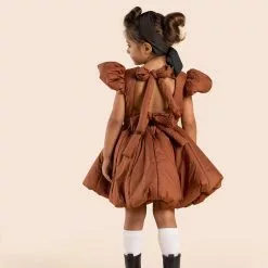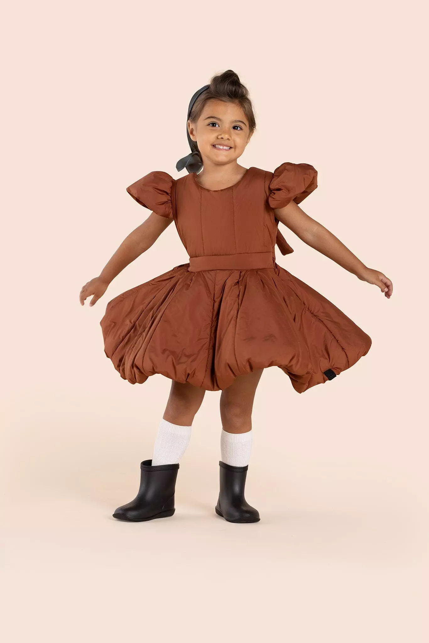 However you style it, with a sweatshirt underneath, short sleeve tee under and cardigan over – we’re huge fans of this unique number. Featuring little cap sleeves and bow ties at the back, generously shirred skirt and super soft quilted cotton jersey lining it’s a sure show stopper.