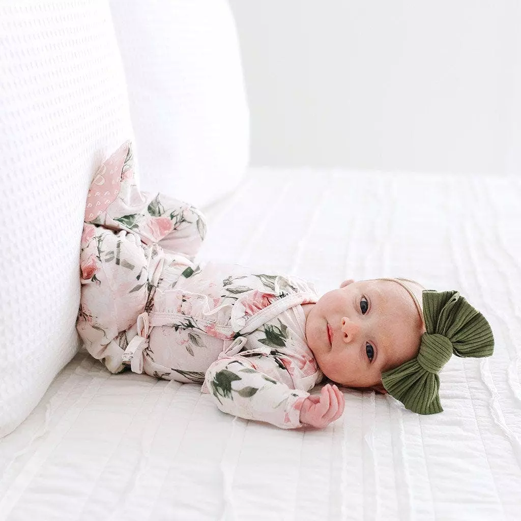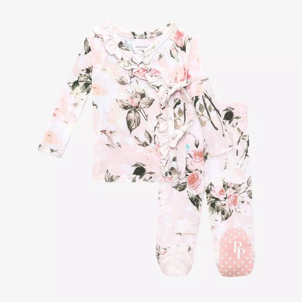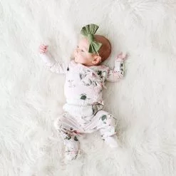 Kimono shirt and matching footed jogger with designer grips set in the coveted viscose from bamboo. Wrap your peanut in style with fold-over kimono-style shirt with tie-front. Kimonos are the perfect comfort outfit with smart wrap design. Fold-over mittens are added for extra protection from self-scratching and extra warmth. Stretchy bamboo is buttery soft and snuggly for newborns.