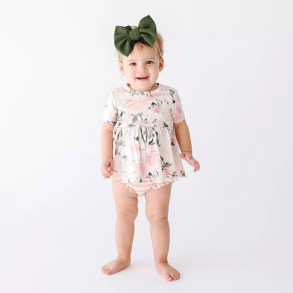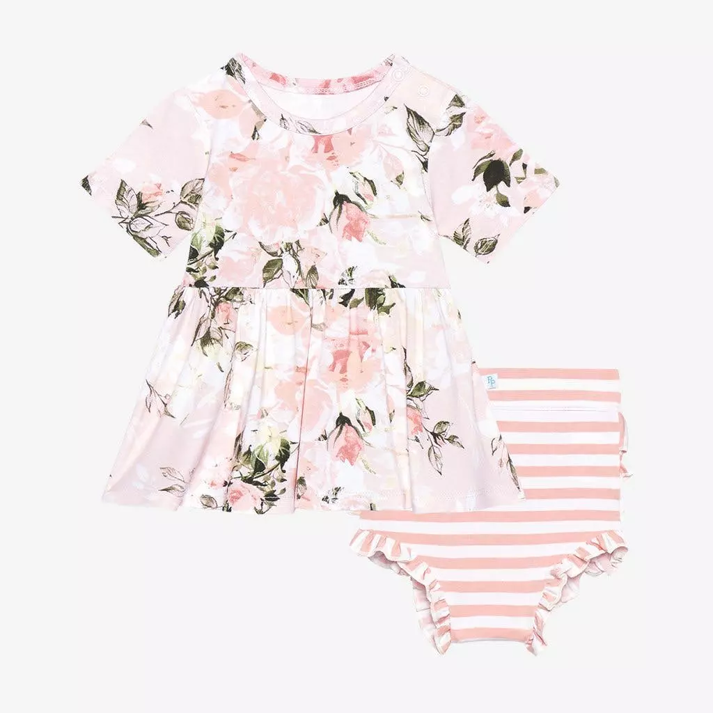 Short sleeve peplum top with scoop neckline and ruffled bummies. This 2-piece set is perfect for cool autumn days in the buttery soft viscose from bamboo. Mix and match with this Vintage Pink Rose collection. Comfort without compromising style.