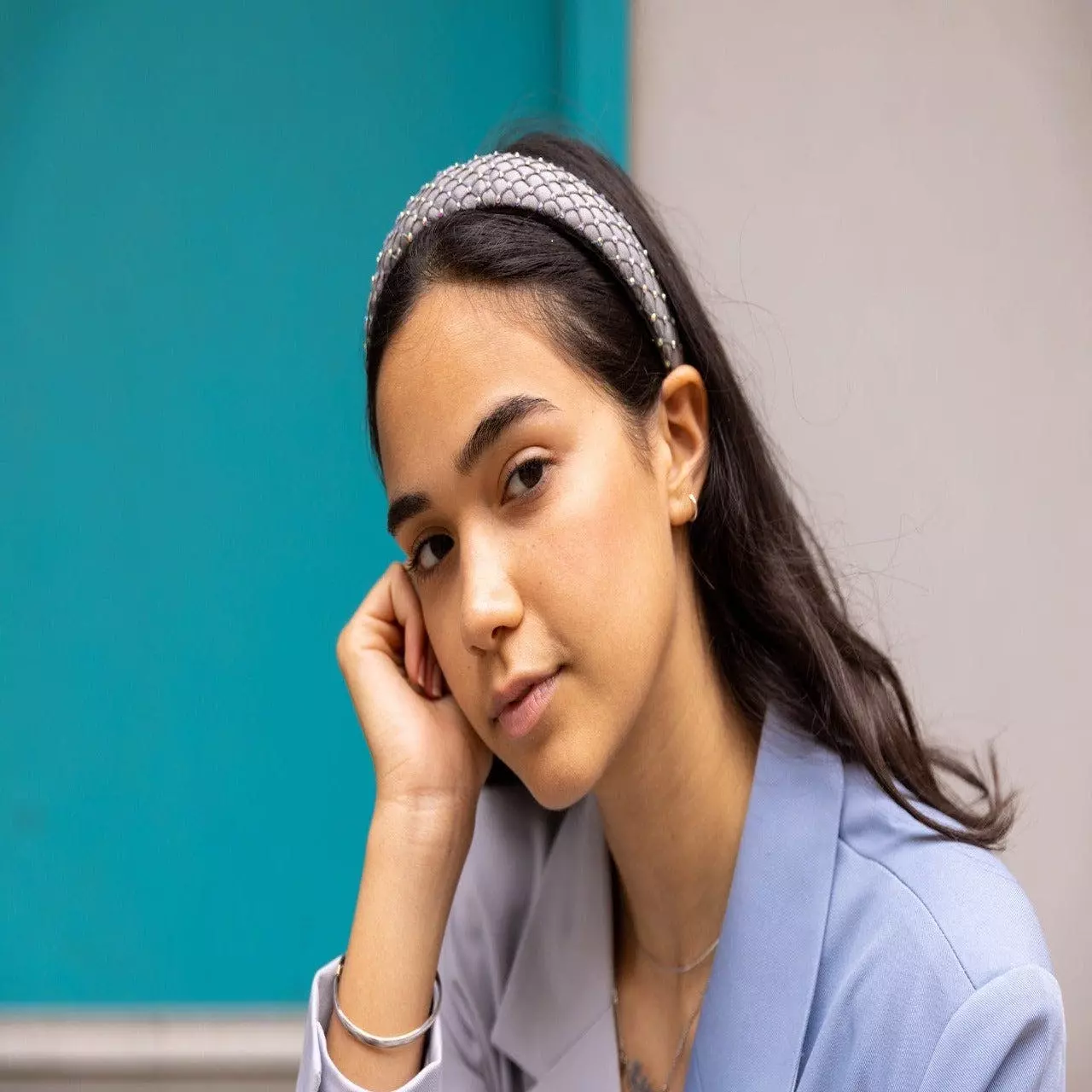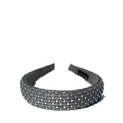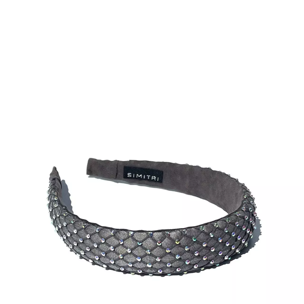 – Crystals on grey mesh fabric headband with soft velvet on the back- Sits very lightly on the head- Matches our grey fishnet clutch