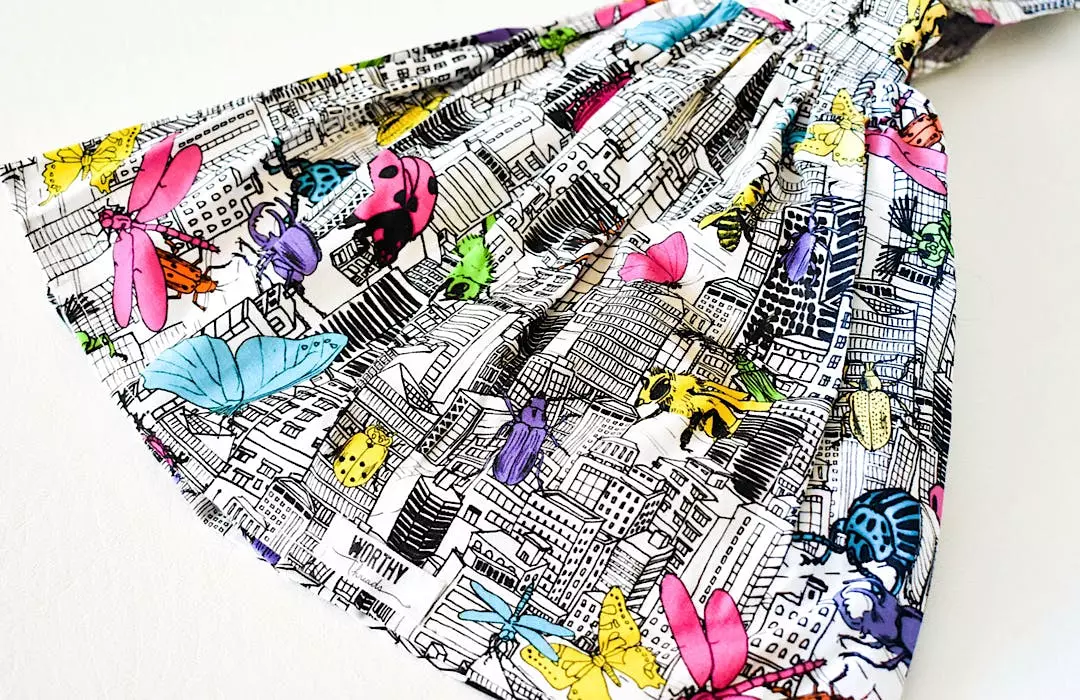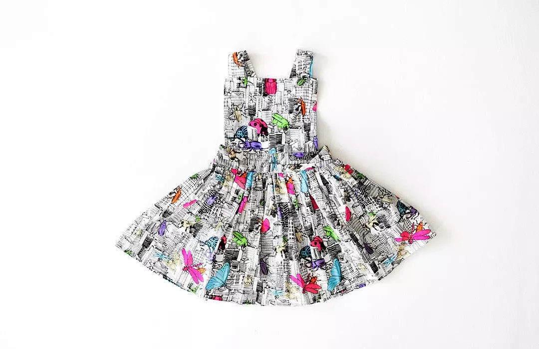 Our bestselling girls pinafore dress featuring bugs invading the city! This closet staple is perfect year round. Add a cardigan and tights for a stylish winter look.